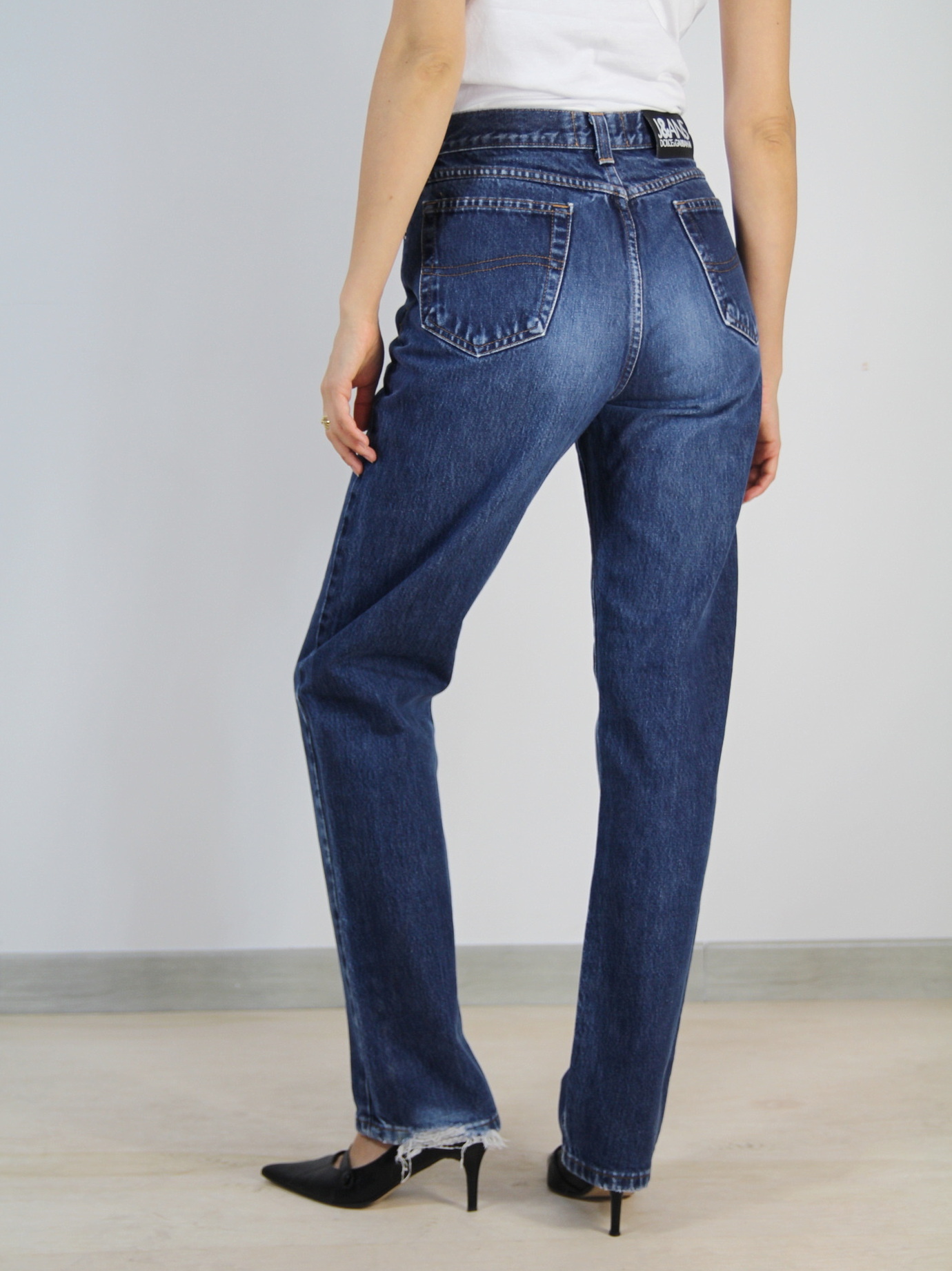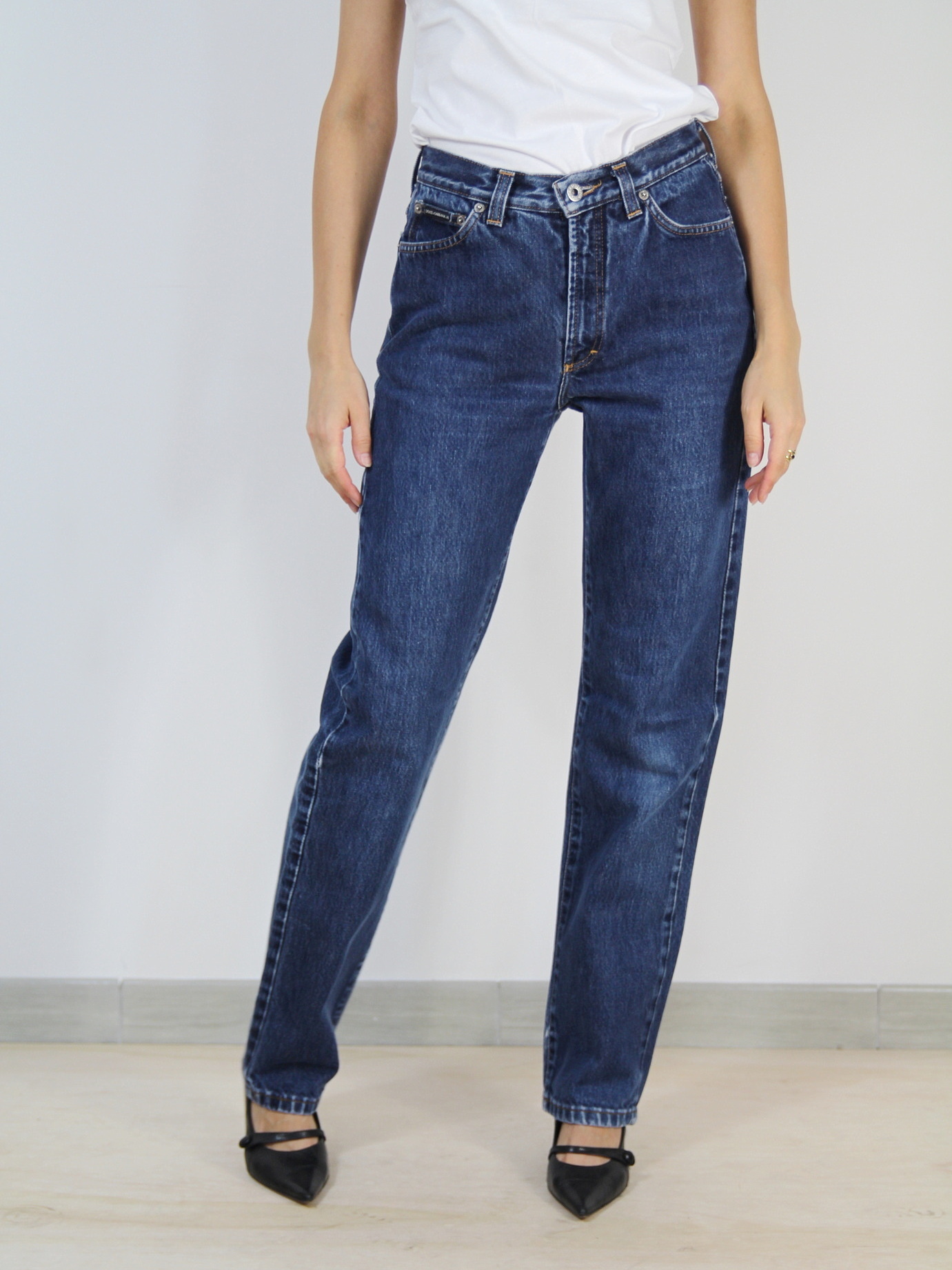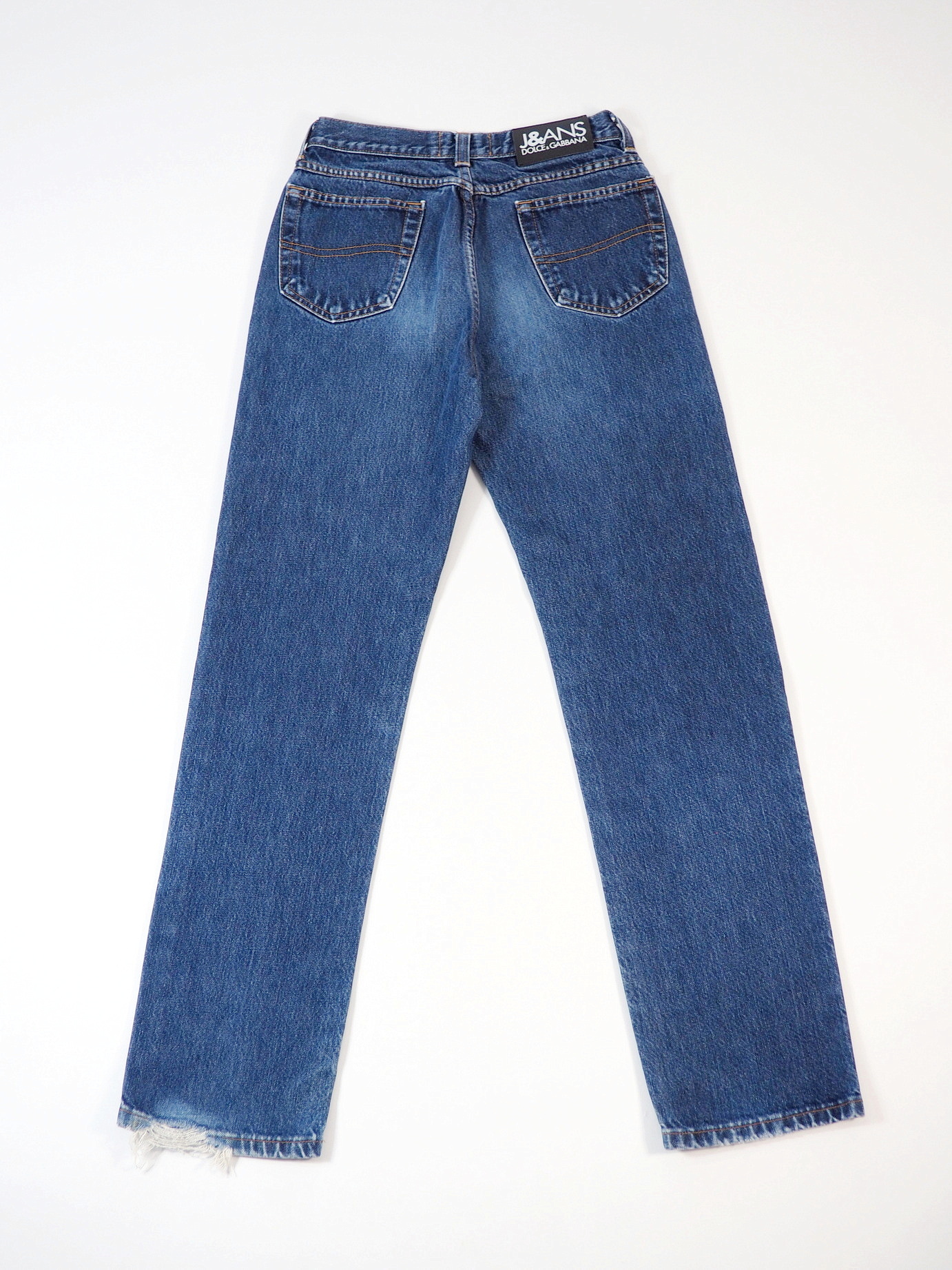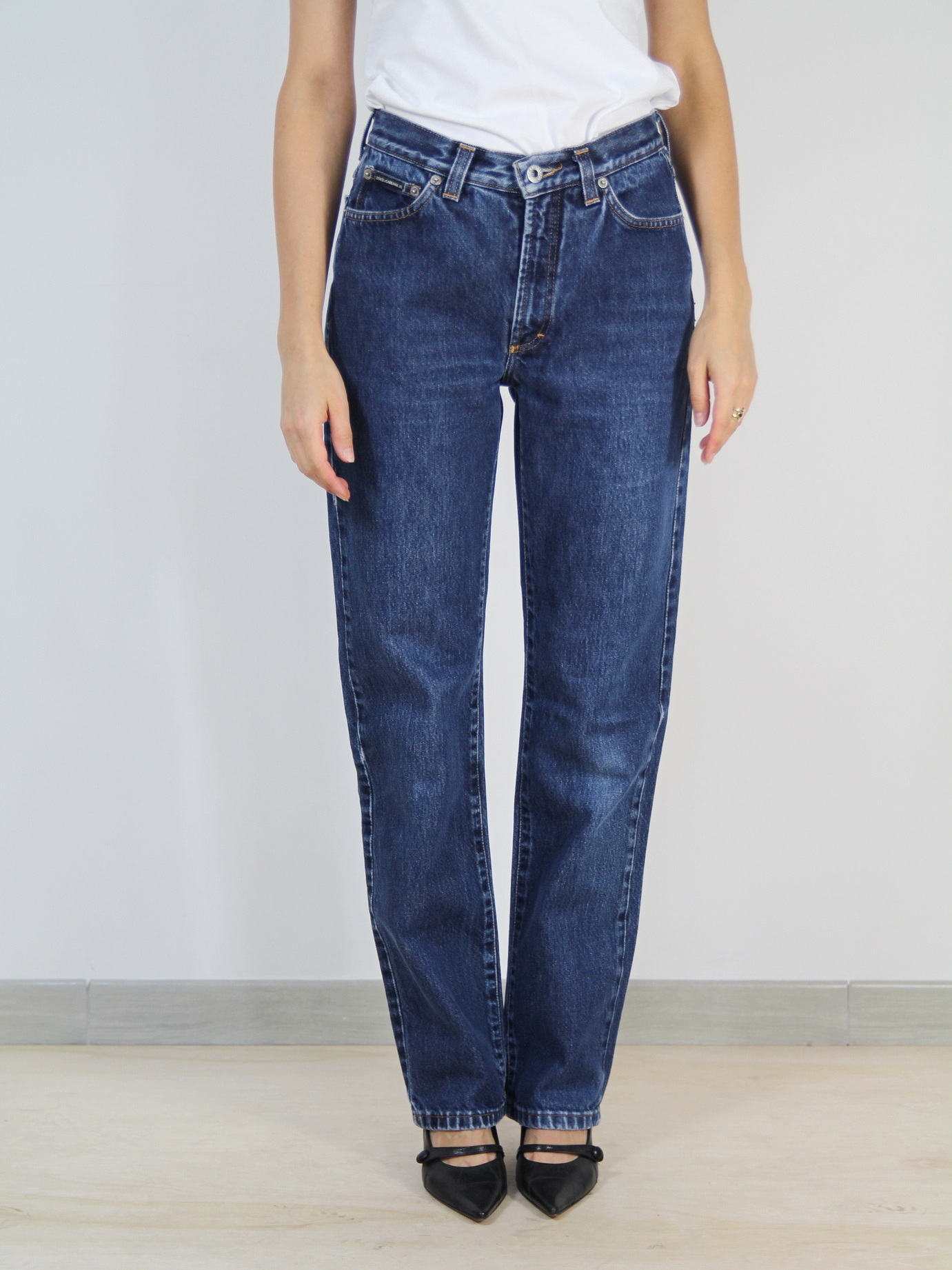 Jeans D&G, vintage cu talie inalta si croi drept. Denim albastru intens, usor decolorat natural, specific perioadei. Detalii autentice Dolce & Gabbana – logo pe buzunar si eticheta originala. Uzura subtila pe margini.