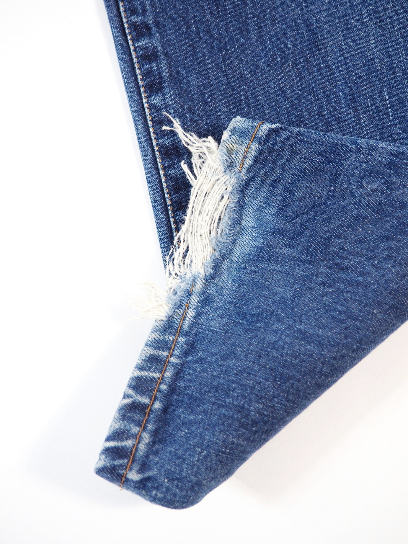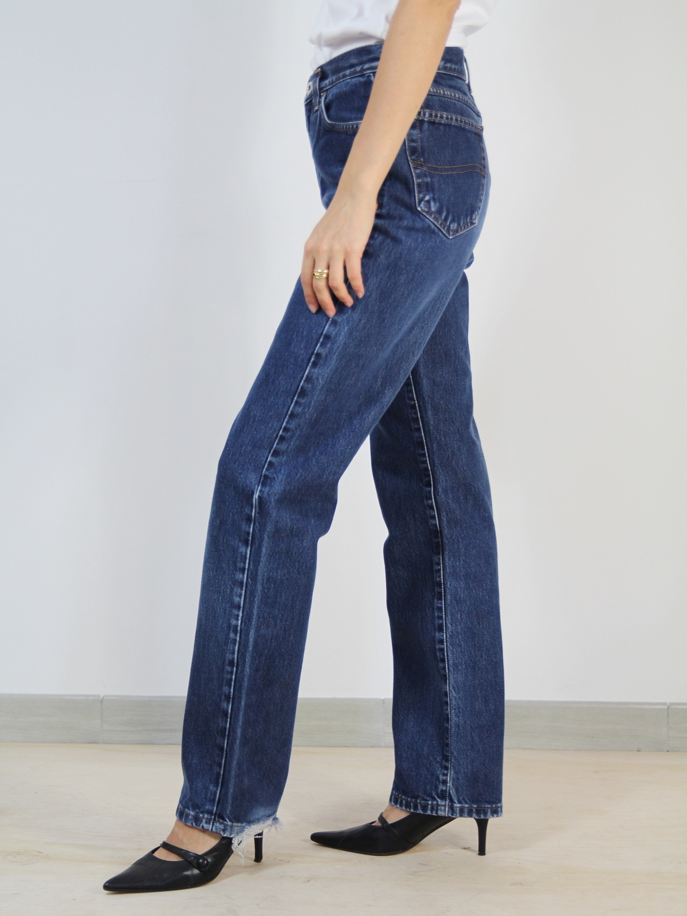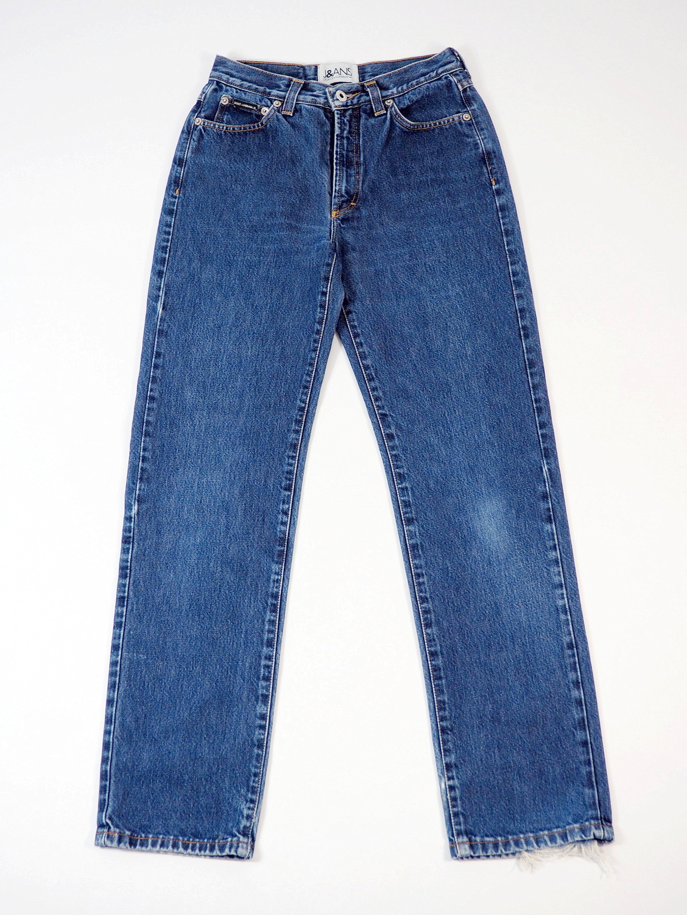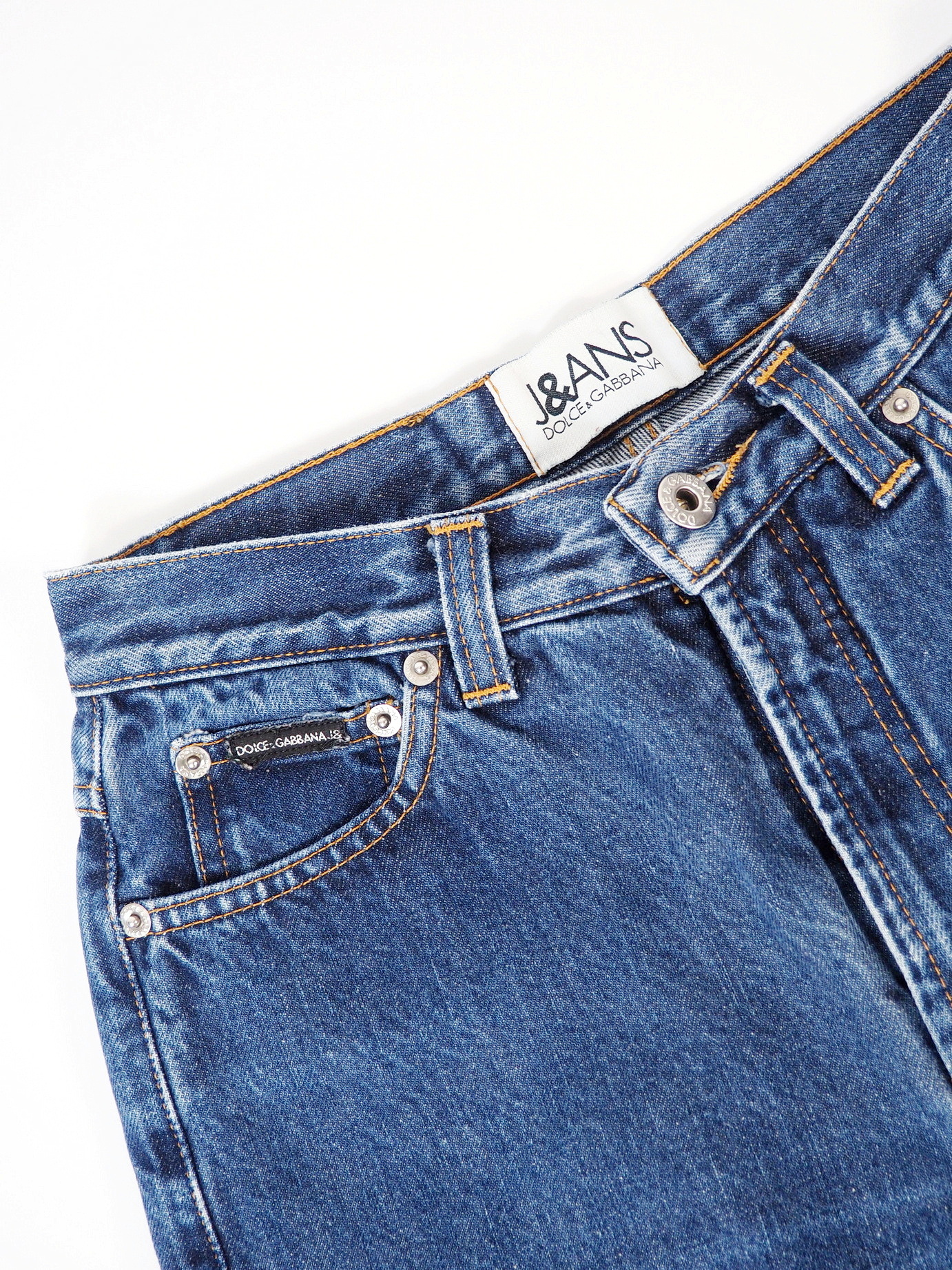 Jeans D&G, vintage cu talie inalta si croi drept. Denim albastru intens, usor decolorat natural, specific perioadei. Detalii autentice Dolce & Gabbana – logo pe buzunar si eticheta originala. Uzura subtila pe margini.