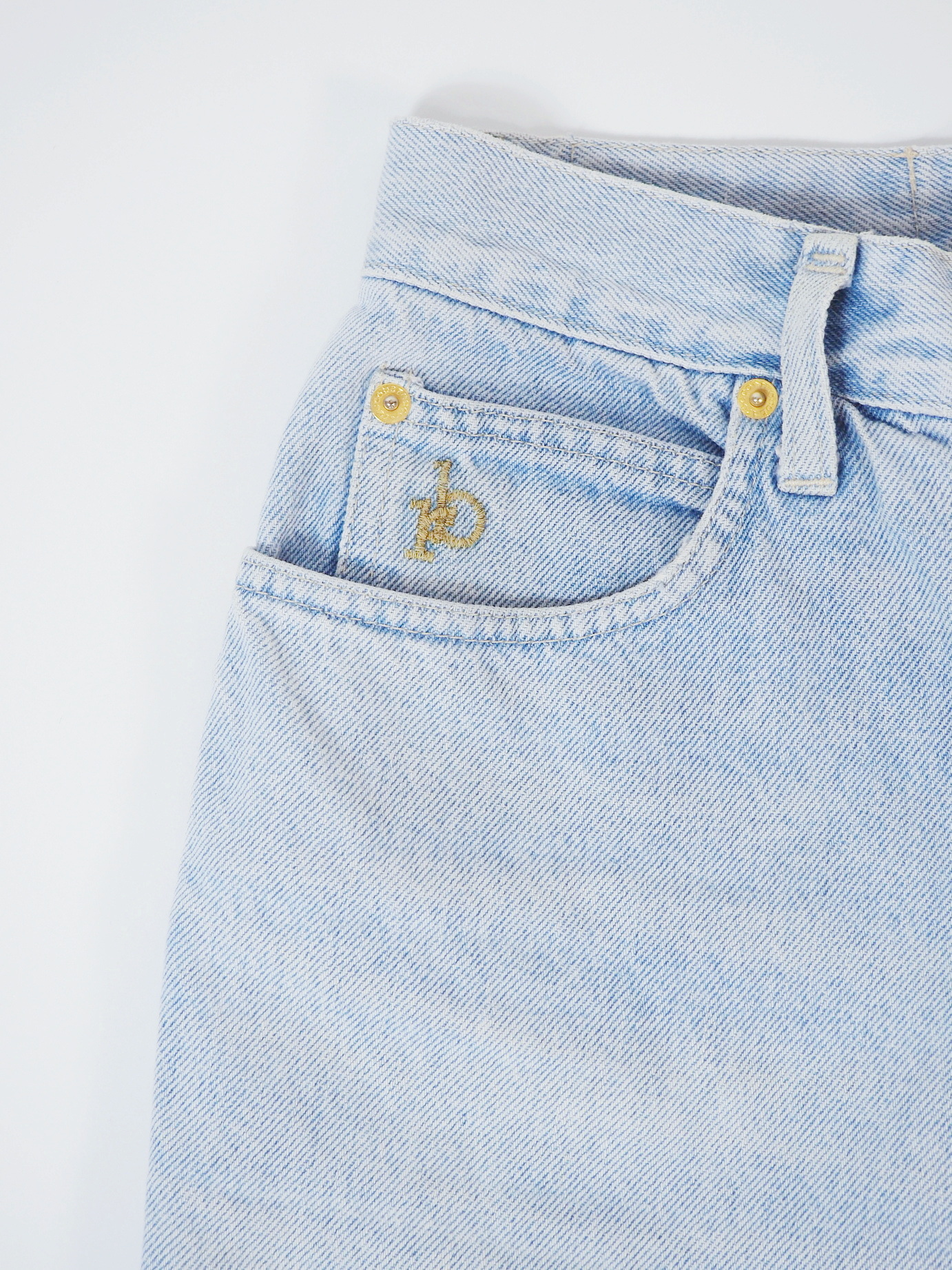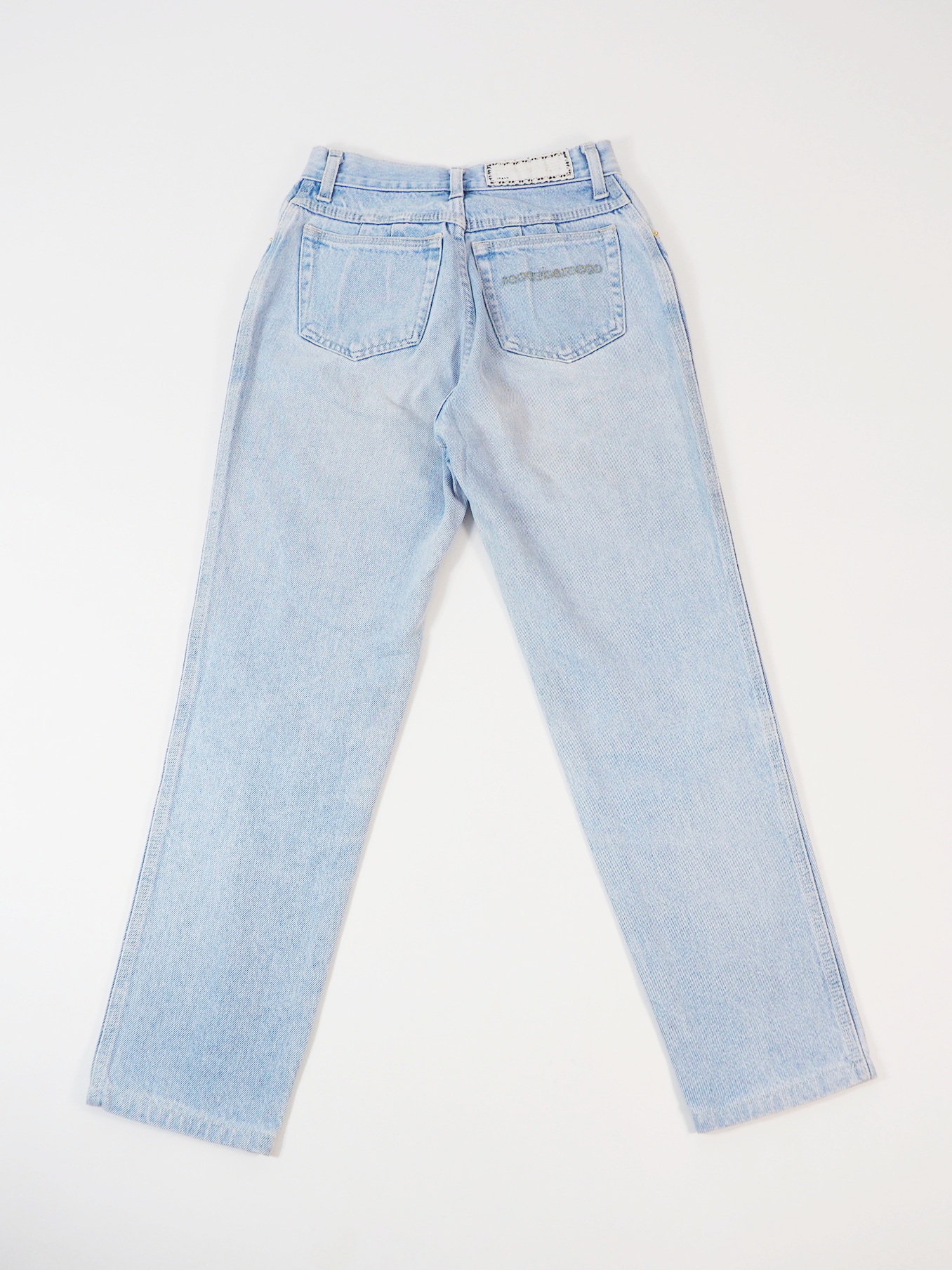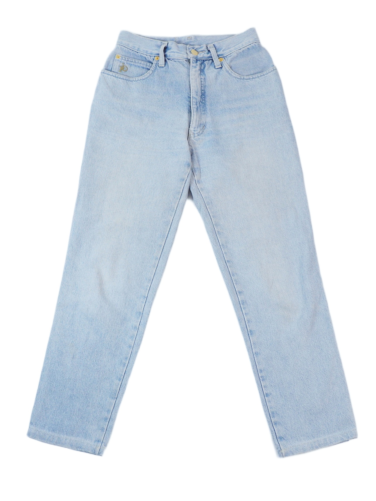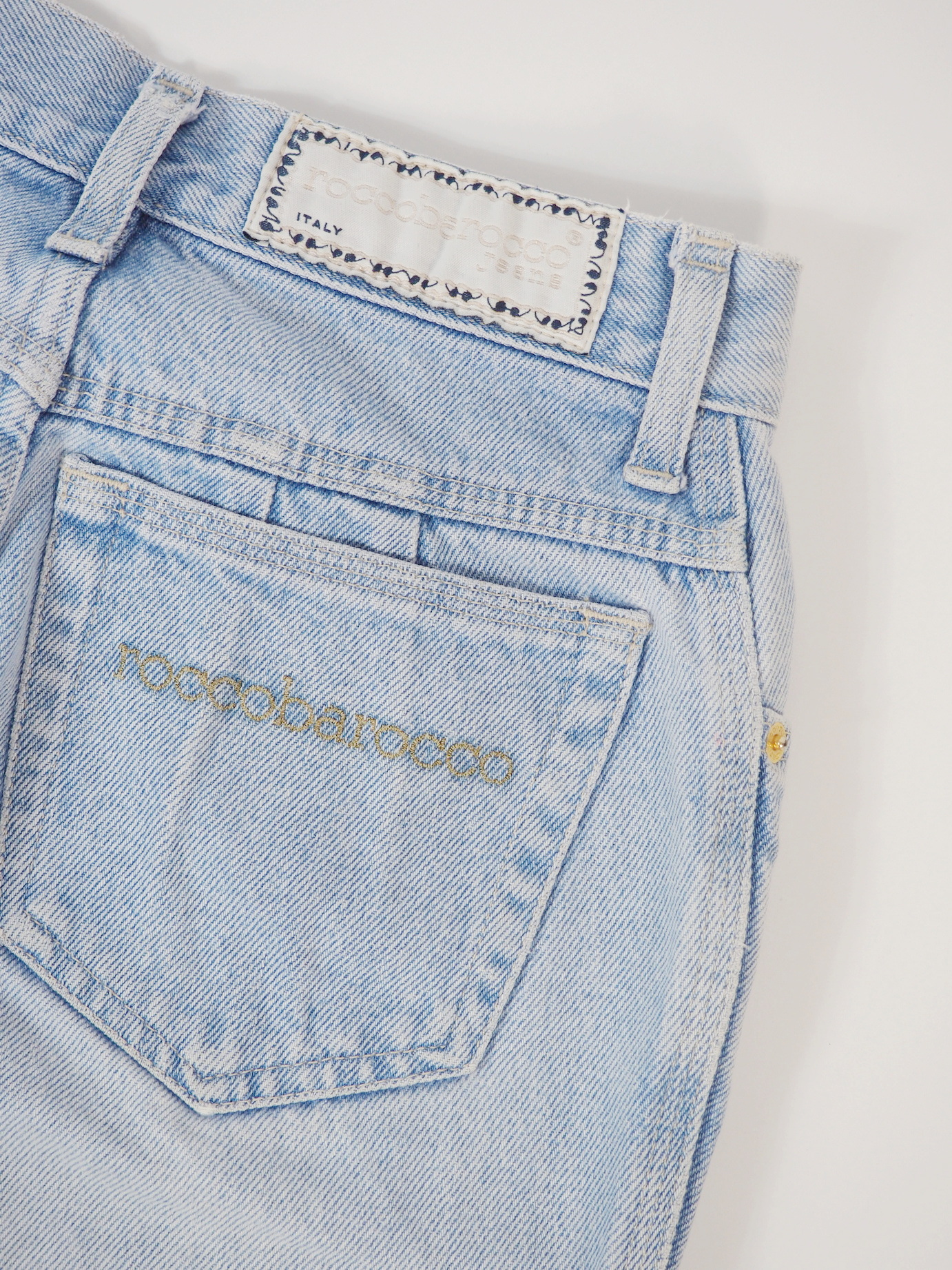 Jeansi vintage Roccobarocco, fabricati in Italia, denim albastru deschis cu croi drept si talie inalta. Design clasic cu buzunare aplicate, detaliu brodat cu logo pe buzunarul din spate si elemente metalice aurii.