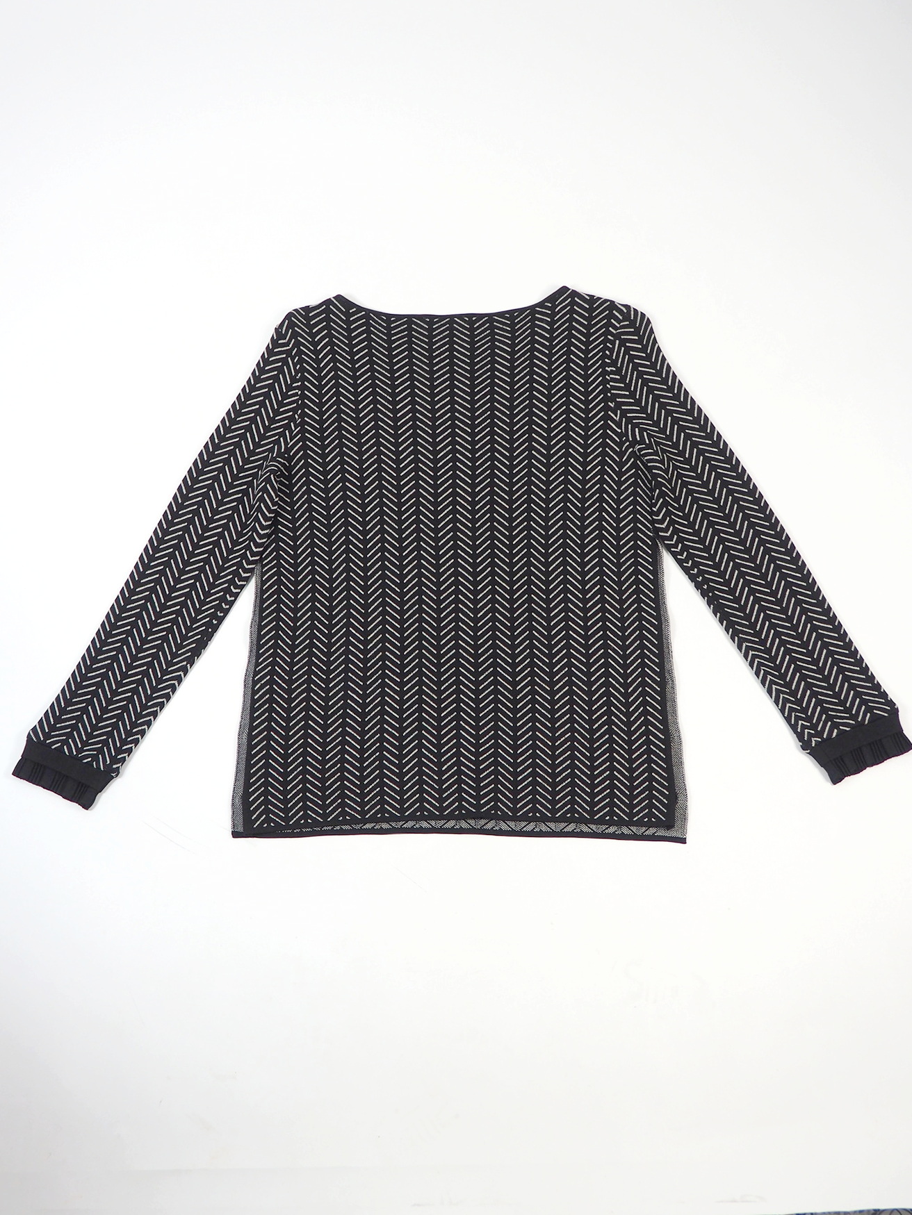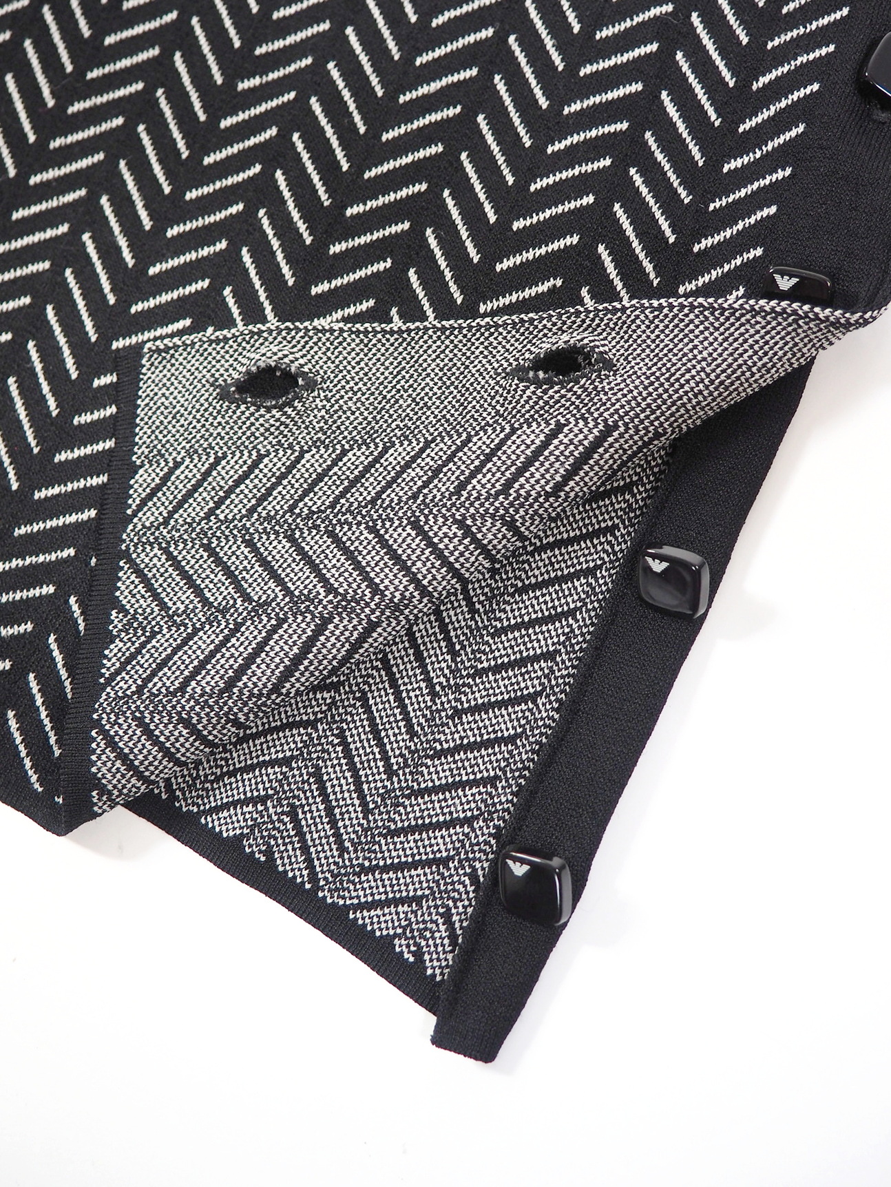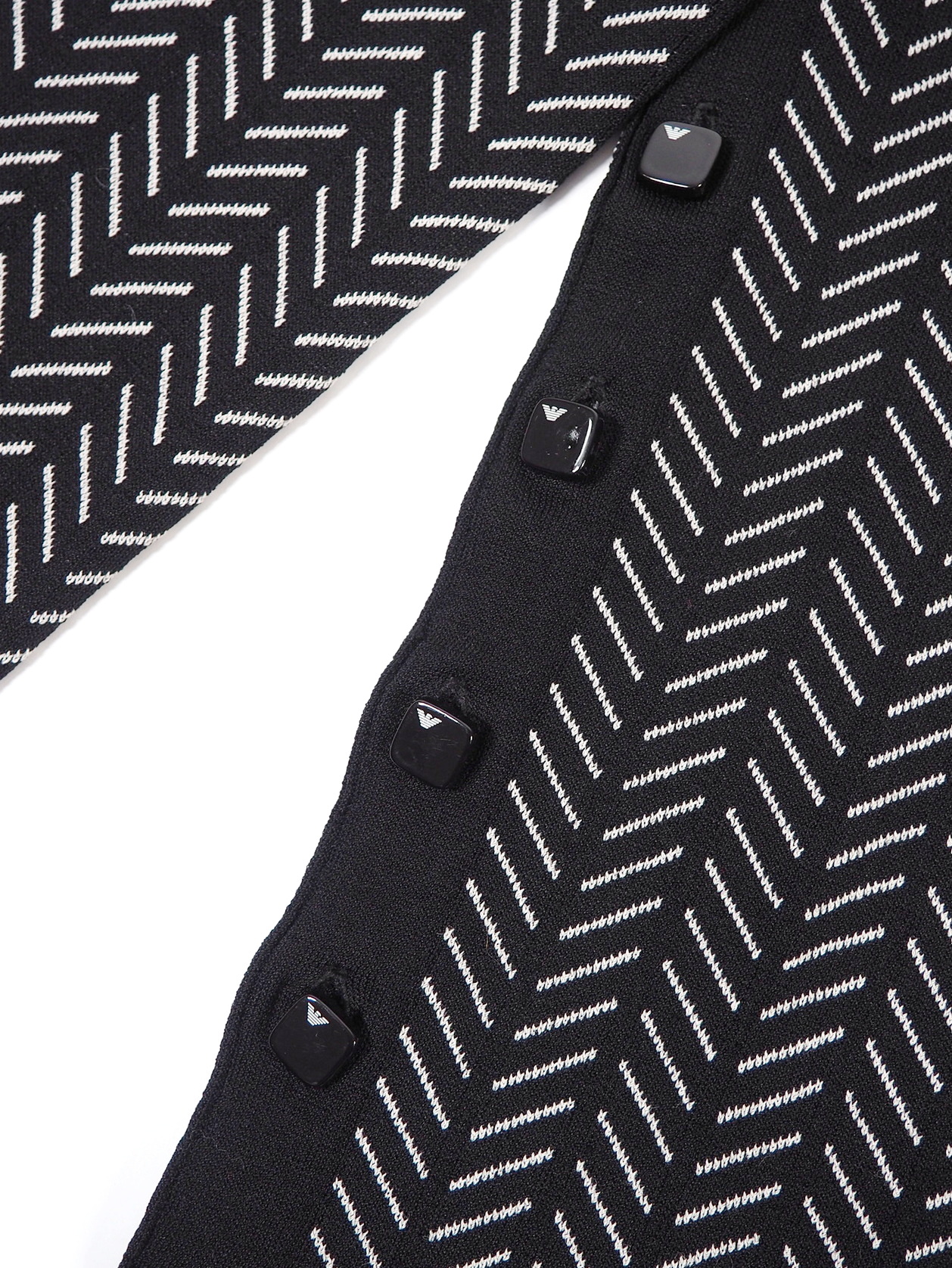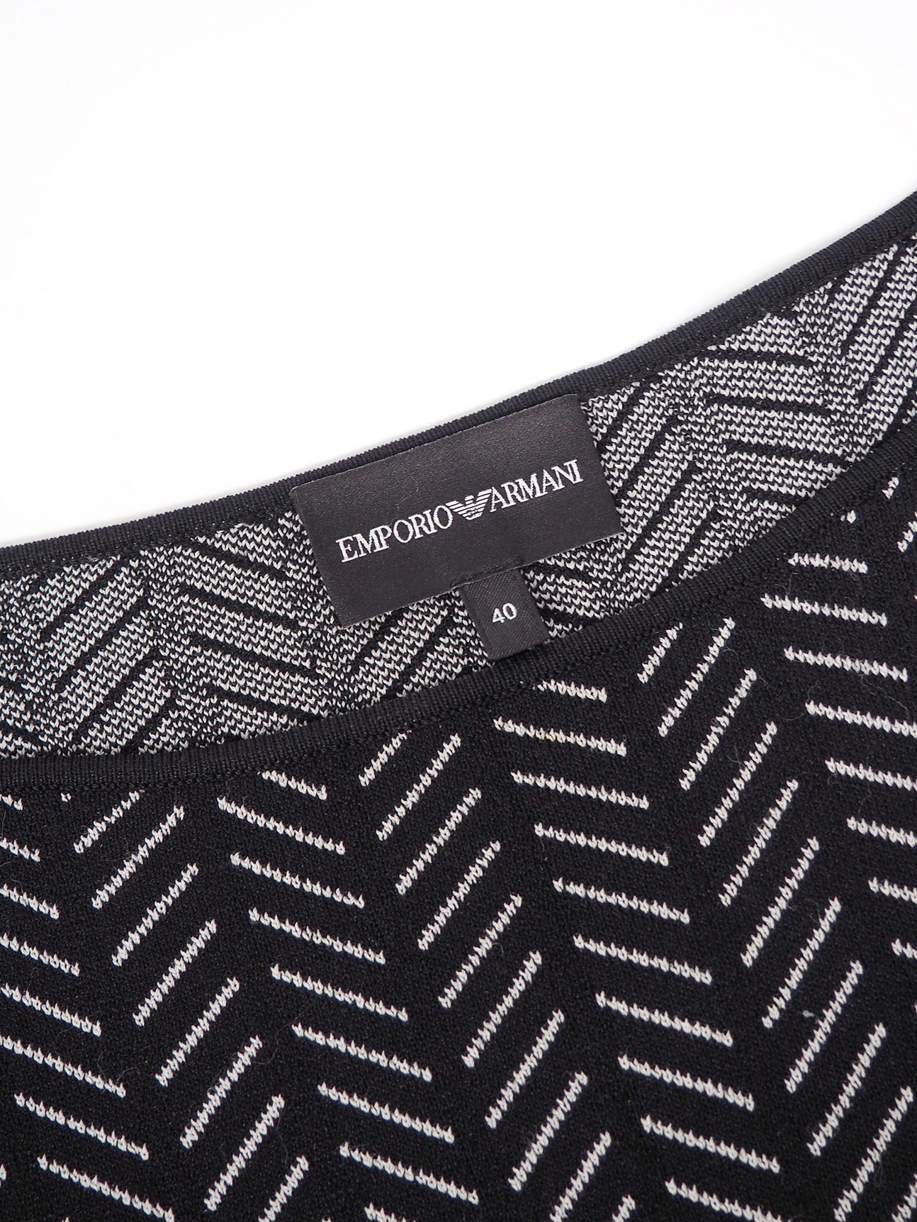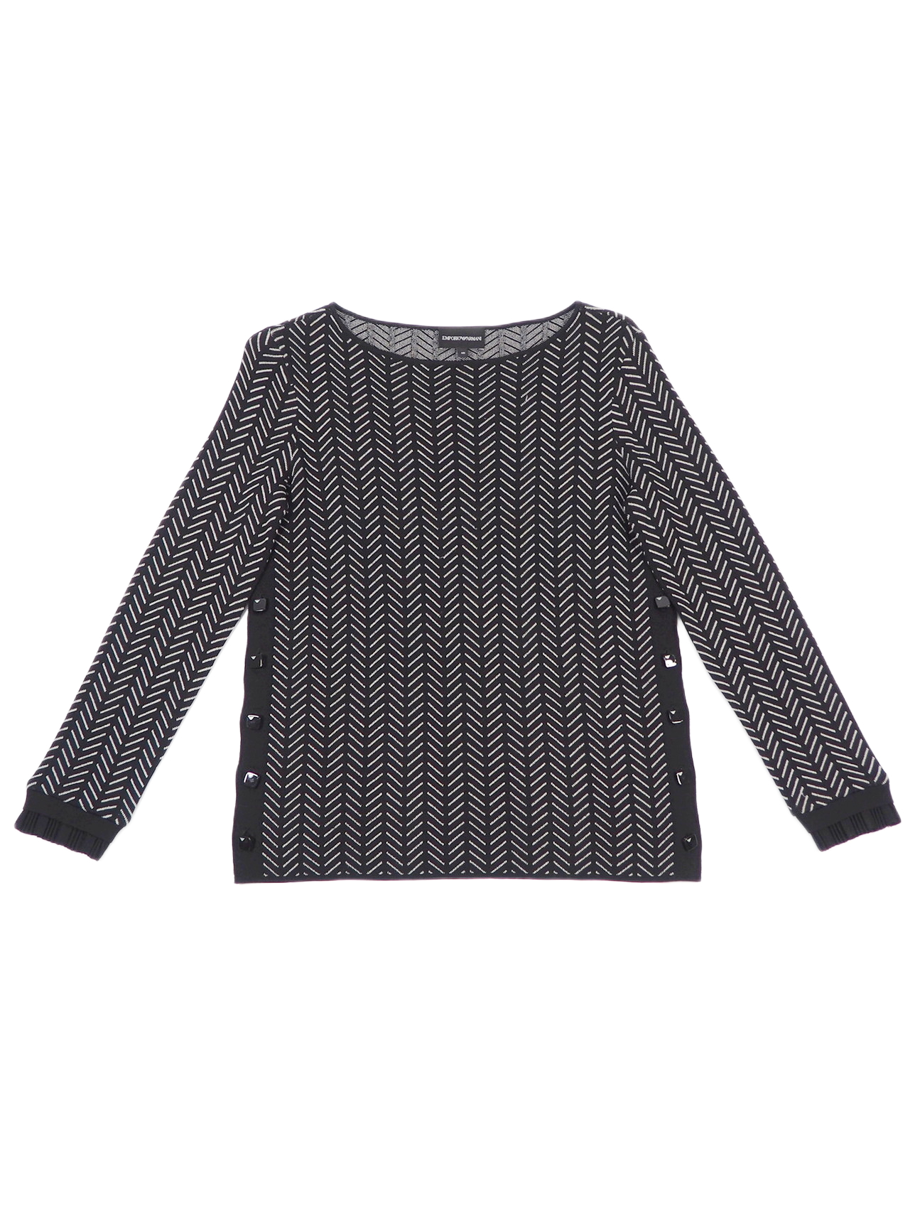 Bluza Emporio Armani pre-loved, din tricot fin, cu imprimeu grafic alb-negru dispus in model herringbone. Croiala dreapta, decolteu rotund, volane la mansete si detaliu lateral cu nasturi negri lacuiti, gravati discret cu logo-ul brandului. Impecabila.