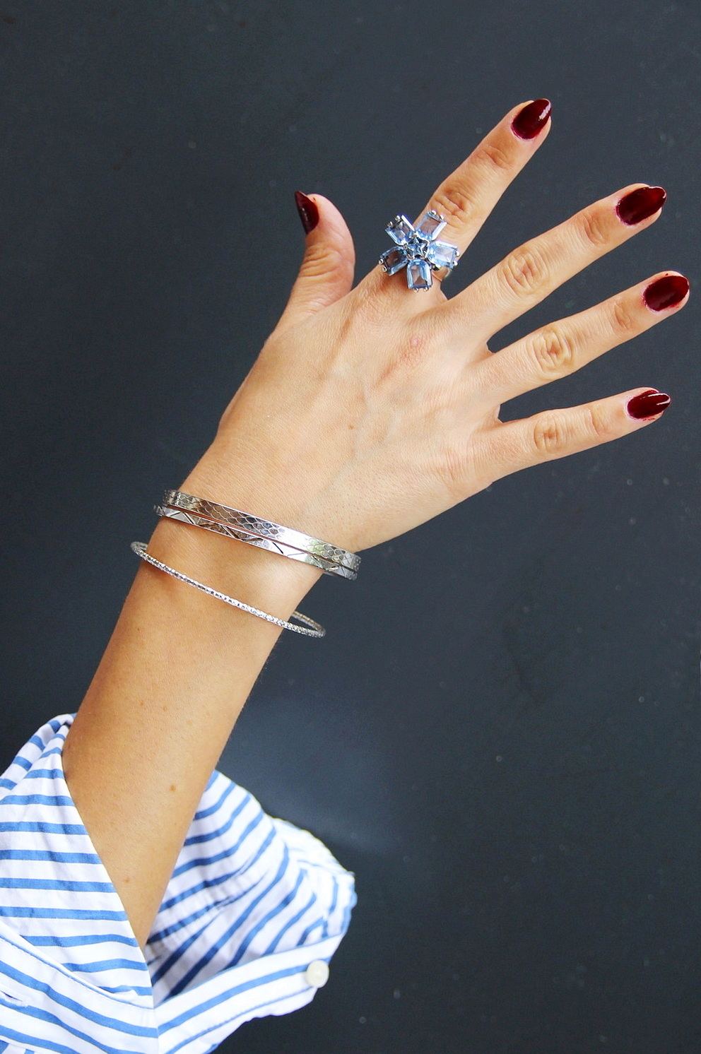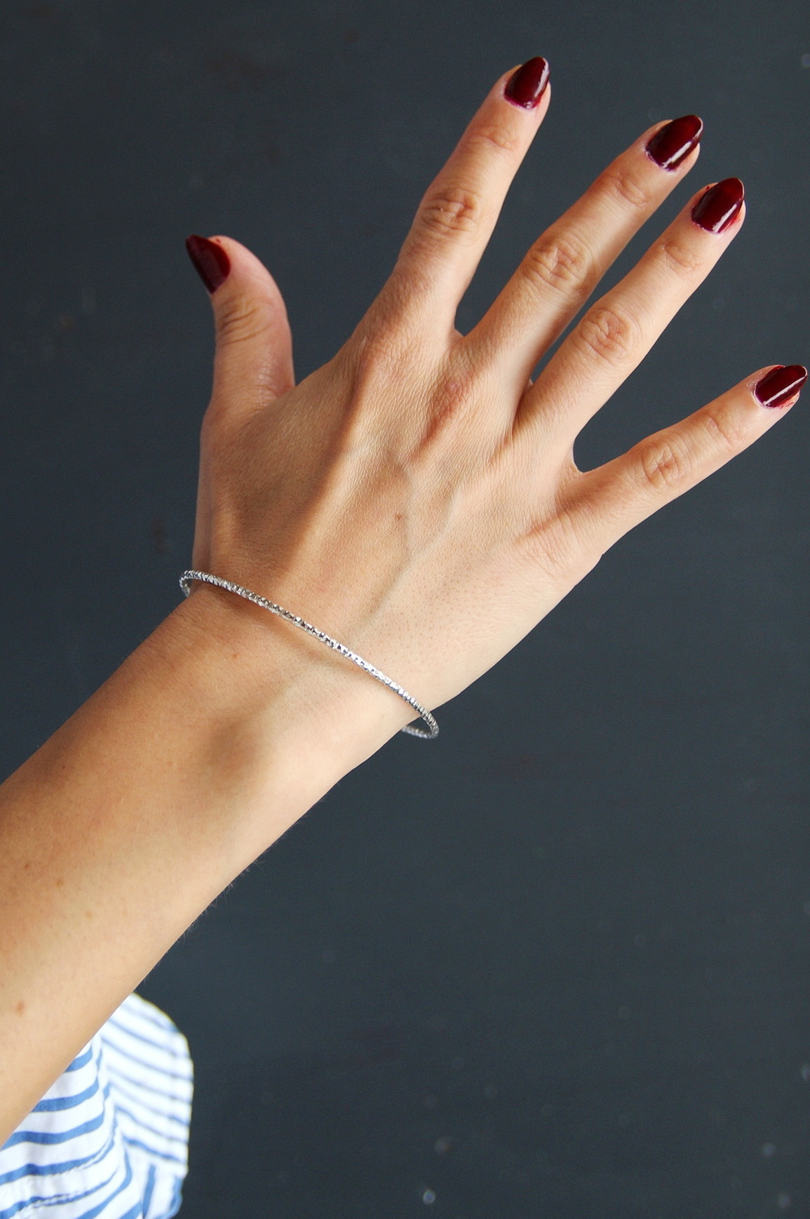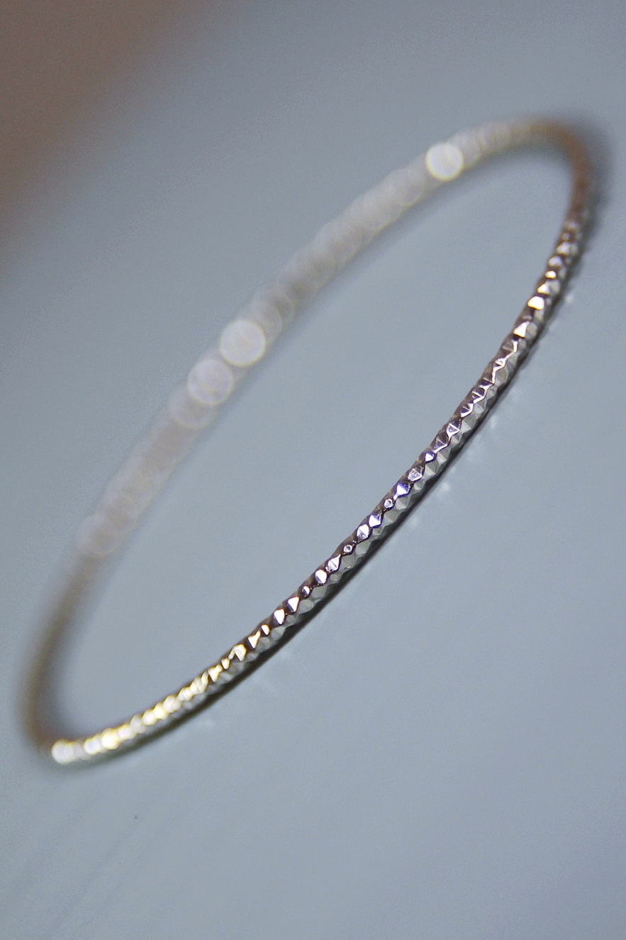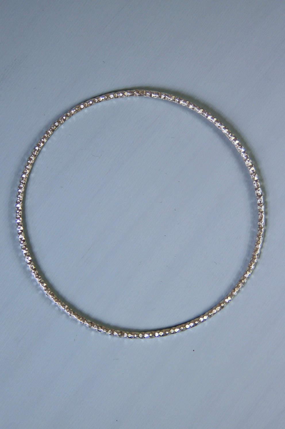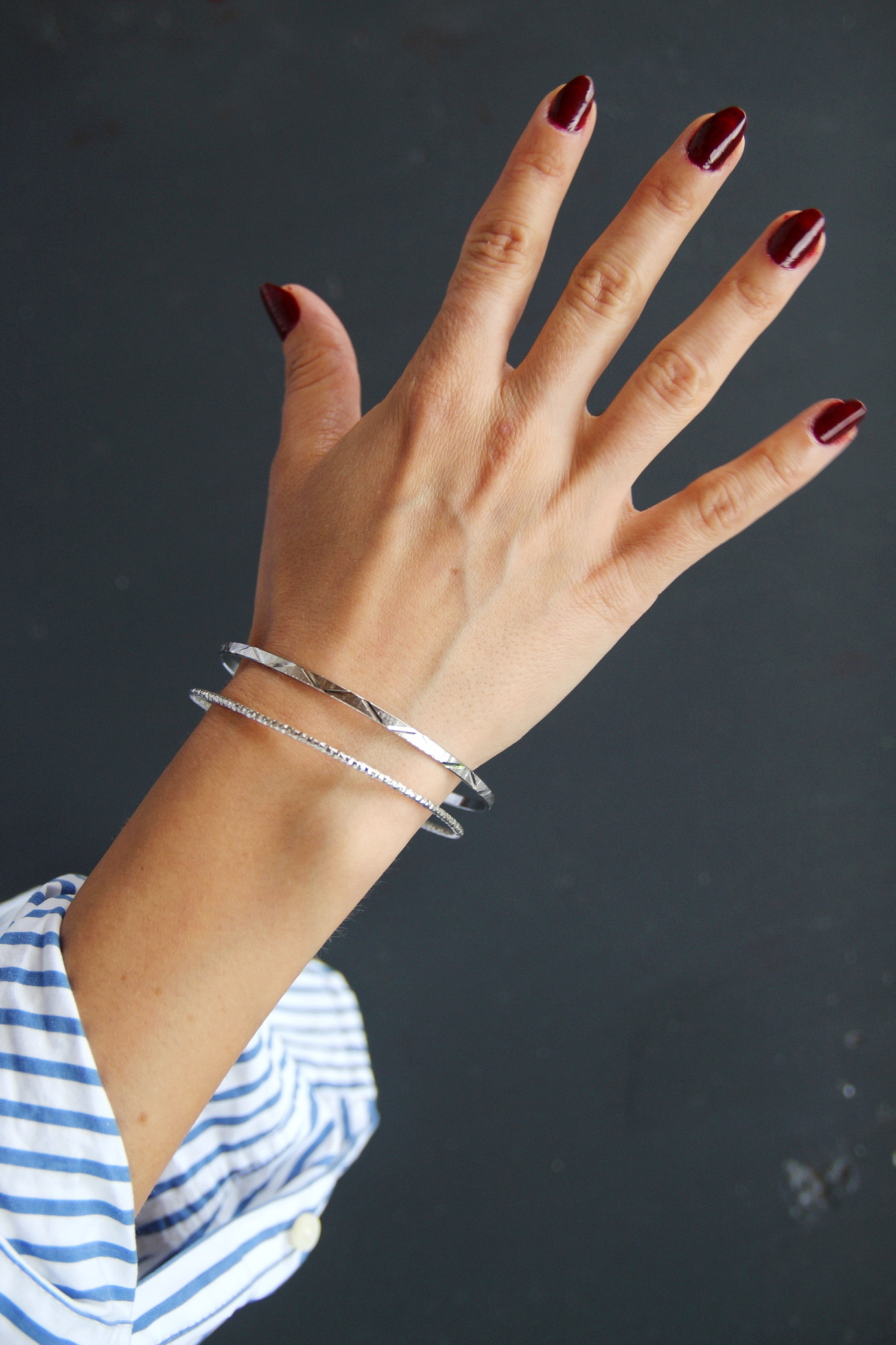 Bratara fixa, subtire, din argint, cu textura în relief si detalii organice care capteaza lumina subtil. De purtat ca piesa solitara, sau in layering. Potrivita pentru o incheietura lata.