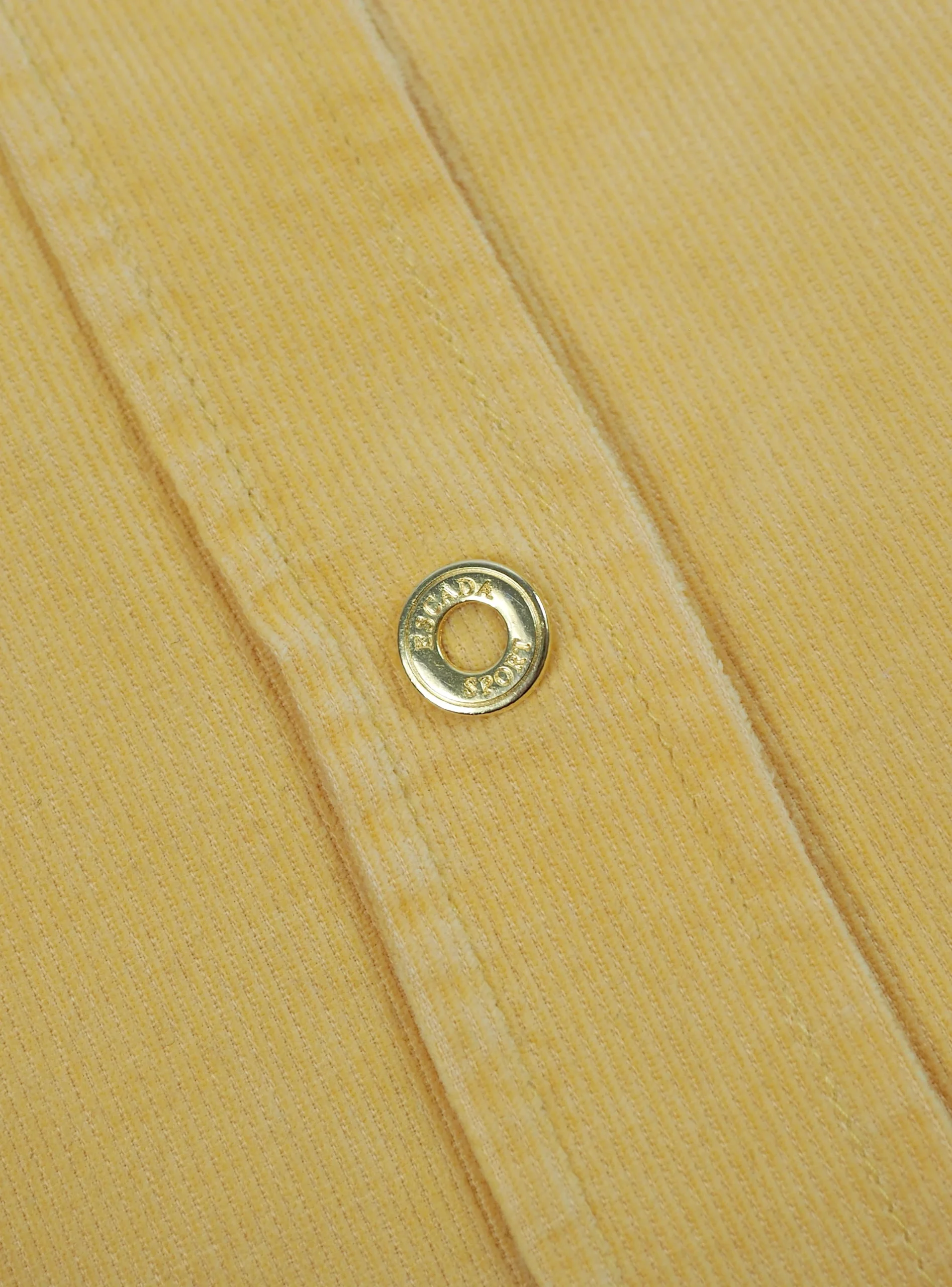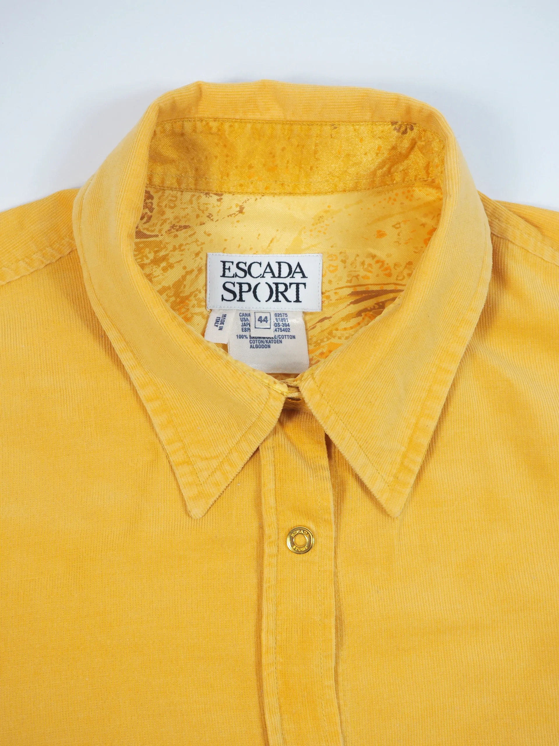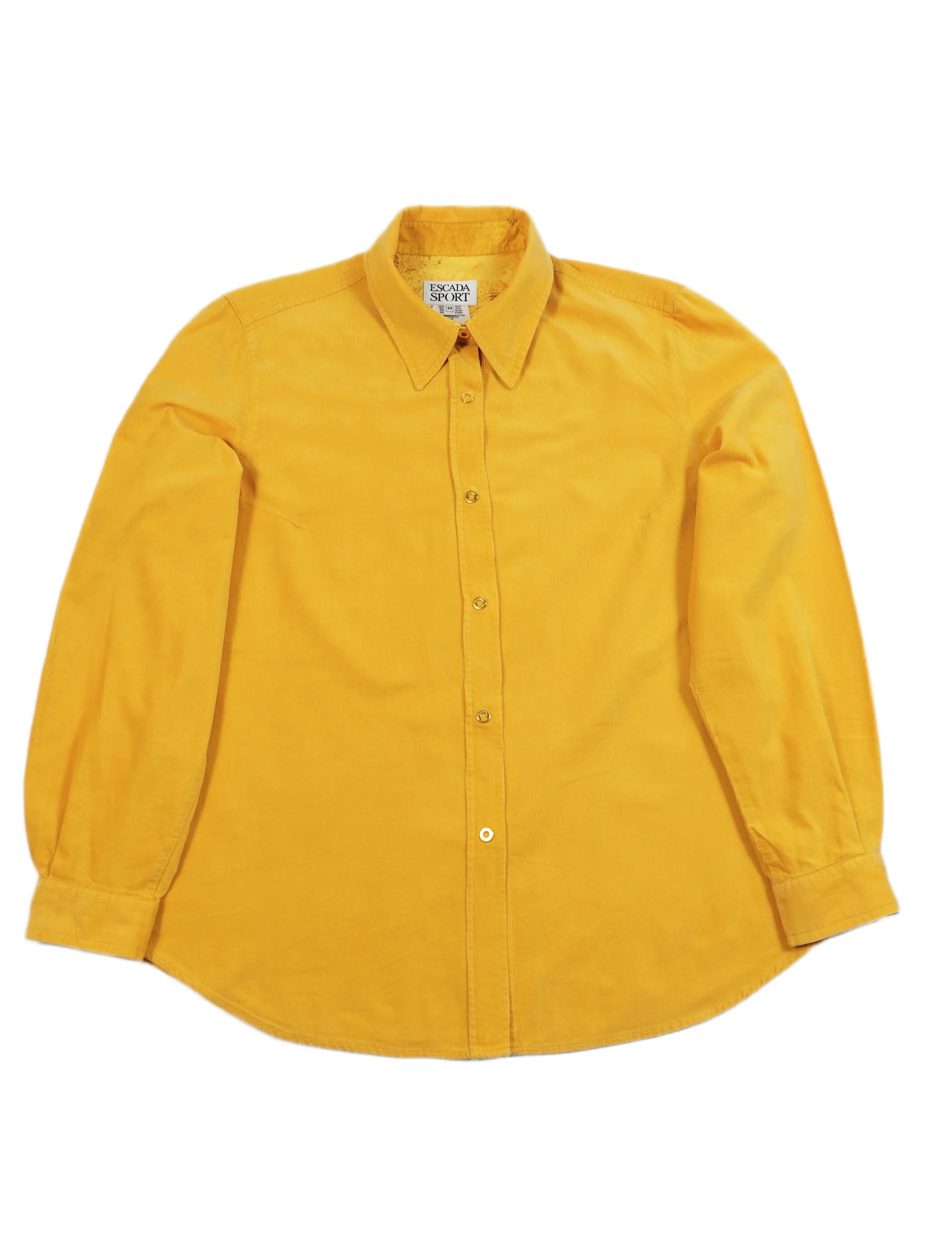 Camasa vintage Escada din reiat, intr-o nuanta vibranta de galben solar, croi usor cambrat cu maneca lunga si mansete clasice, guler structurat si inchidere frontala cu capse metalice aurii gravate Escada Sport, interior cu detalii printate discrete, piesa statement , cu aer sporty-lux si influente casual rafinate.