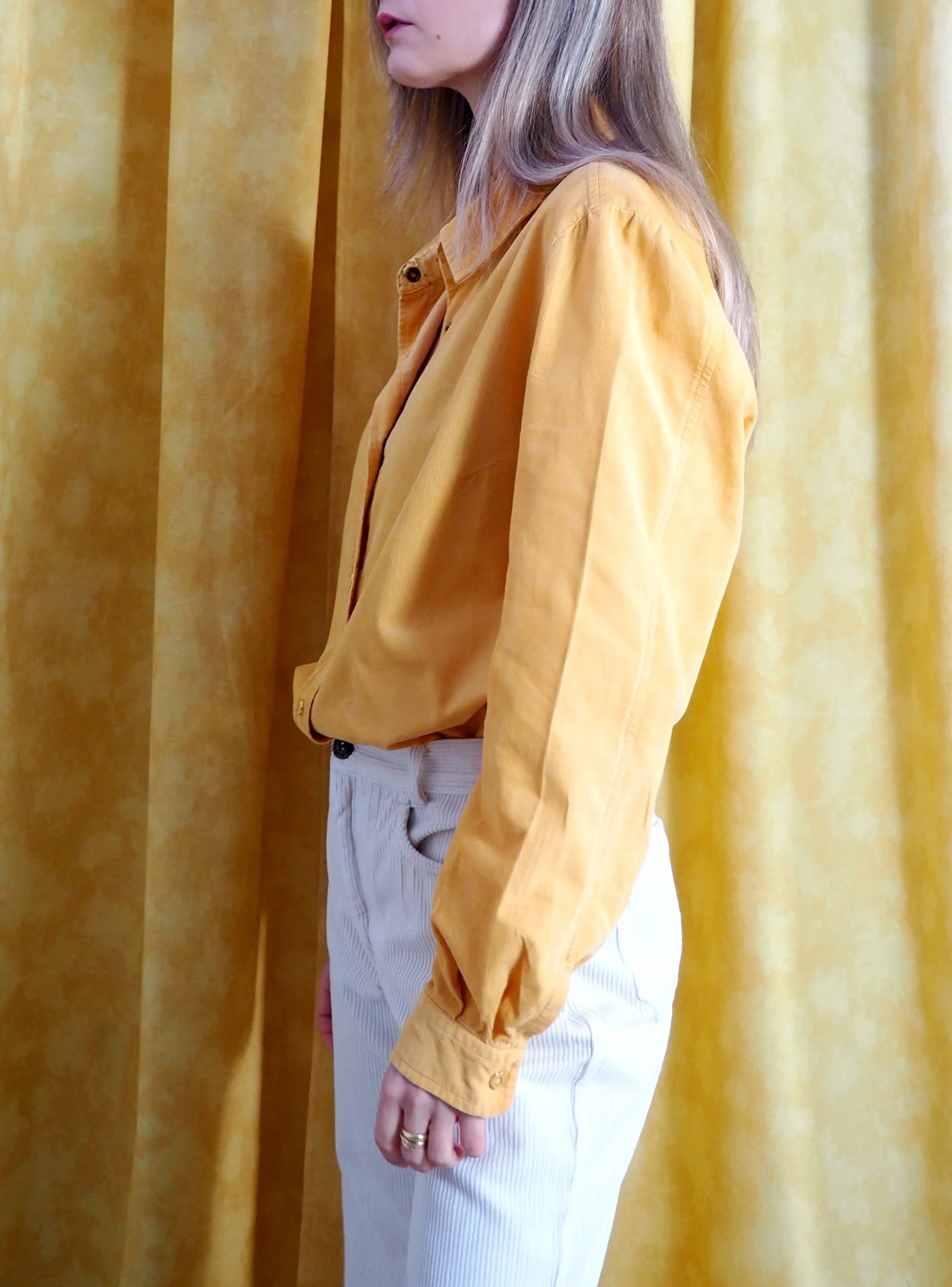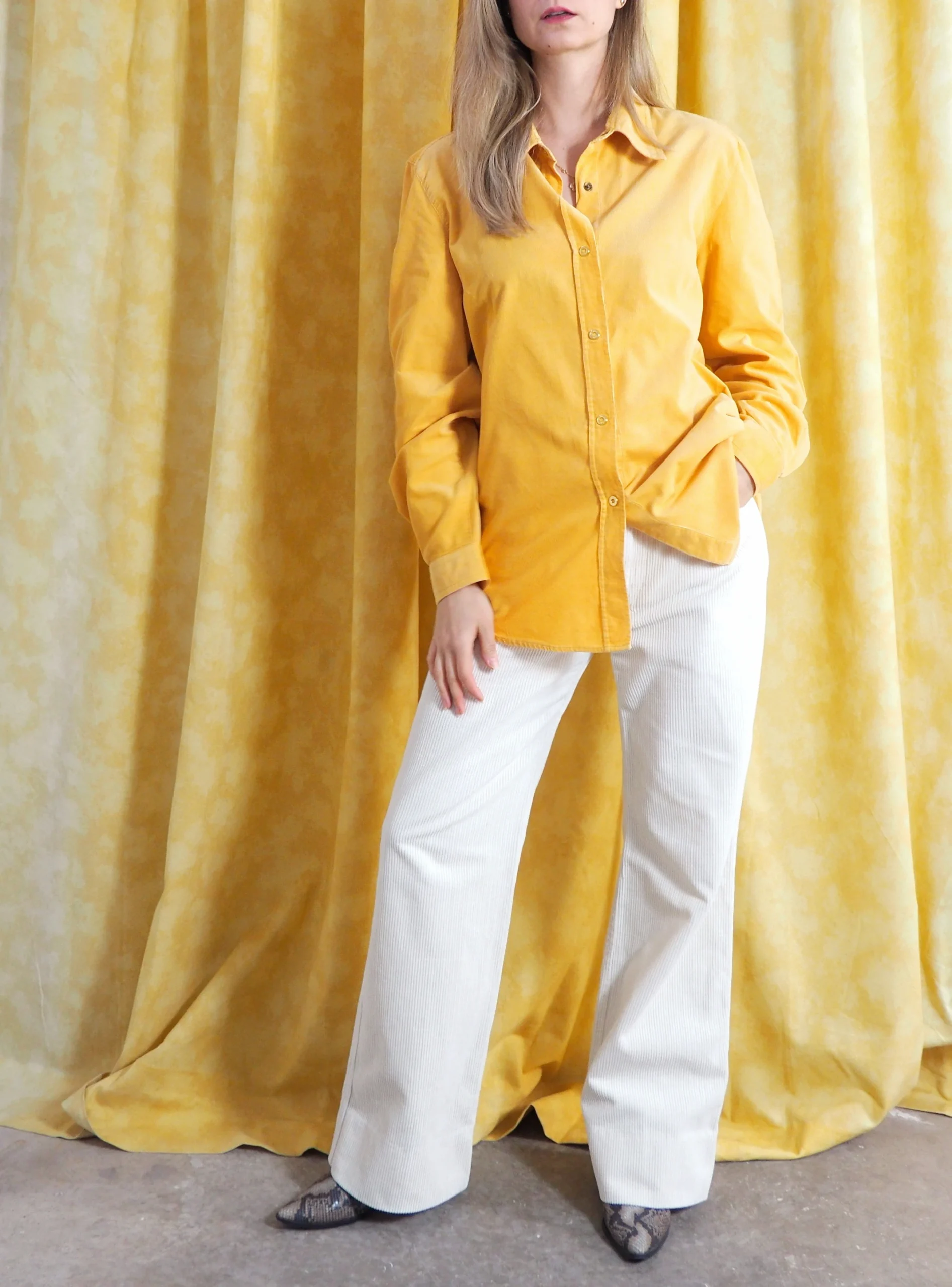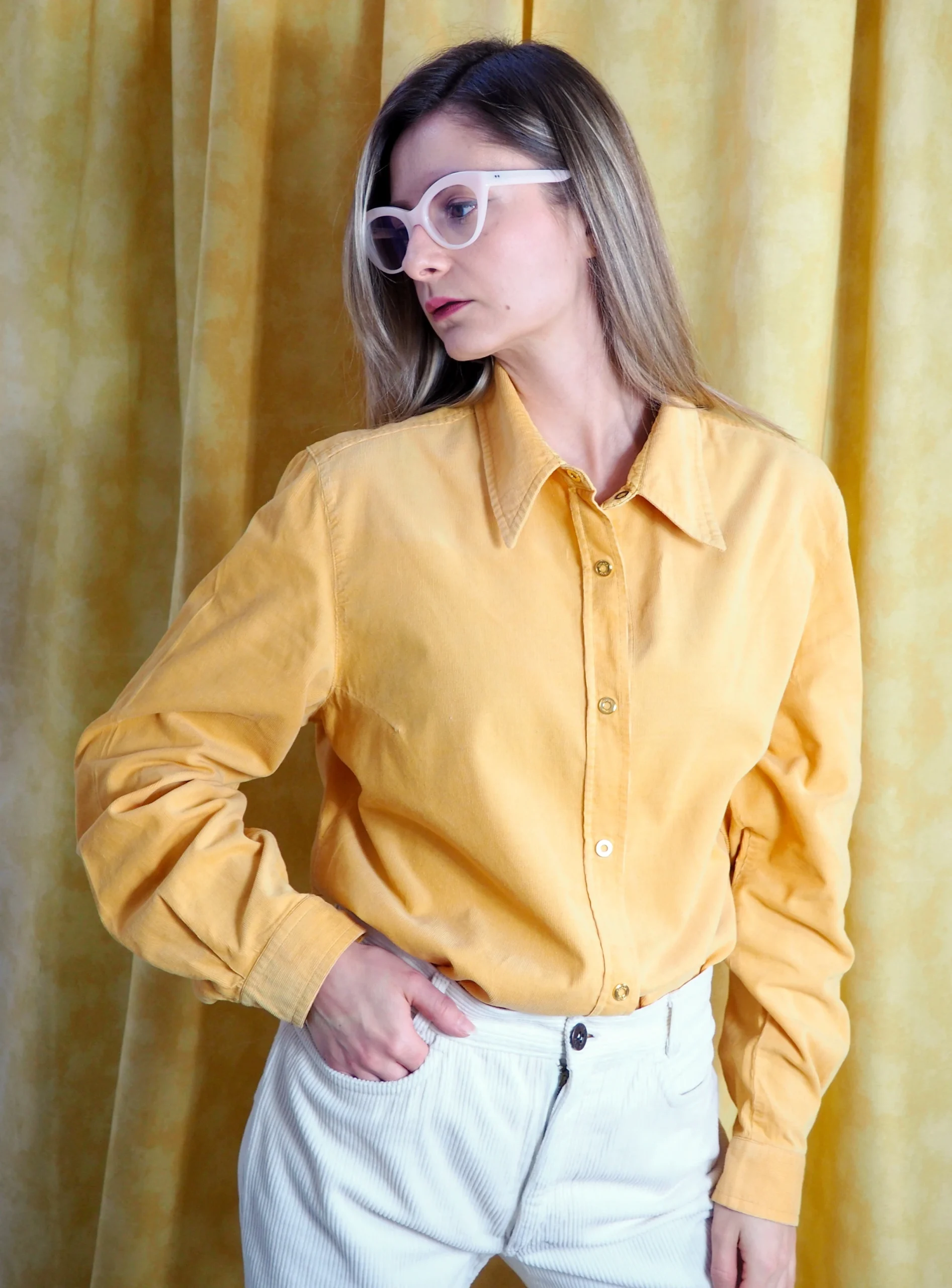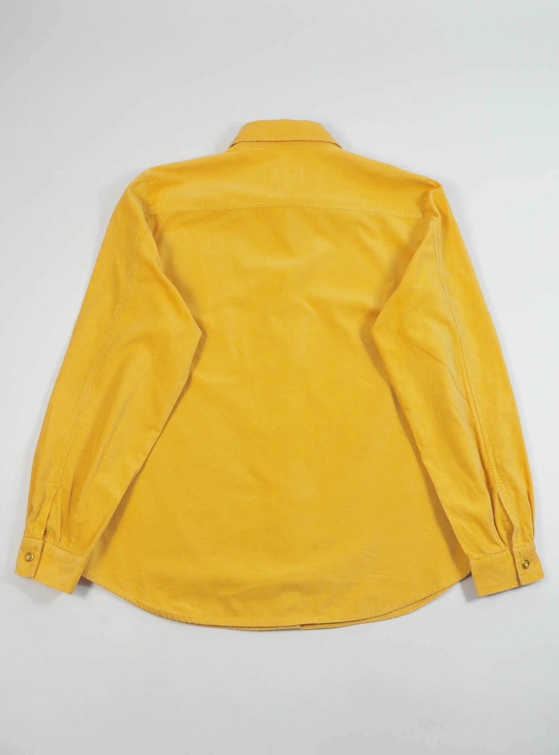 Camasa vintage Escada din reiat, intr-o nuanta vibranta de galben solar, croi usor cambrat cu maneca lunga si mansete clasice, guler structurat si inchidere frontala cu capse metalice aurii gravate Escada Sport, interior cu detalii printate discrete, piesa statement , cu aer sporty-lux si influente casual rafinate.