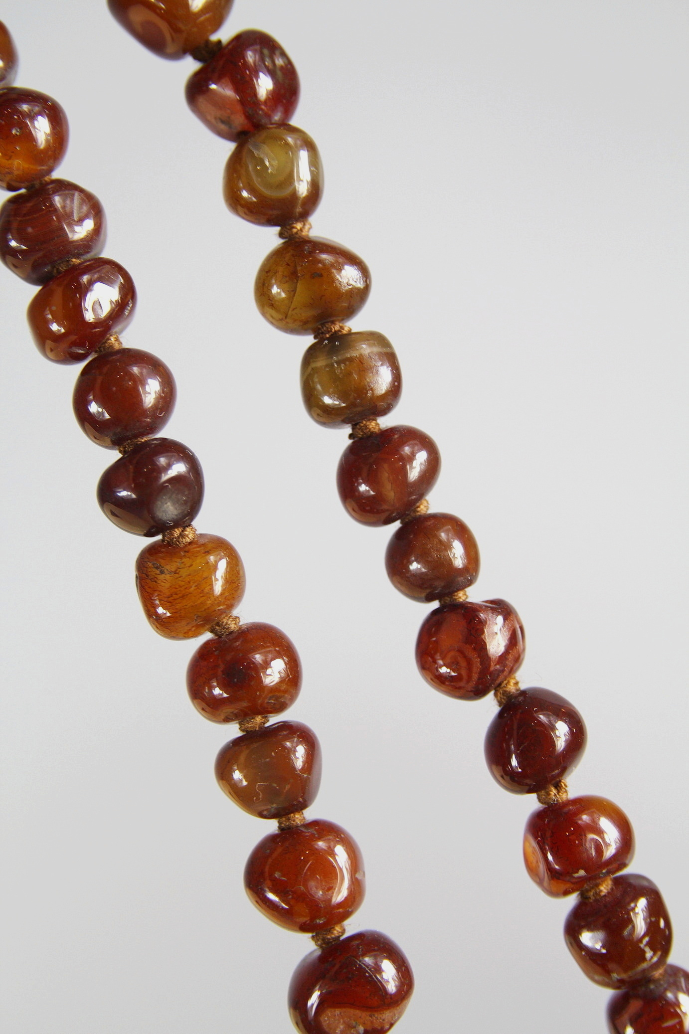 Colier vintage la baza gatului, din agate netede, neregulate, cu tonuri calde de brun, cognac și chihlimbar. Fiecare piatră este unică, cu variații naturale de culoare și transparență. Montat pe fir textil rezistent, cu închizătoare lobster marcată 925, din argint.