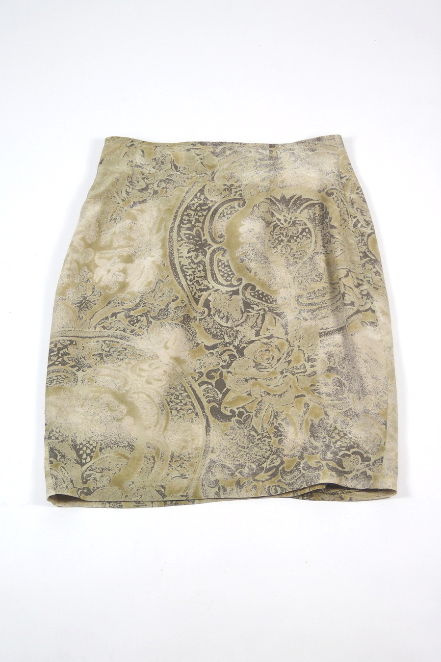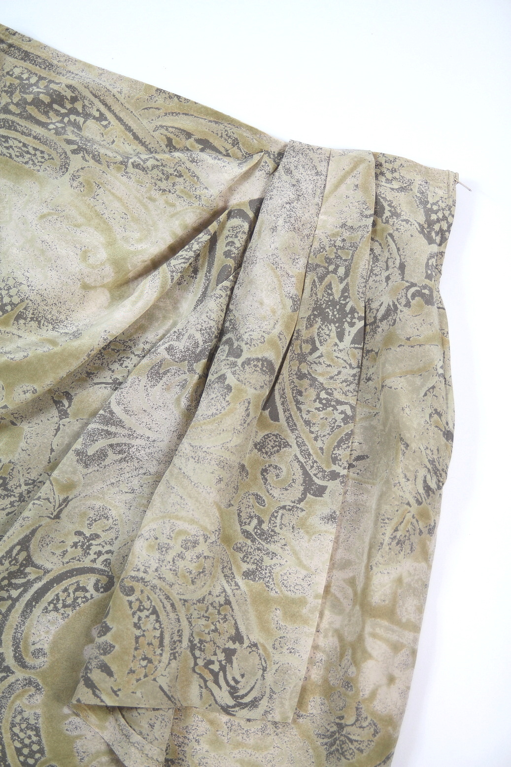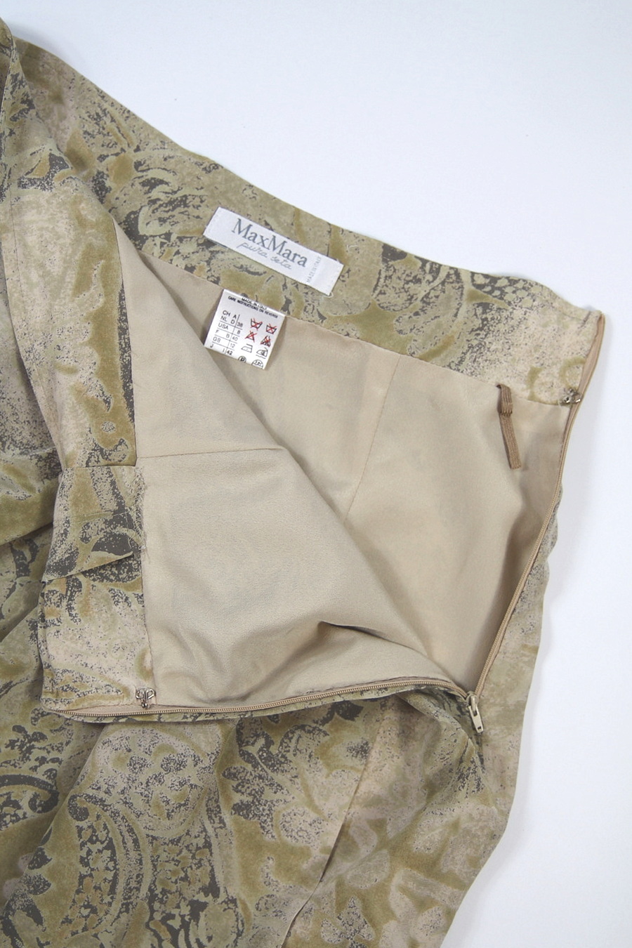 Fusta Max Mara pre-loved, din matase, cu imprimeu baroc subtil si finisaj satinat, croi petrecut, cu prindere laterala si drapaj elegant in talie.