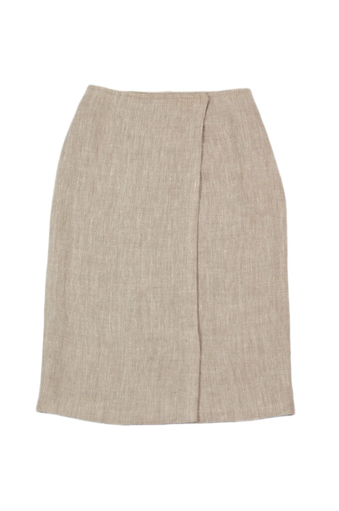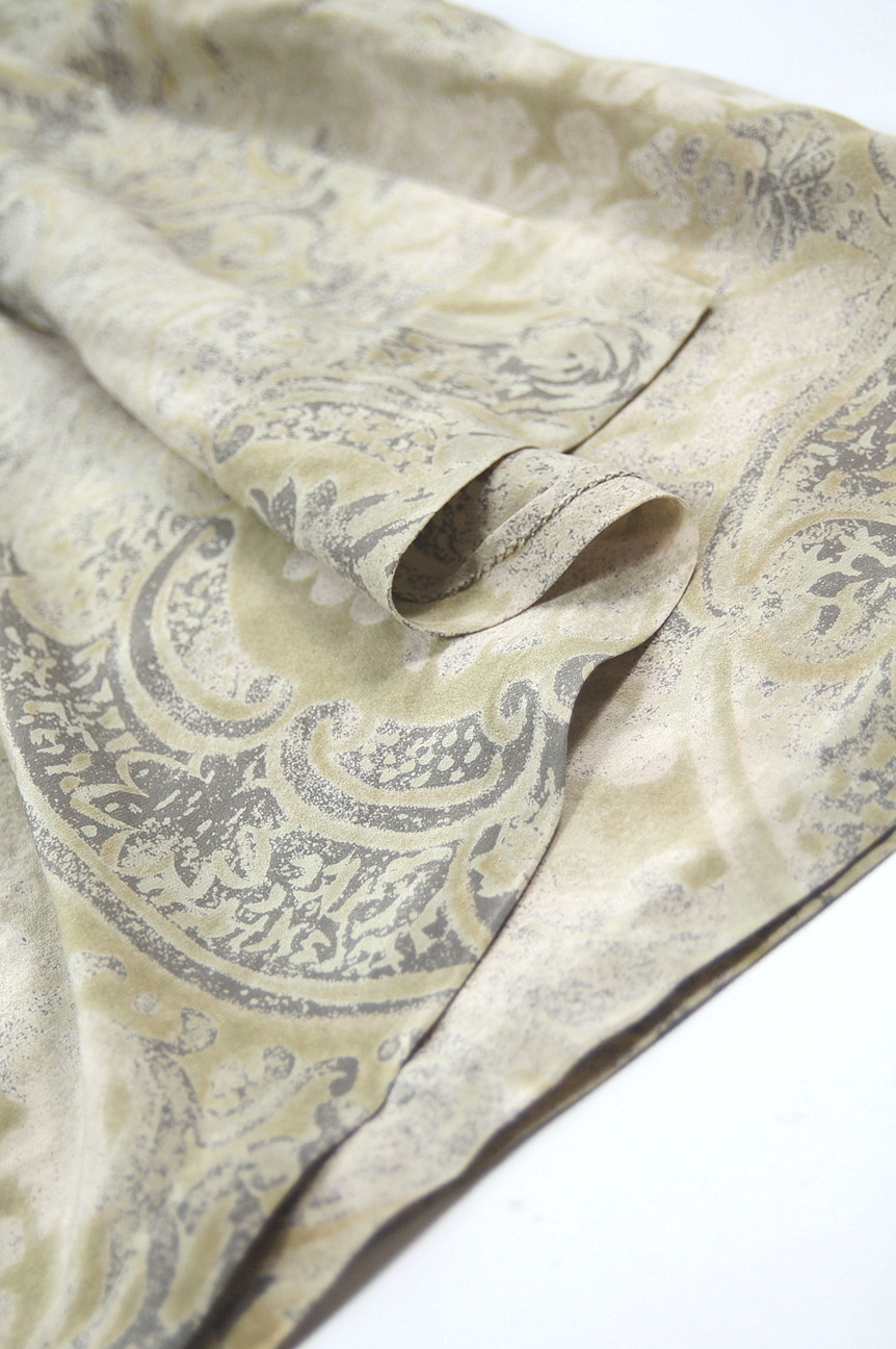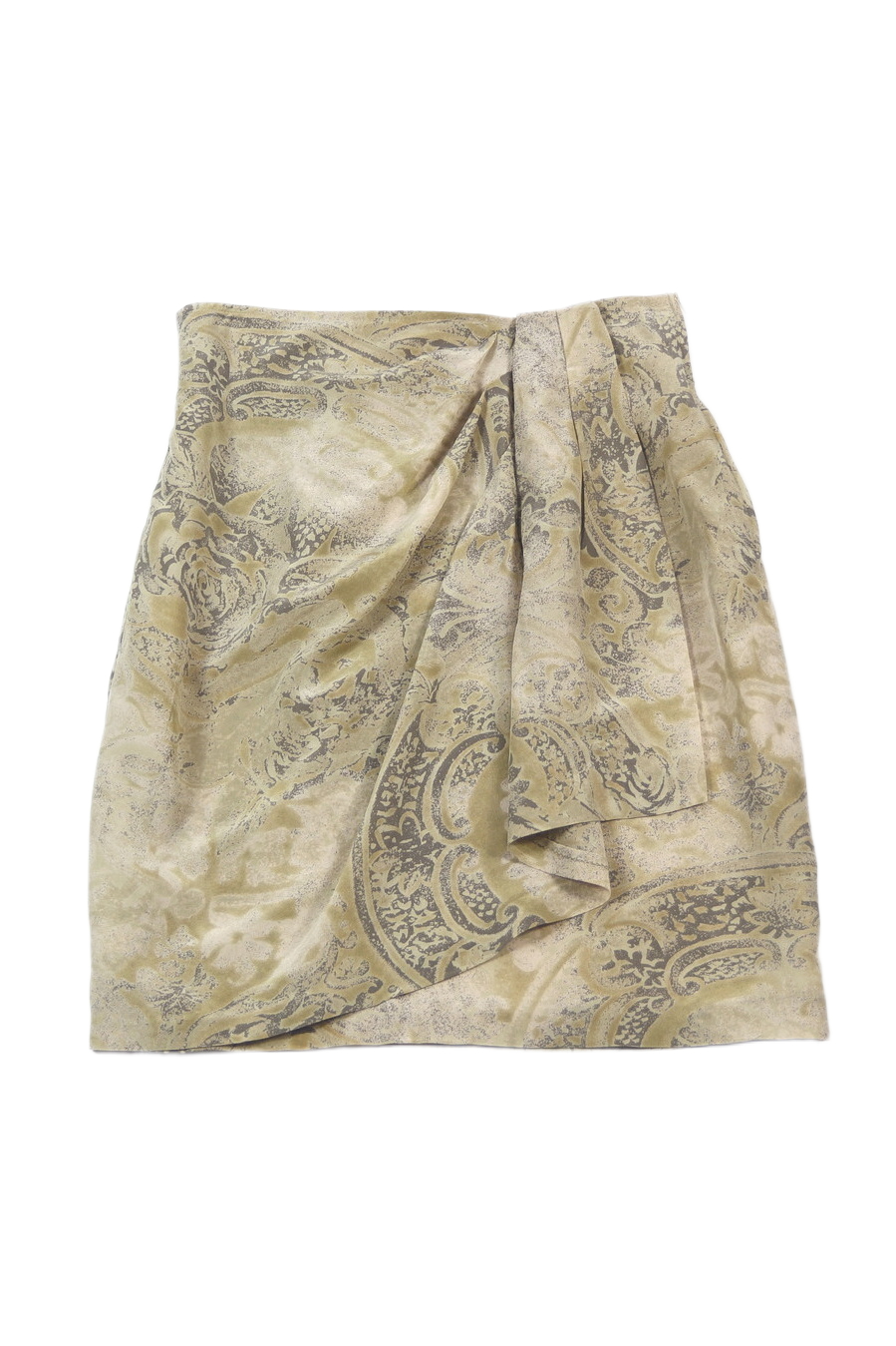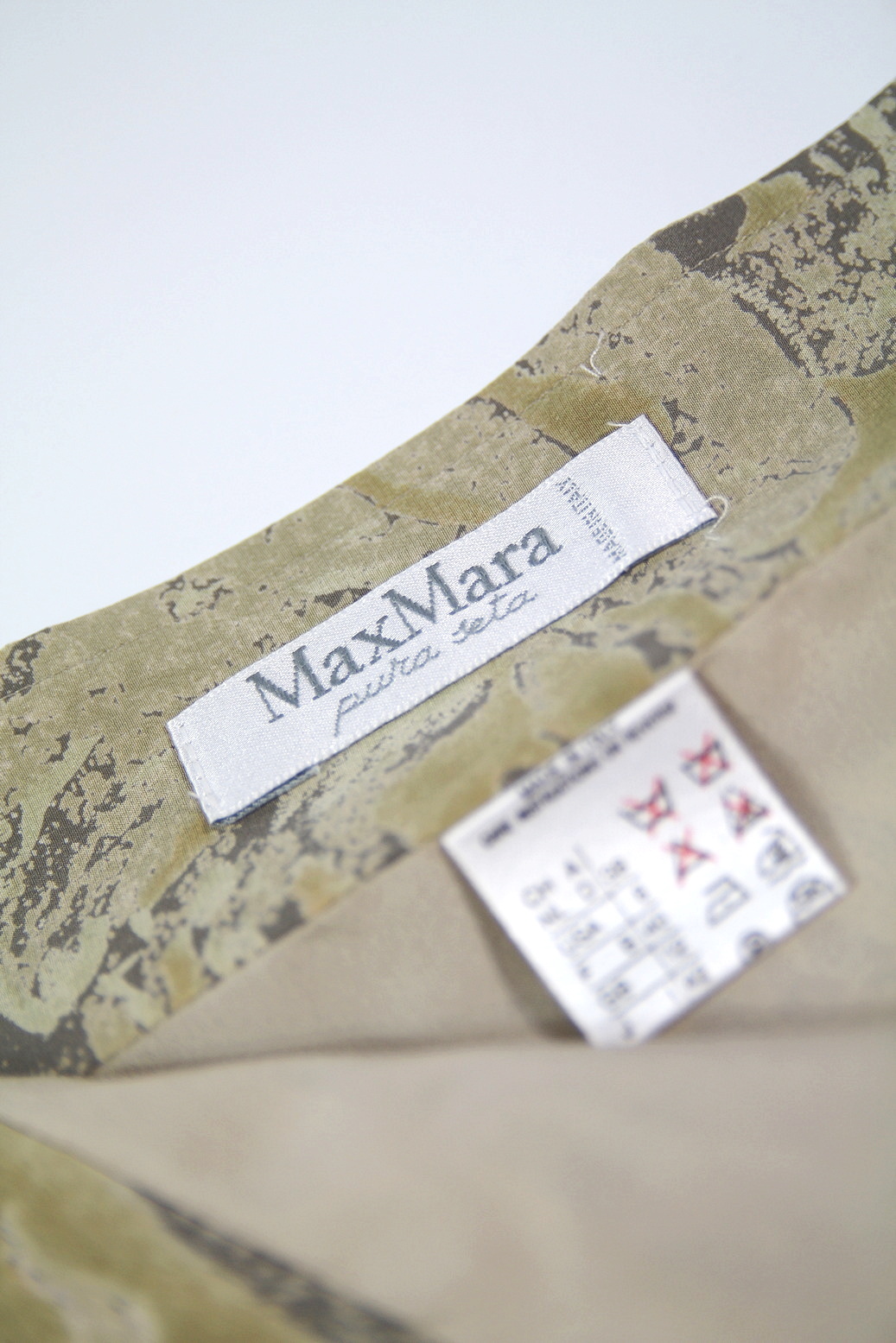 Fusta Max Mara pre-loved, din matase, cu imprimeu baroc subtil si finisaj satinat, croi petrecut, cu prindere laterala si drapaj elegant in talie.