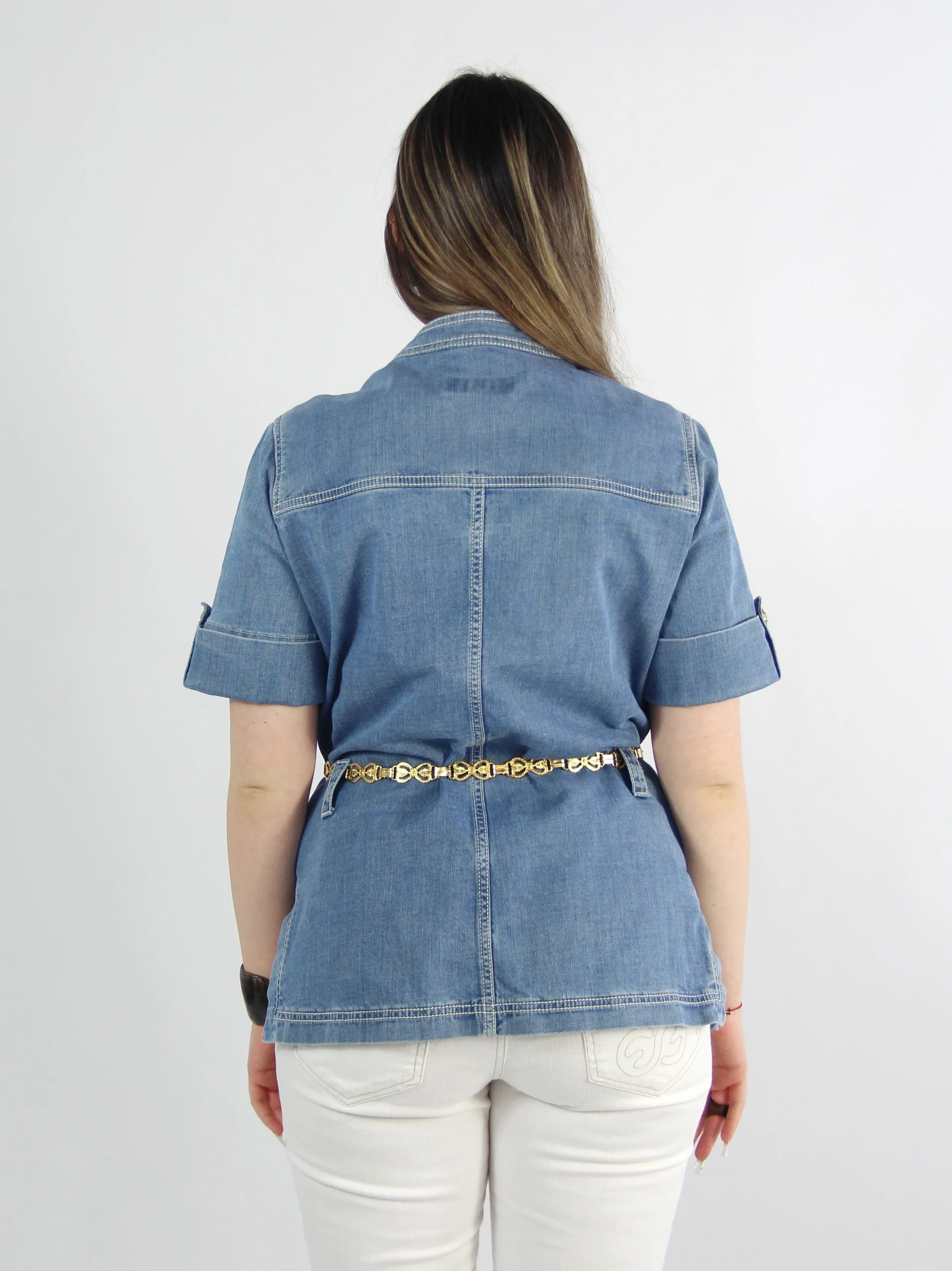 Geaca sacou vintage Escada din denim light blue, croi usor cambrat si constructie structurata inchidere frontala cu fermoar metalic si nasturi aurii cu logo, buzunare aplicate, maneci scurte cu sistem de prindere si gaici la spate pentru cordon, curea sau lant. Conditie impecabila. Lantul nu este inclus.