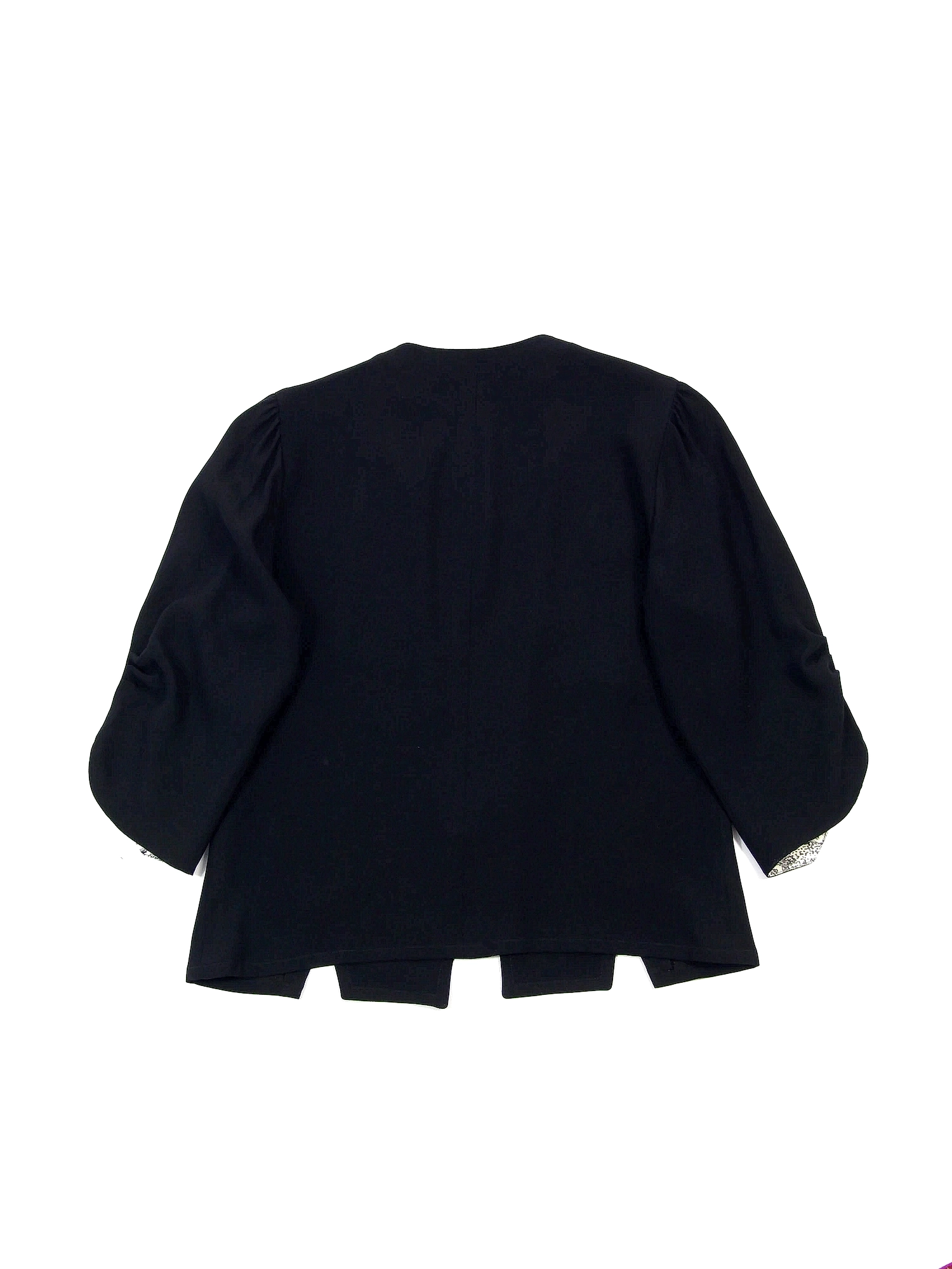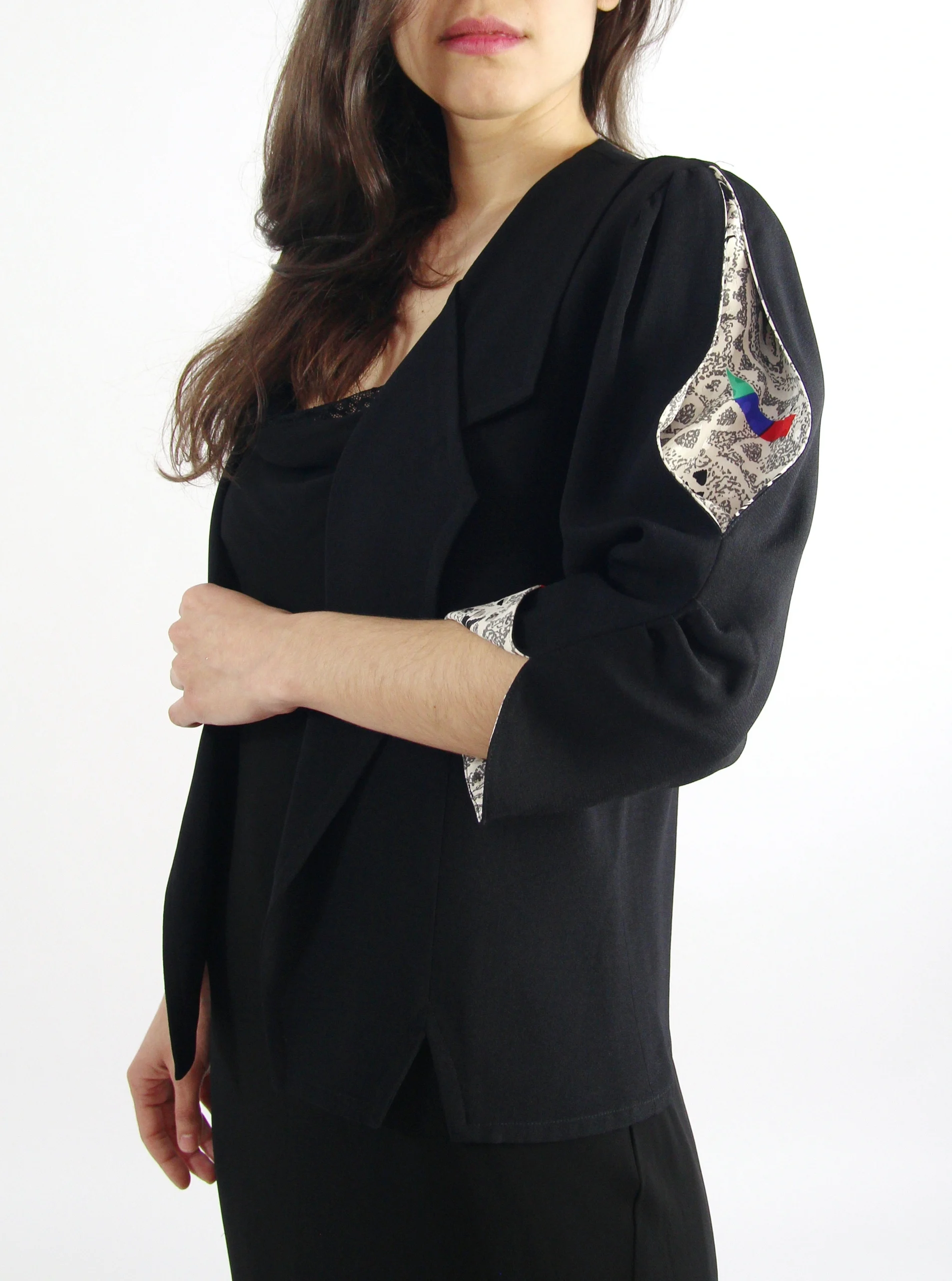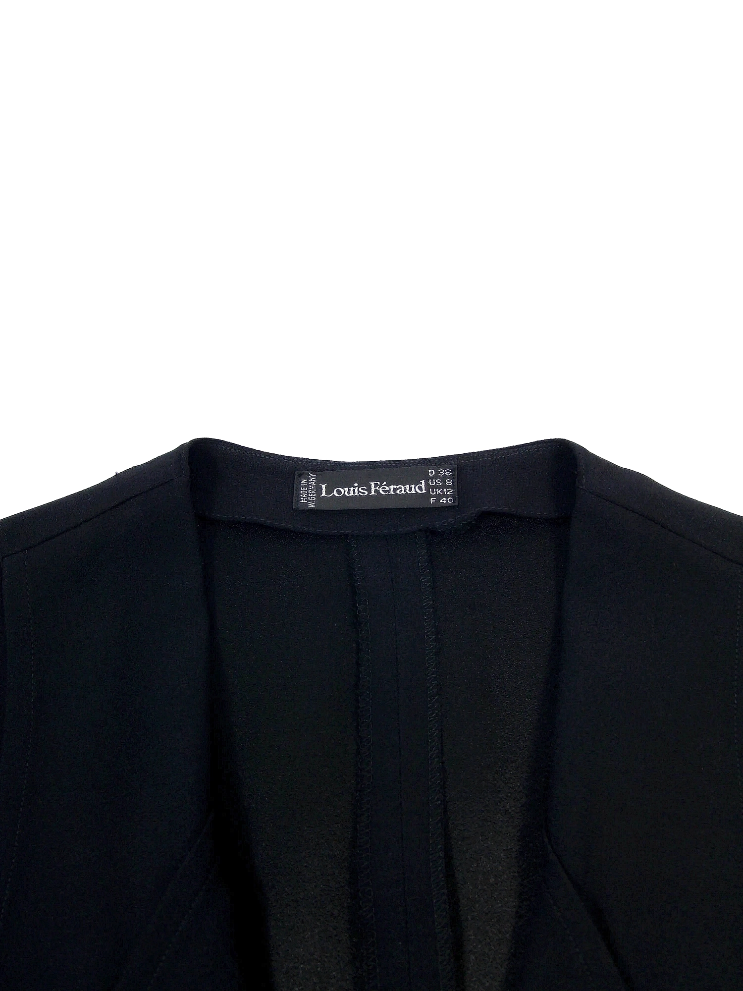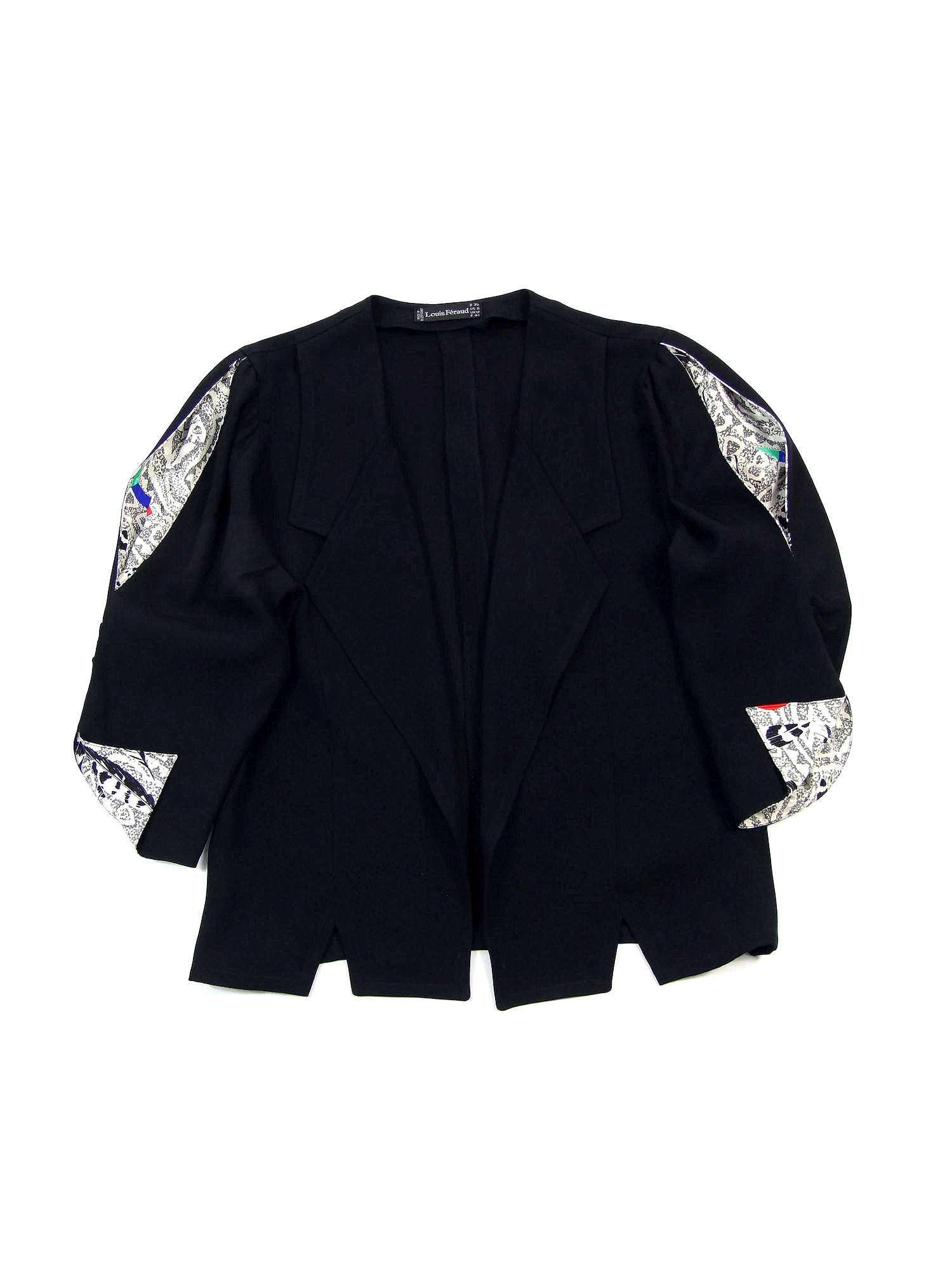 Sacou vintage Louis Feraud, croi lejer, cu rever alungit, maneca scurta cu volum, fara sistem de inchidere si fara dublura, inserții grafice ascunse pe interiorul mânecilor. Conditie impecabila.