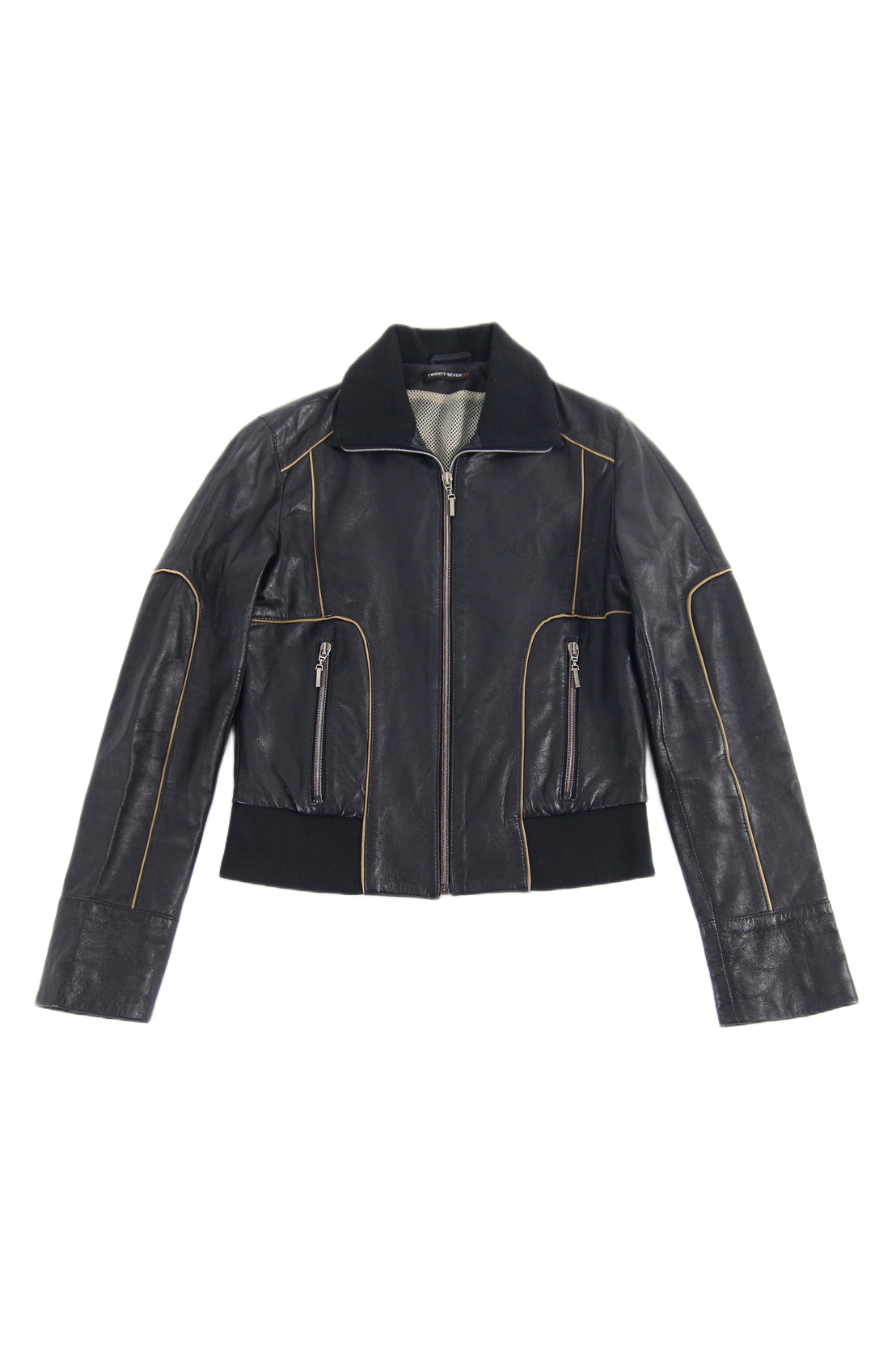 Jacheta anii 2000 din piele naturala, tip bomber, cu insertii de rib la guler si talie, garnituri in culoare contrastanta, buzunare laterale cu fermoar, inchidere frontala cu fermoar.