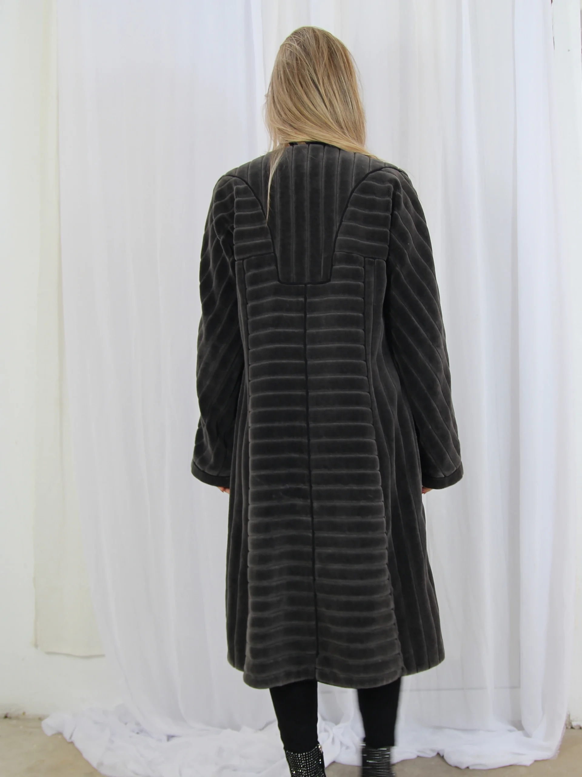 Palton vintage de lux Giorgio Armani, linia A Milano – Borgonuovo 21 (eticheta intacta), model rar. Material exterior din velour, textura luxurianta. Croi midi-lung, maneci lungi, inchidere cu nasturi frontali, buzunare laterale integrate. Design minimalist, elegant, tipic Armani – linie simpla, ton neutru gri-mocca. Linia Borgonuovo 21 activeaza din anii ’80 spre ’90, fiind o colectie premium “Black Label” Armani.Captuseala fina, matlasata; design de velour cu nervuri orizontale (vedere detalii maneca/spate). Prezinta mici semne de uzura la captuseala (zona interioara) – vezi fotografii; materialul exterior in stare excelenta.