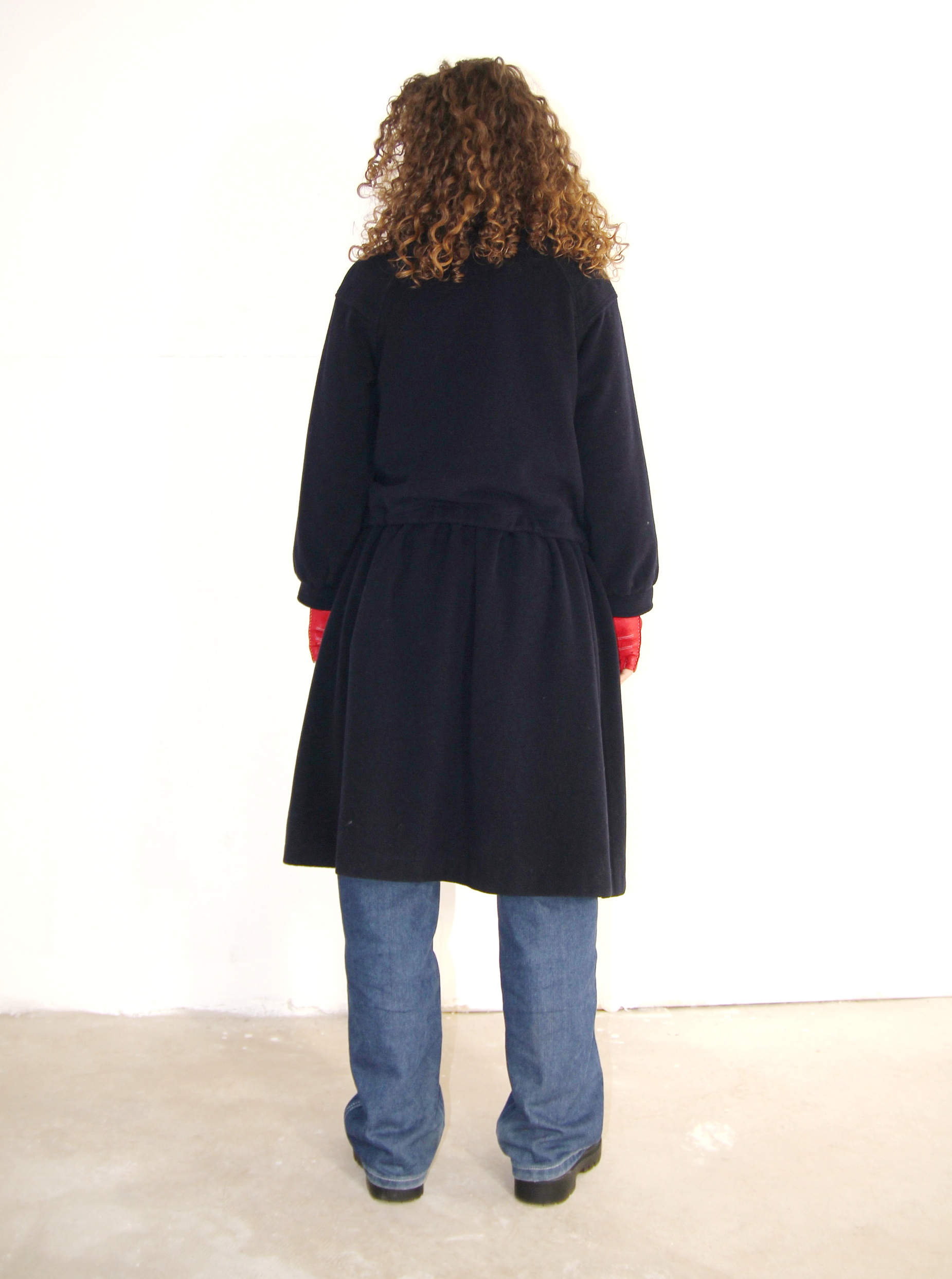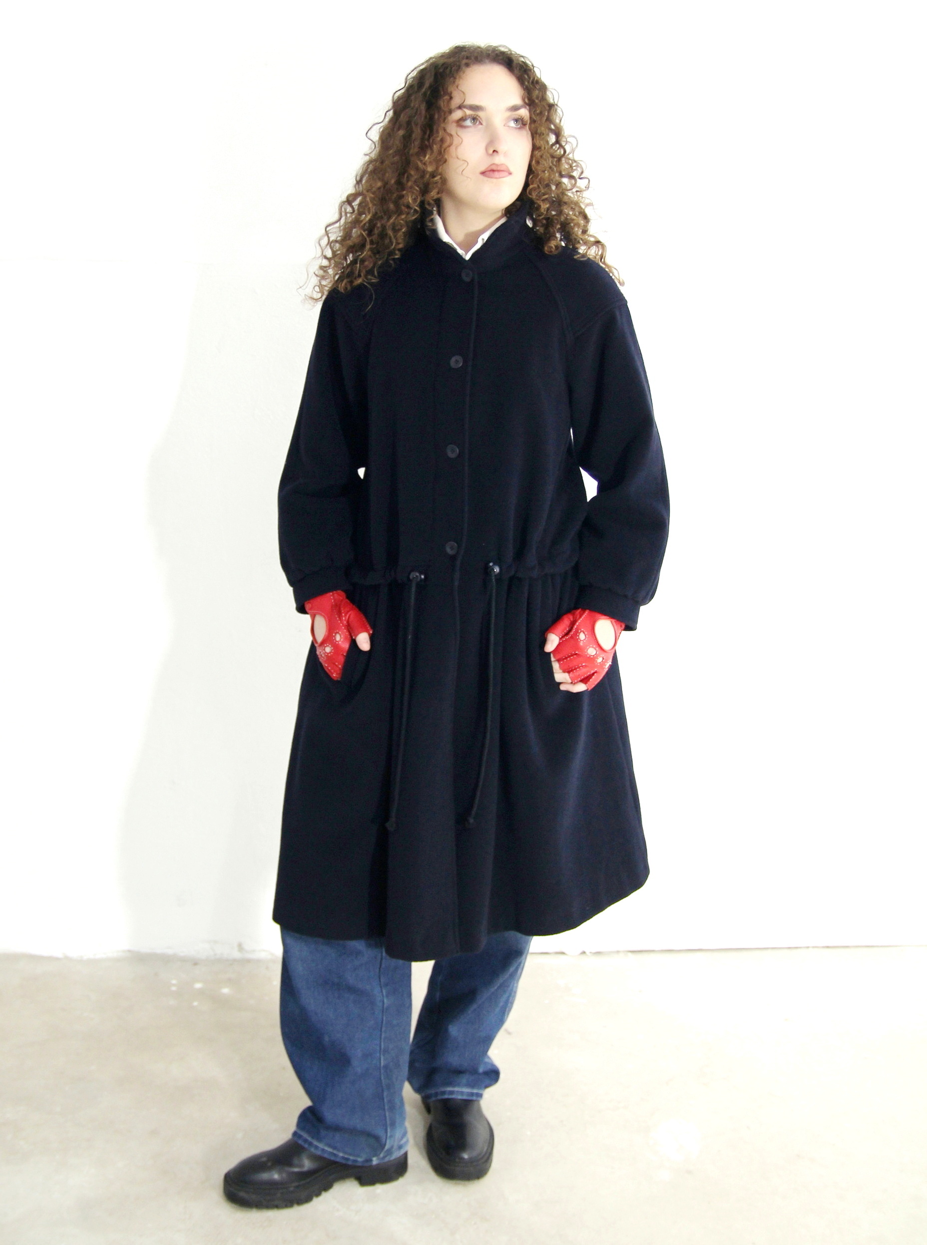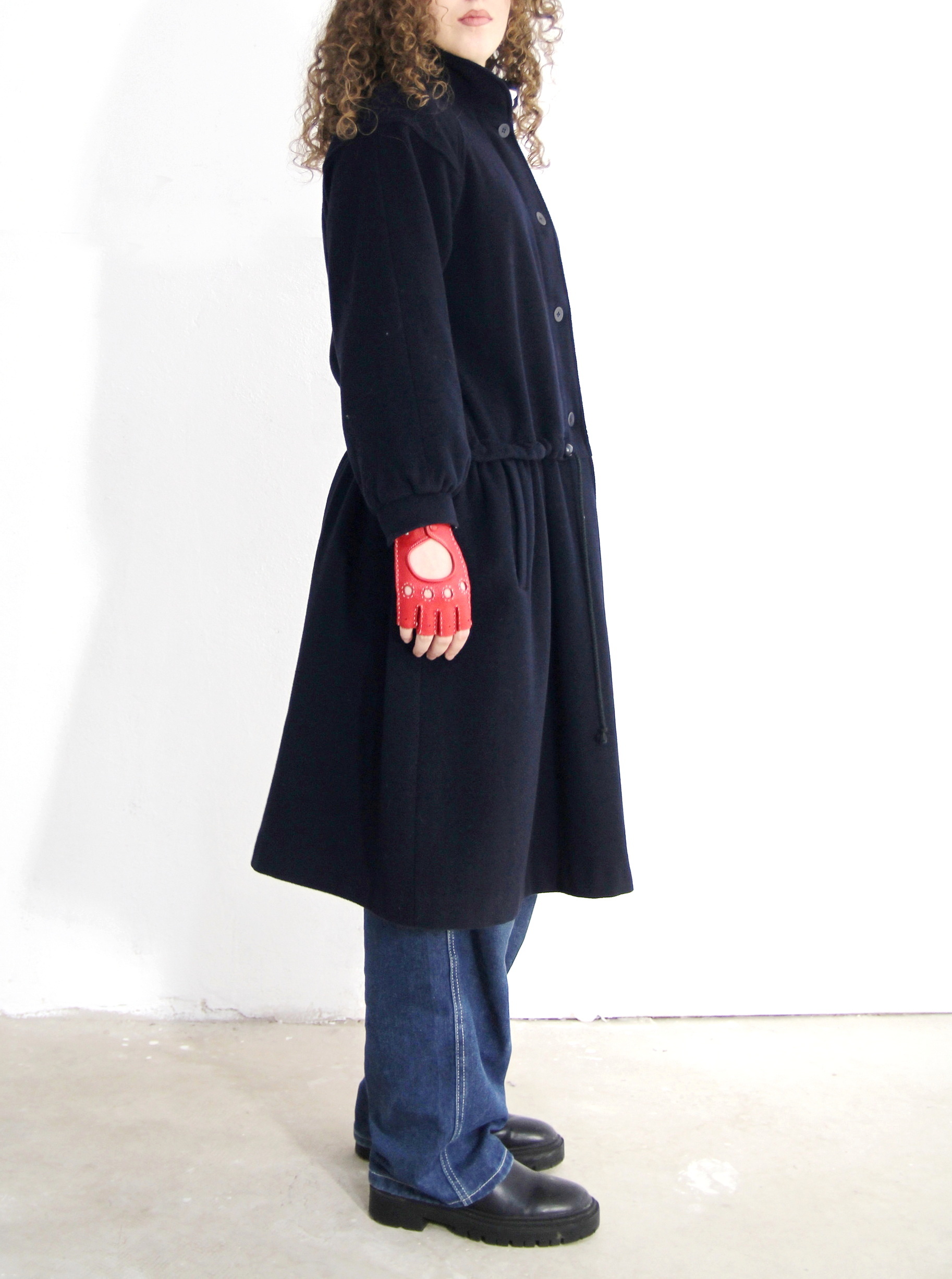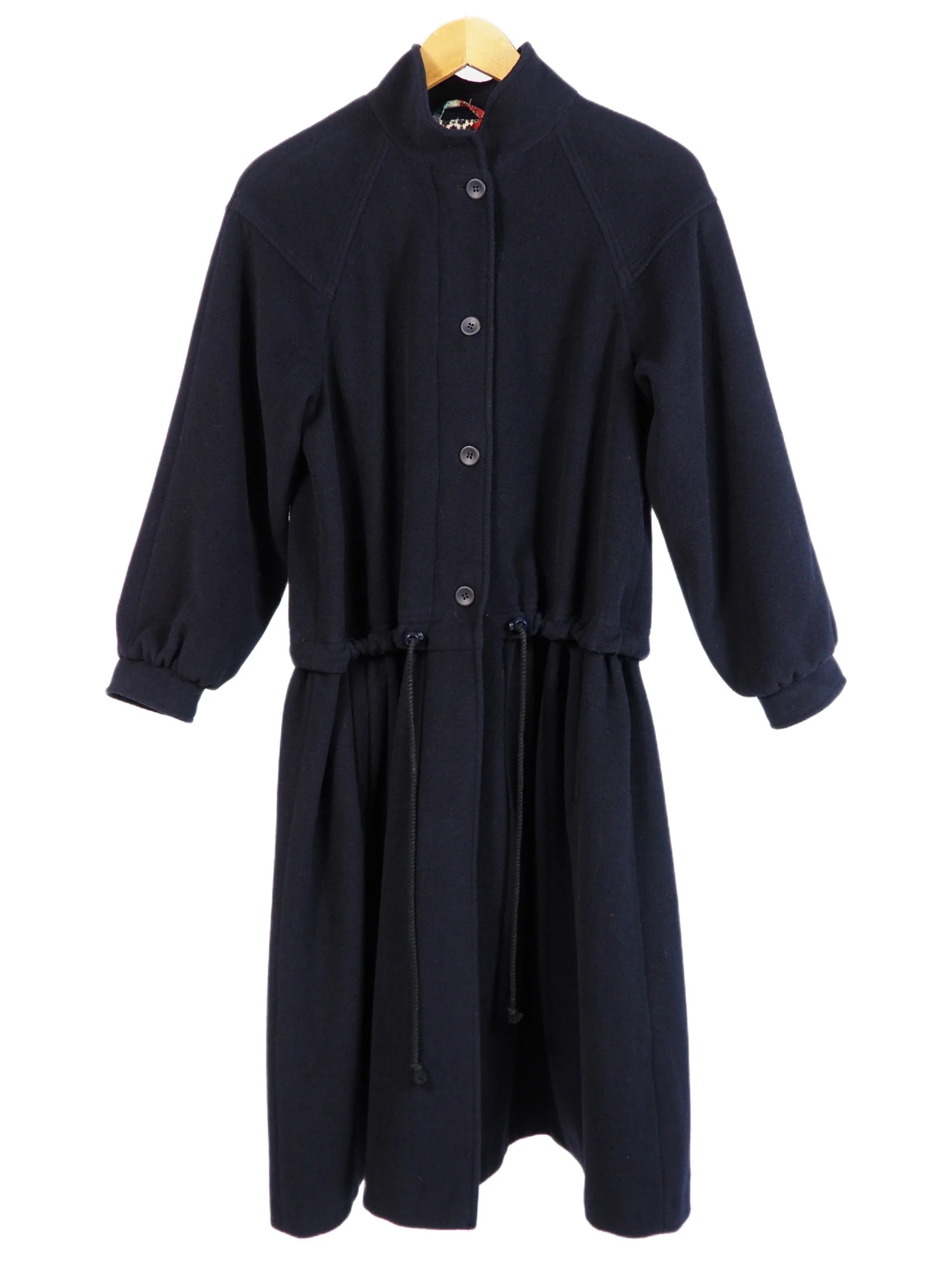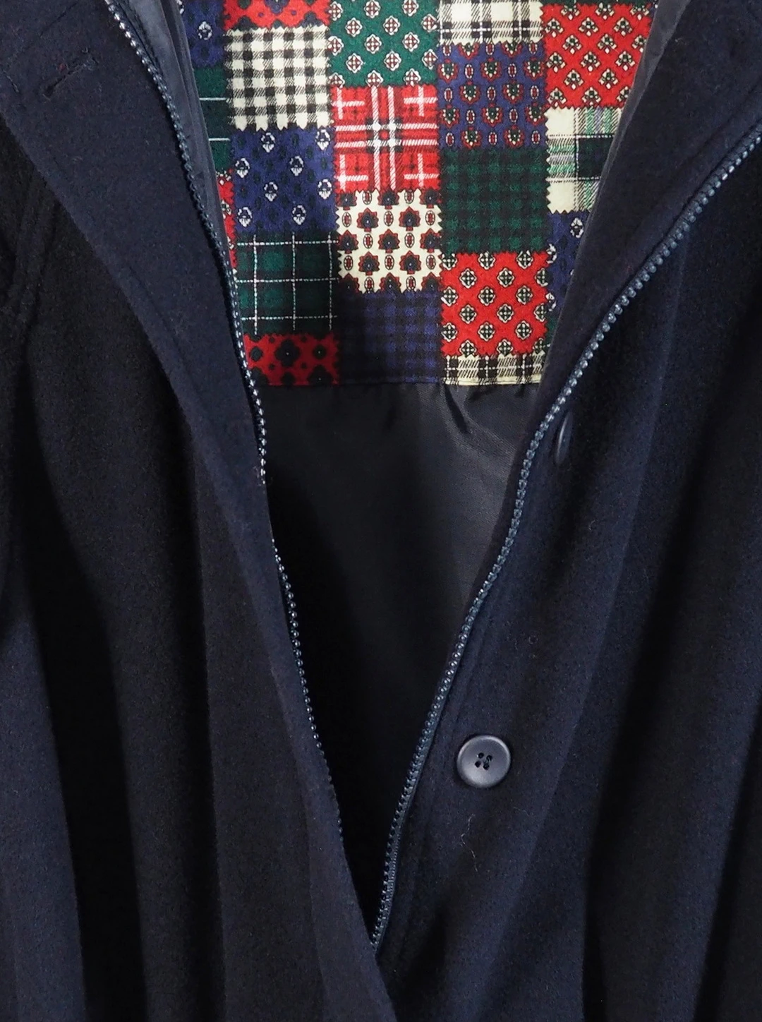 Palton vintage subtire cu talie ajustabile, cadere fluida si textura moale, in nuanta bleumarin intens, cu guler rotunjit, inchidere frontala cu nasturi si talie ajustabila cu snur pentru definirea siluetei. Buzunare laterale discrete si captuseala statement cu print patchwork in carouri si motive grafice multicolore, care adauga un contrast subtil si un detaliu surpriza la interior.