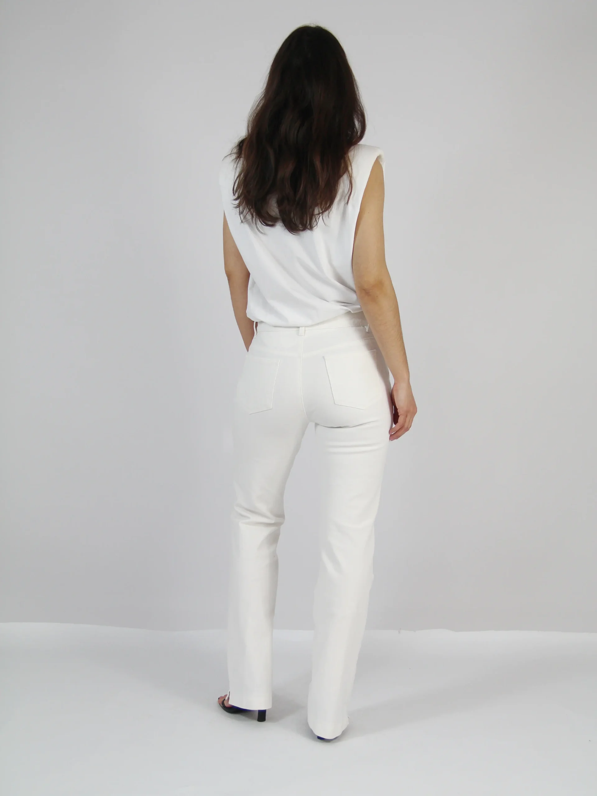 Pantaloni vintage Escada sport croi drept, din denim alb, elastic. Design minimalist, talie medie, inchidere cu fermoar si nasture metalic inscriptionat. Conditie excelenta