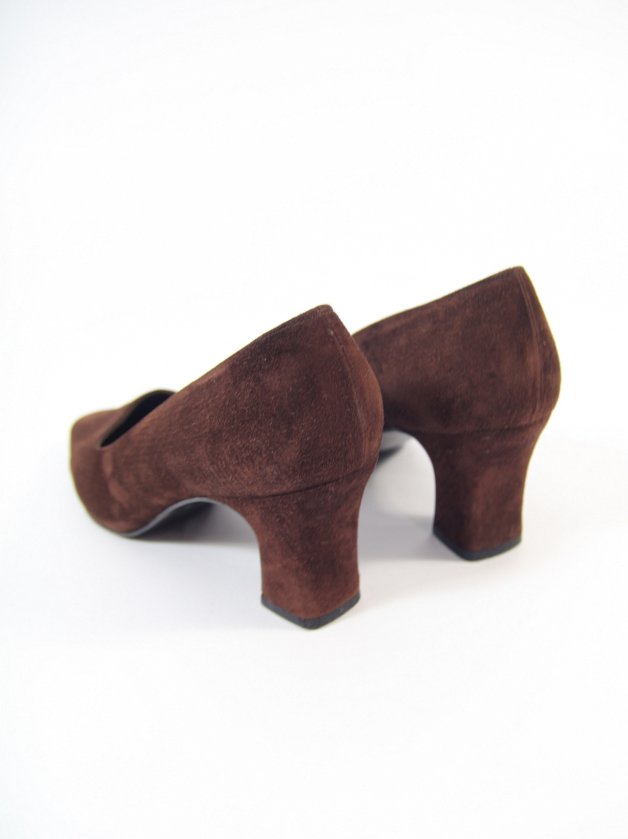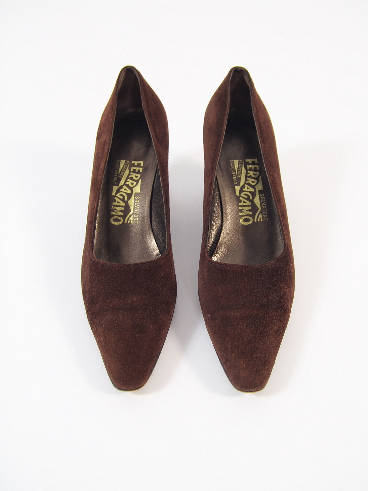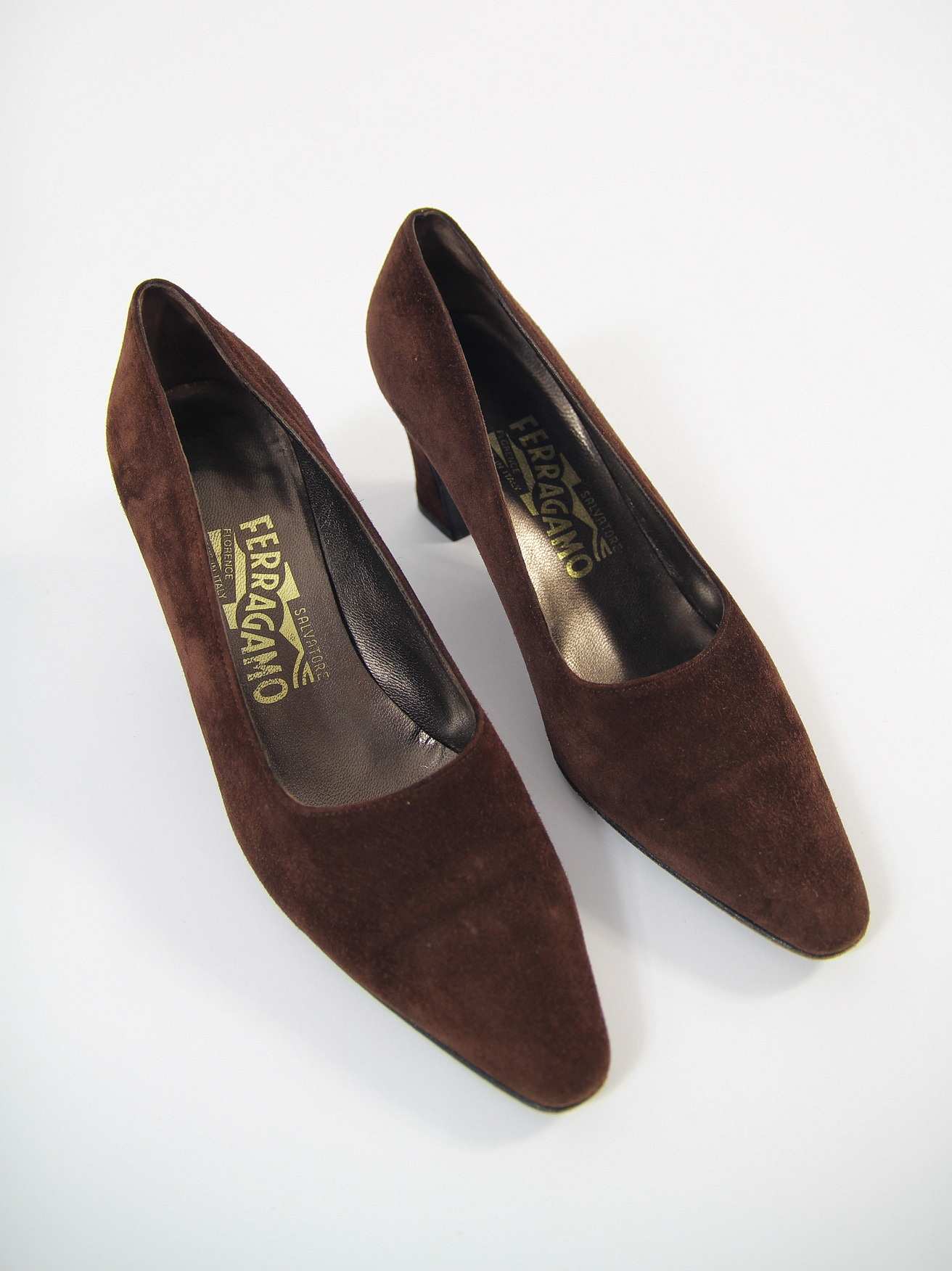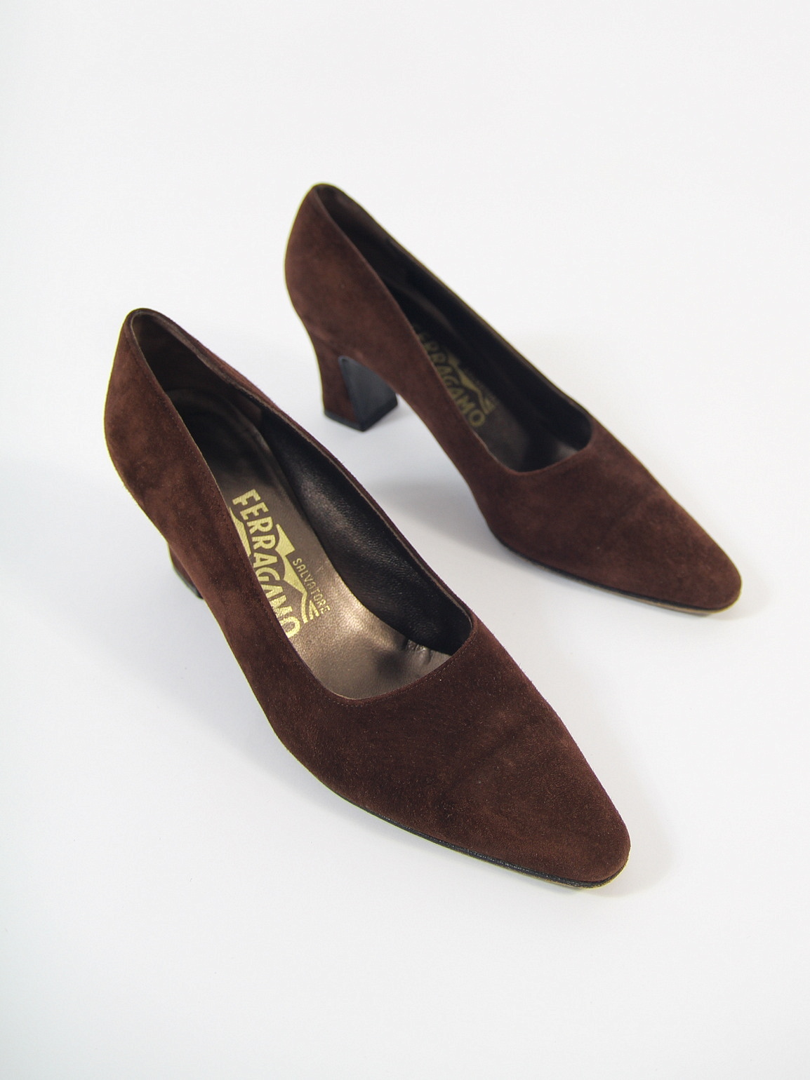 Pantofi Salvatore Ferragamo vintage, realizati in Italia din piele intoarsa fina, in nuanta maro ciocolatiu. Design elegant cu varf usor ascutit si toc gros mediu, caracteristic anilor ‘80-‘90. Interior din piele.