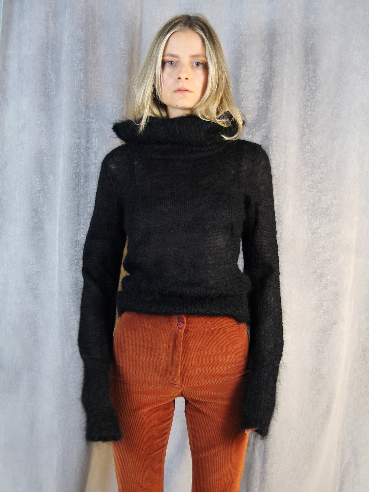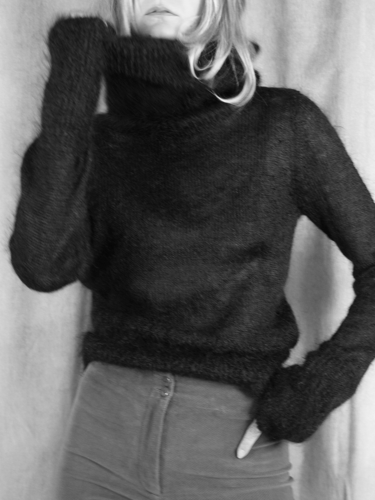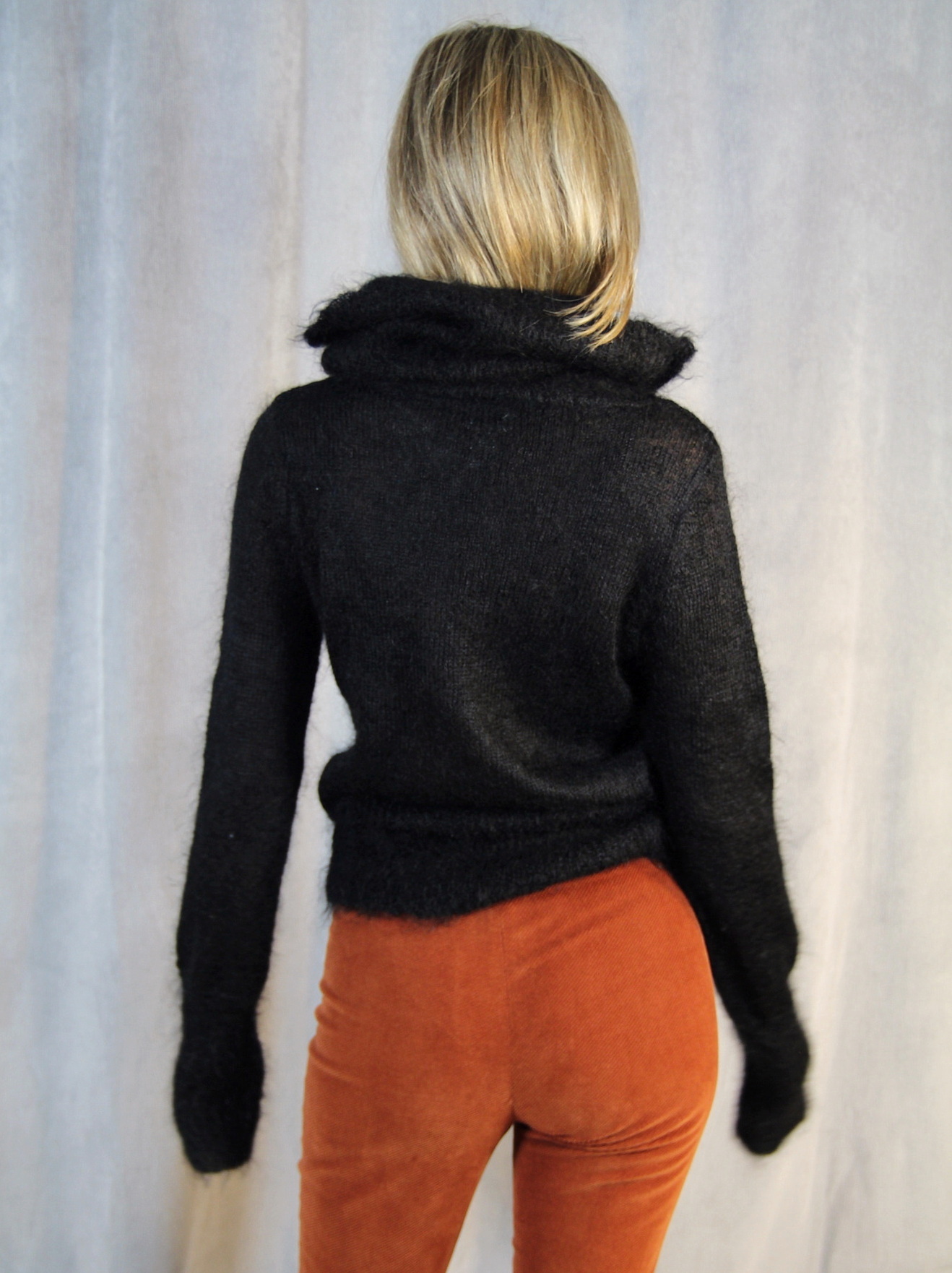 Pulover DKNY City anii 2000, din mohair, negru, cu guler inalt lejer. Textura moale, pufoasa, cu un croi slim. Maneci lungi, usor alungite pentru un efect modern. Impecabil.