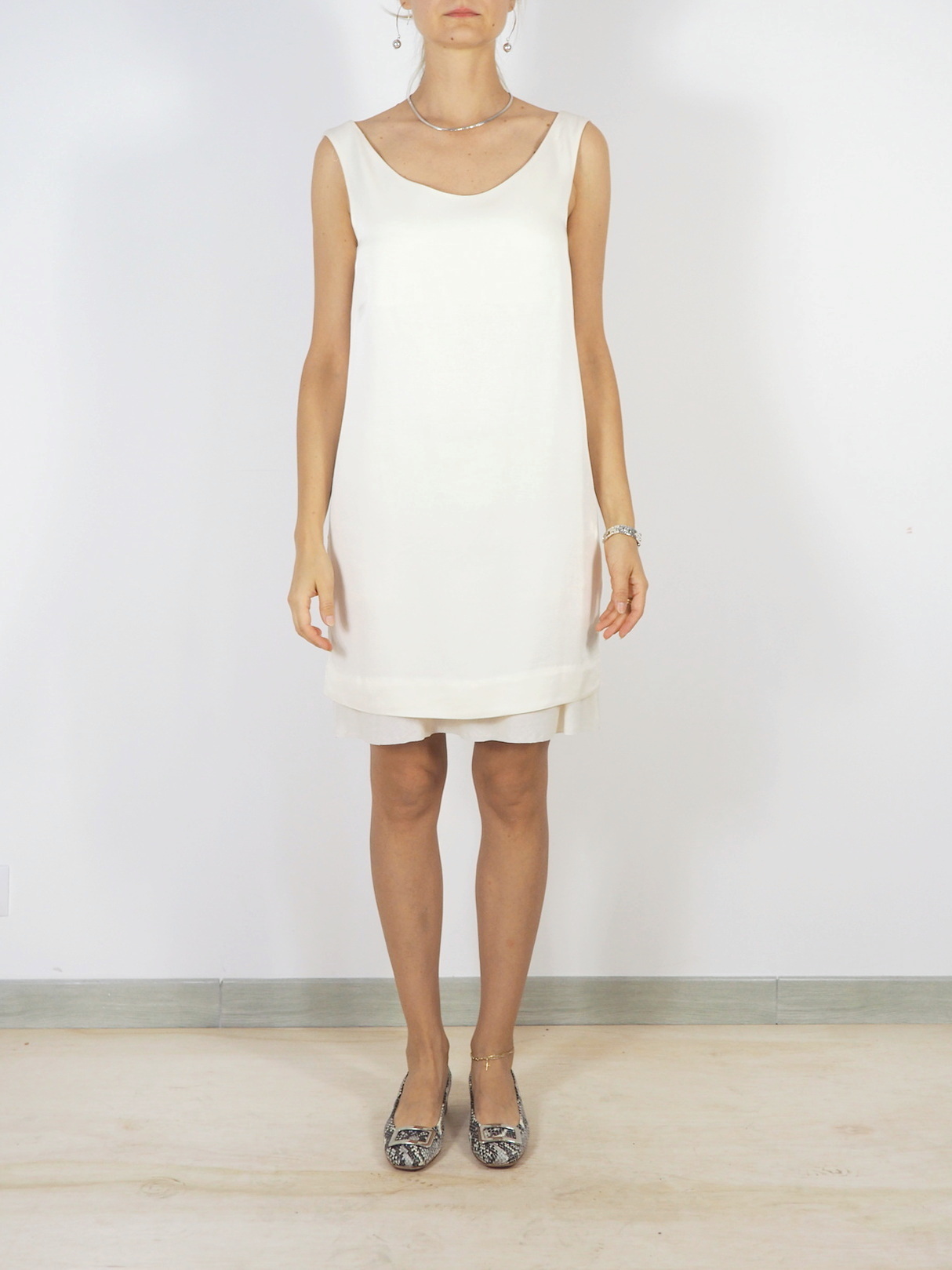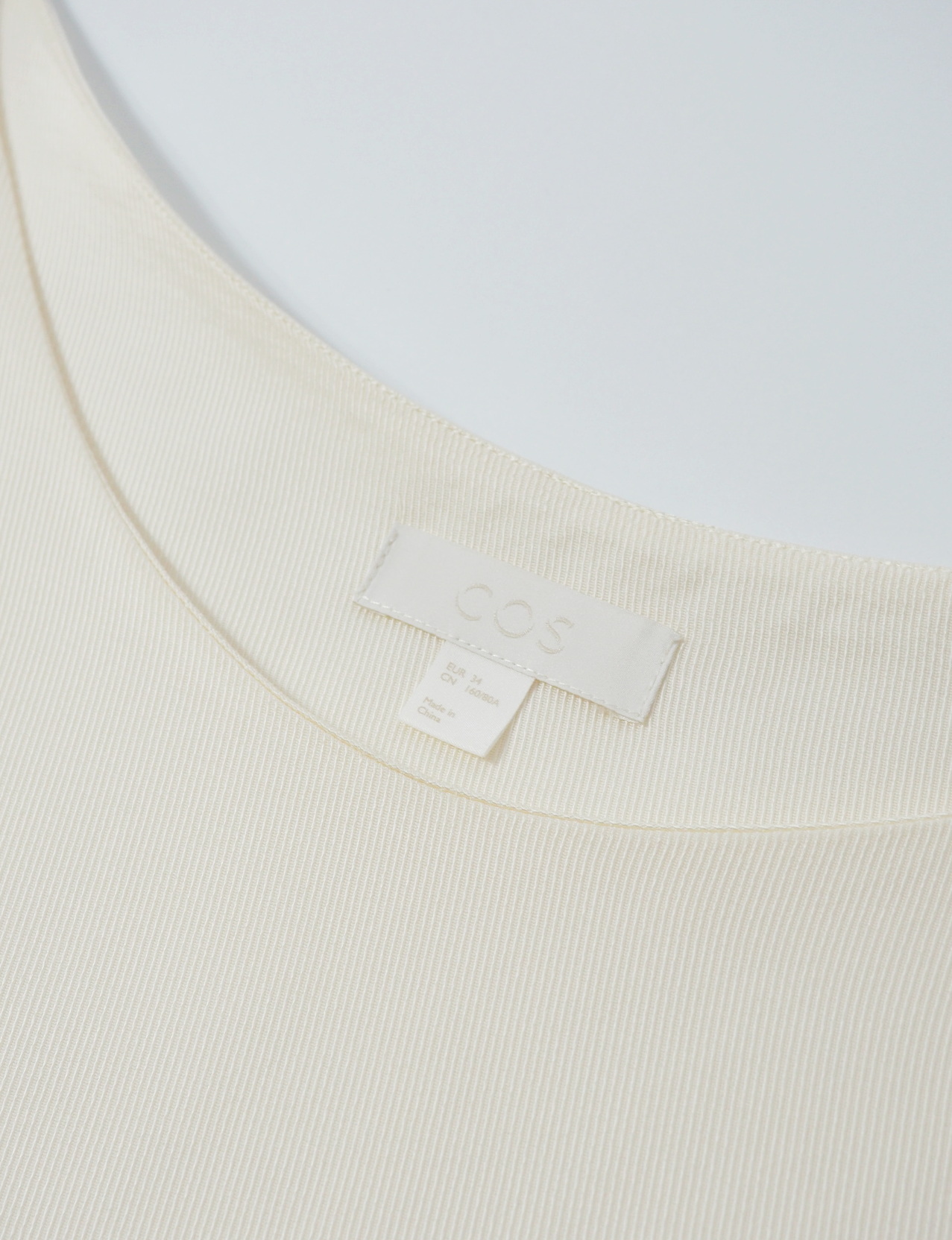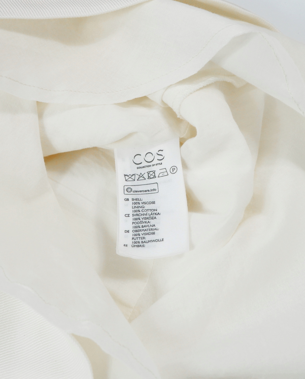Rochie COS pre-loved, in nuanta ivory, realizata din material texturat cu strat dublu la tiv. Croi minimalist, drept, fara maneci, cu decolteu rotund.