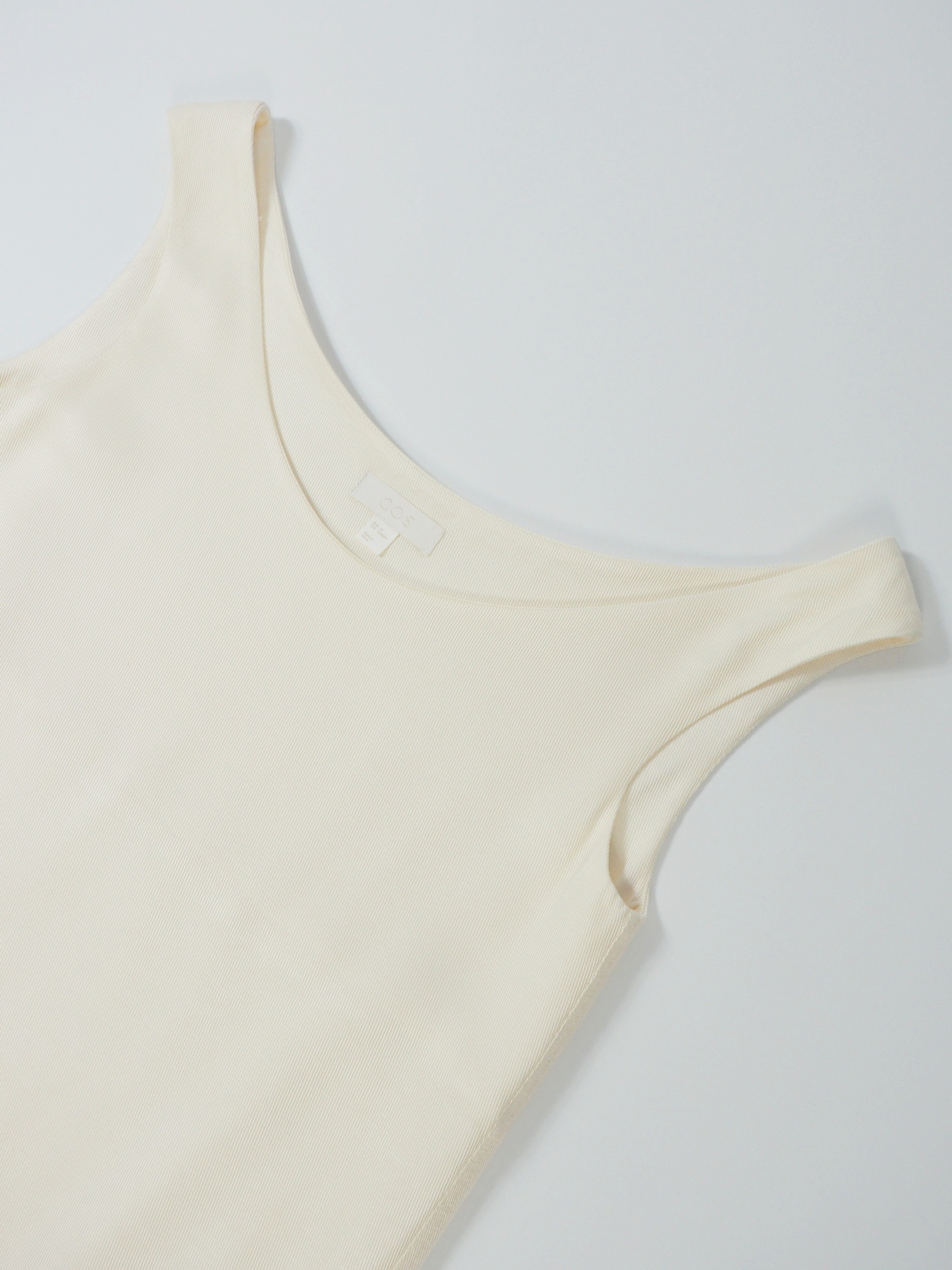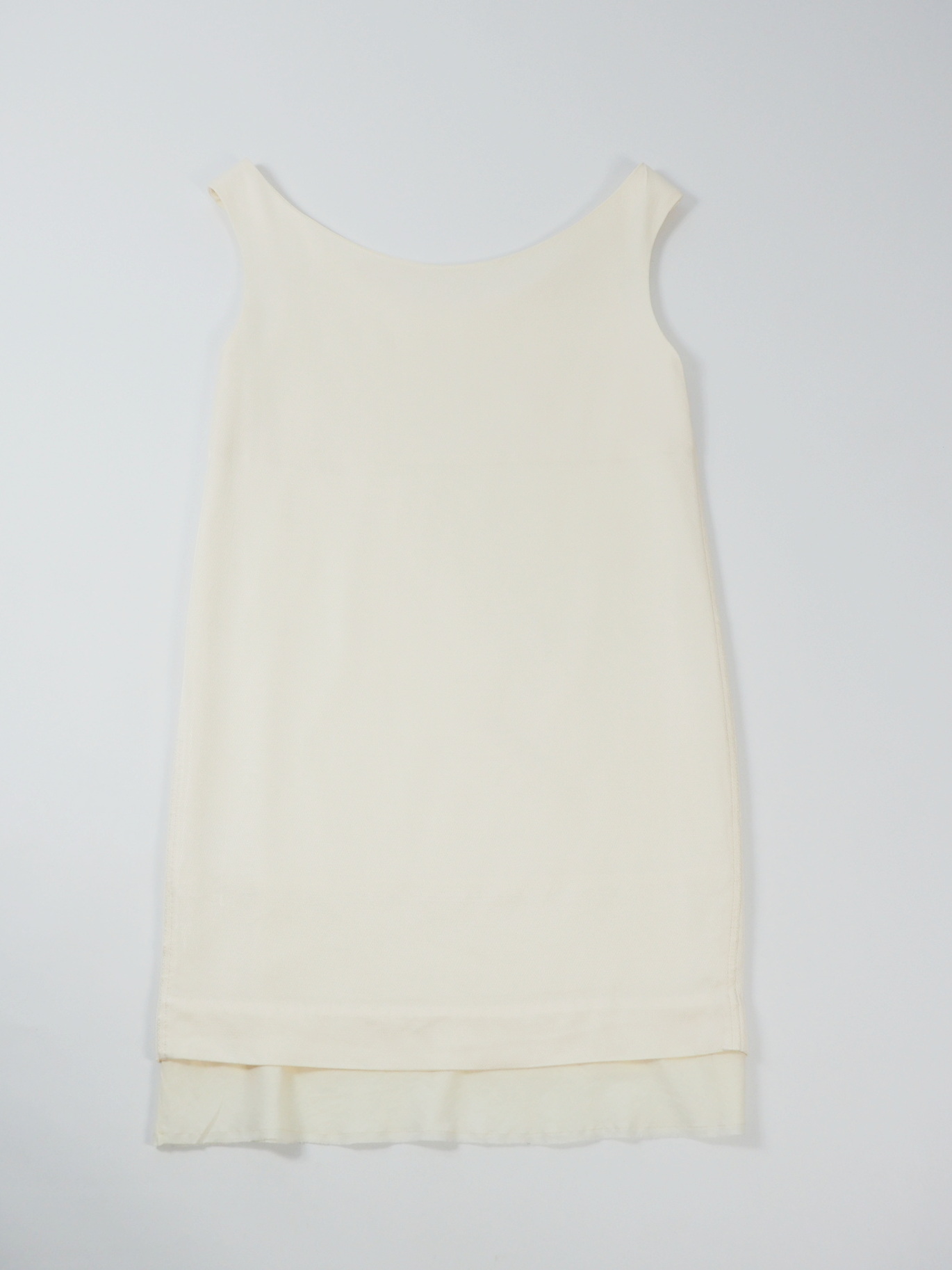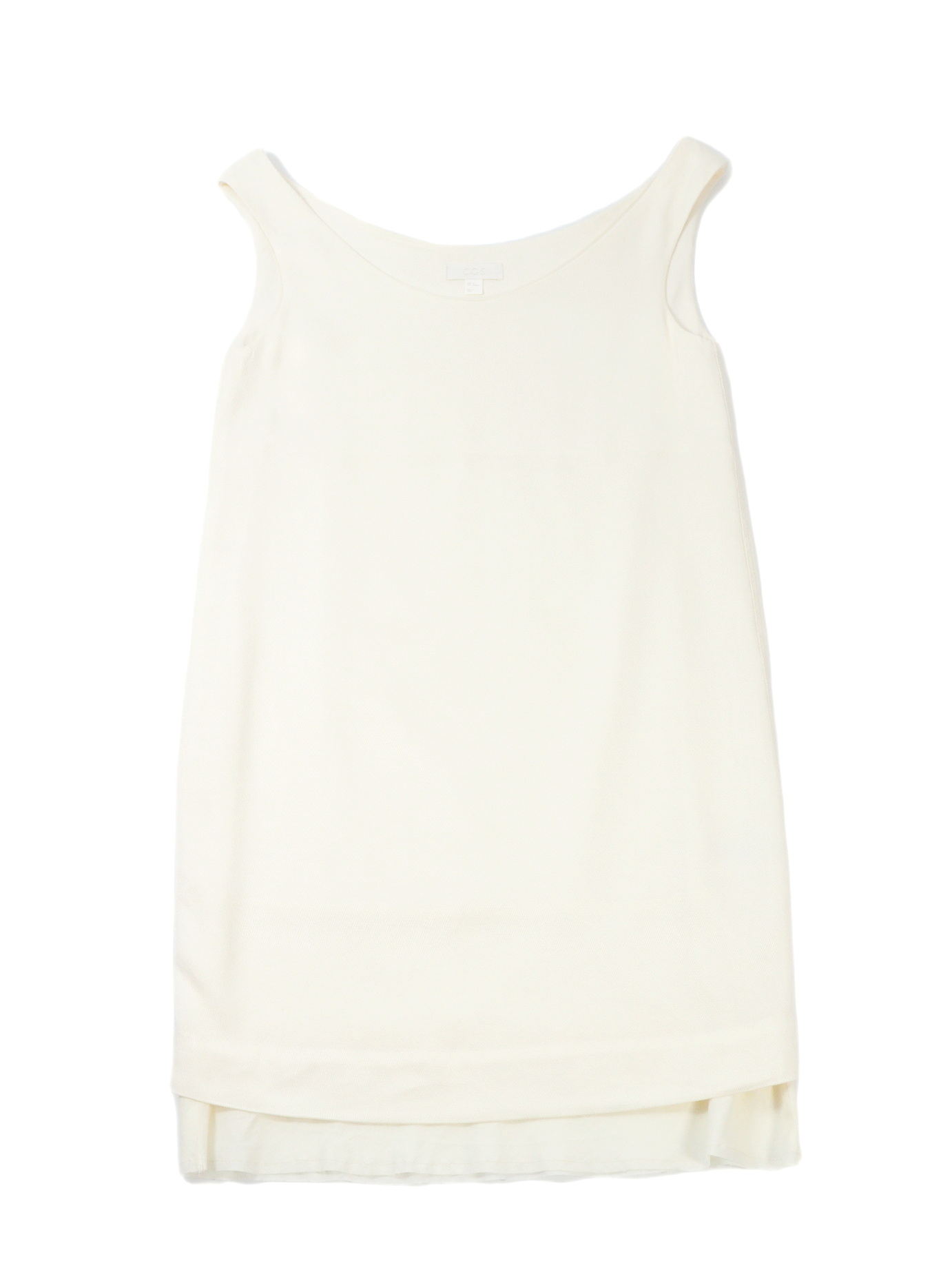 Rochie COS pre-loved, in nuanta ivory, realizata din material texturat cu strat dublu la tiv. Croi minimalist, drept, fara maneci, cu decolteu rotund.