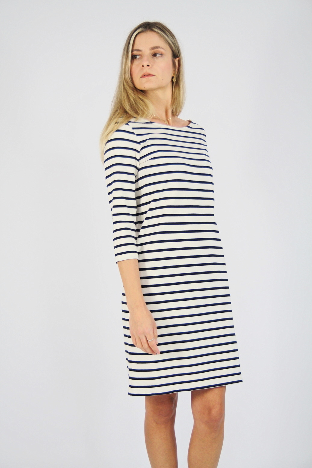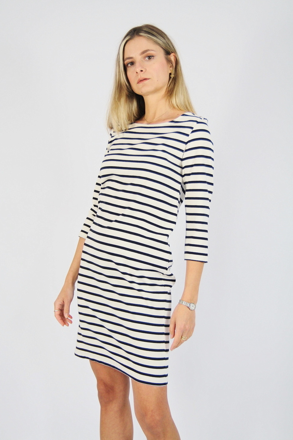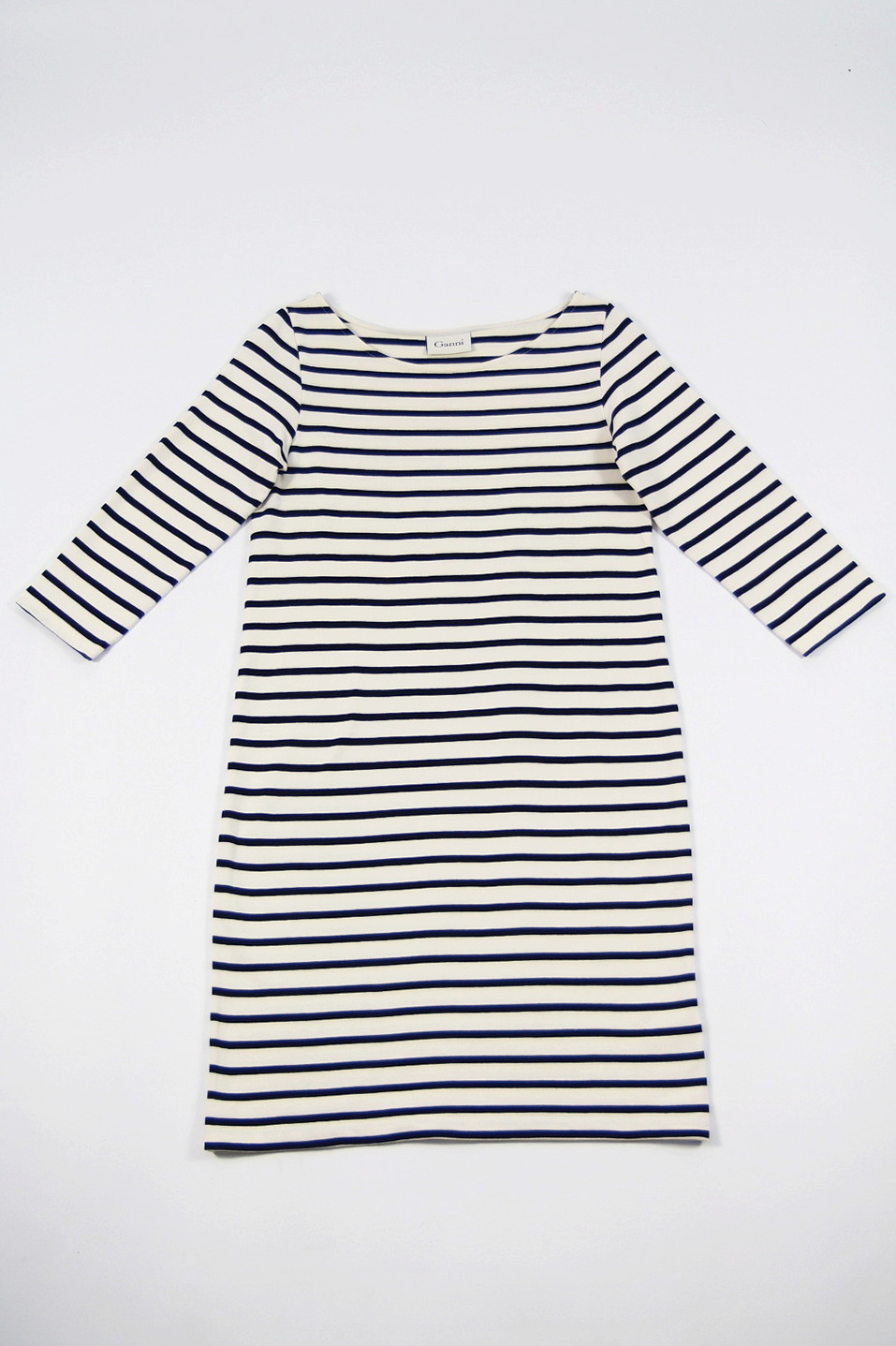 Rochie GANNI pre-loved, tip breton din jerseu gros, cu dungi bleumarin pe fond alb.