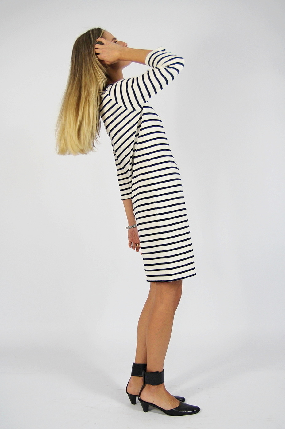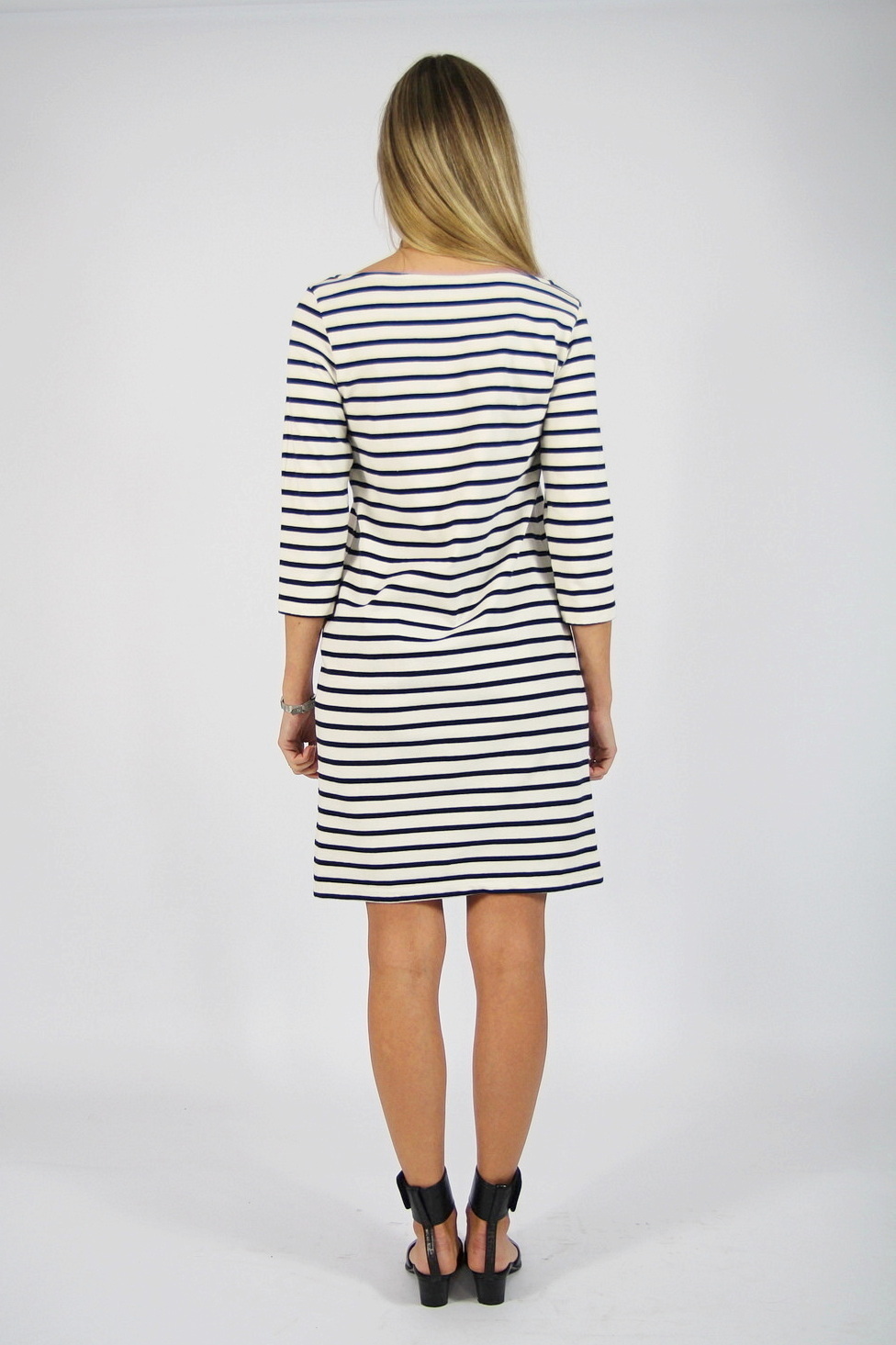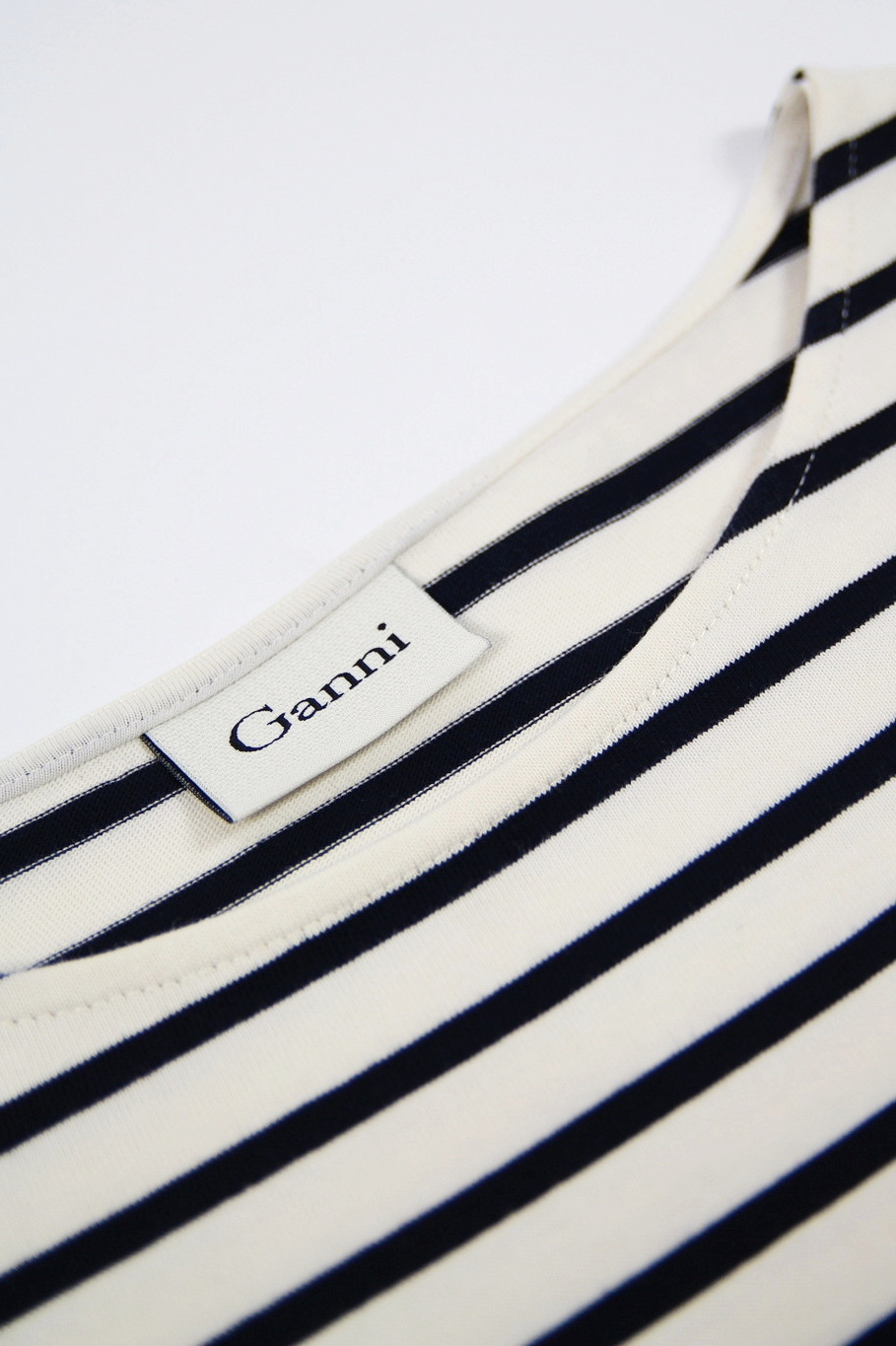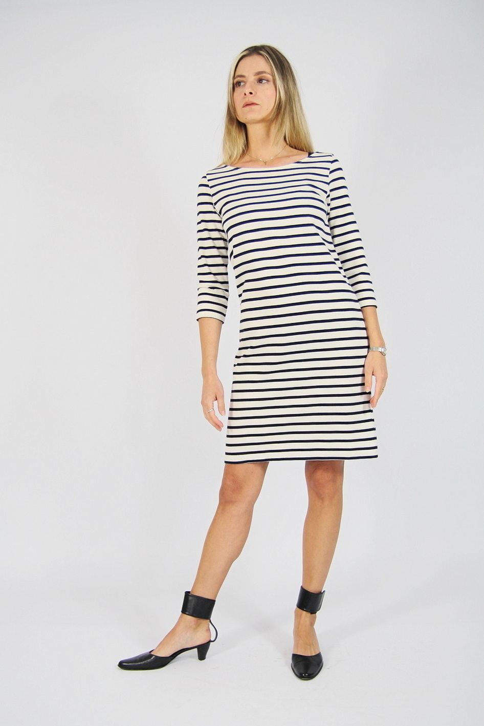 Rochie GANNI pre-loved, tip breton din jerseu gros, cu dungi bleumarin pe fond alb.