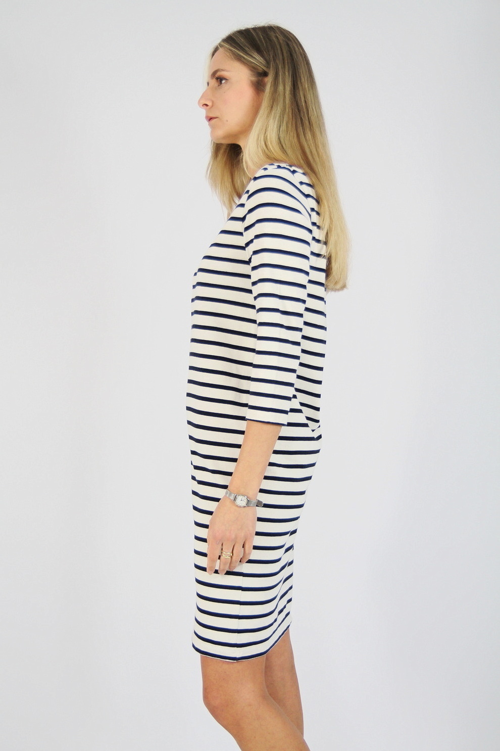 Croi drept, cu decolteu barca si maneci trei sferturi. Material elastic, confortabil, potrivit pentru tinute casual-chic.
