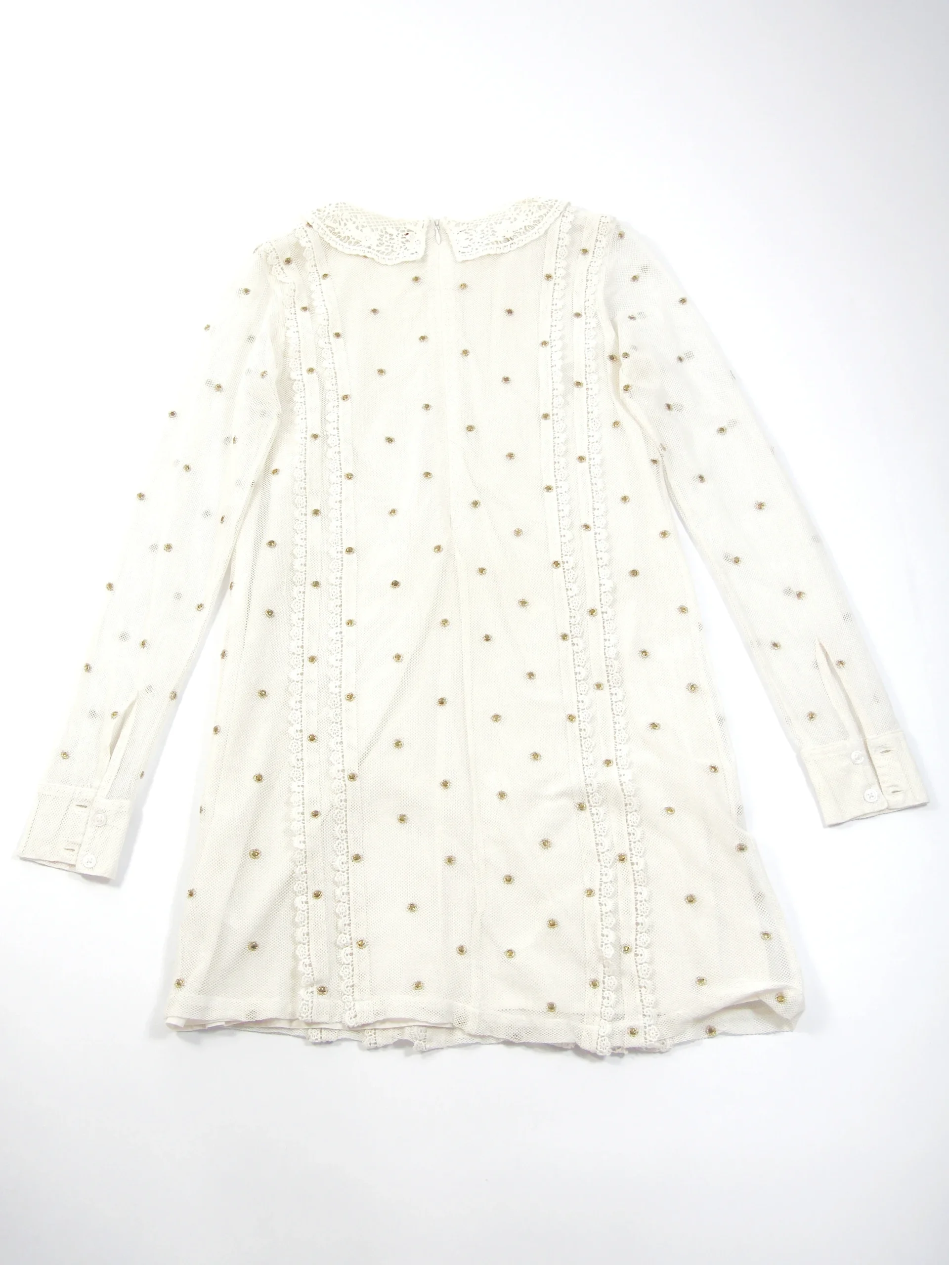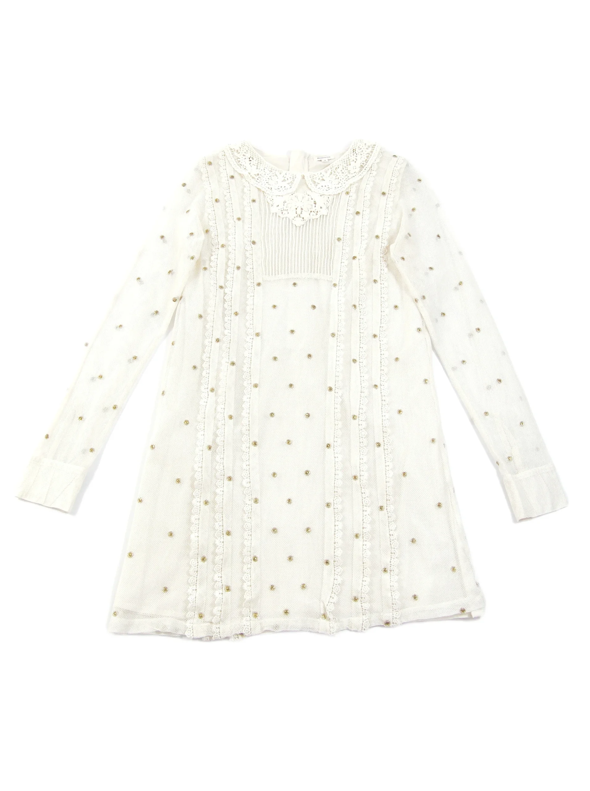 Rochie Manoush cu dantela si aplicatii, premium pre-loved. Croi drept lejer si lungime mini, realizata din tulle fin cu broderii decorative si insertii de dantela aplicata, detaliata cu mici aplicatii metalice aurii pe intreaga suprafata, guler rotund cu dantela festonata si maneci lungi transparente cu mansete finisate, inchidere la spate, culoare crem-ivory. Piesa cu estetica romantica si boema specifica brandului Manoush