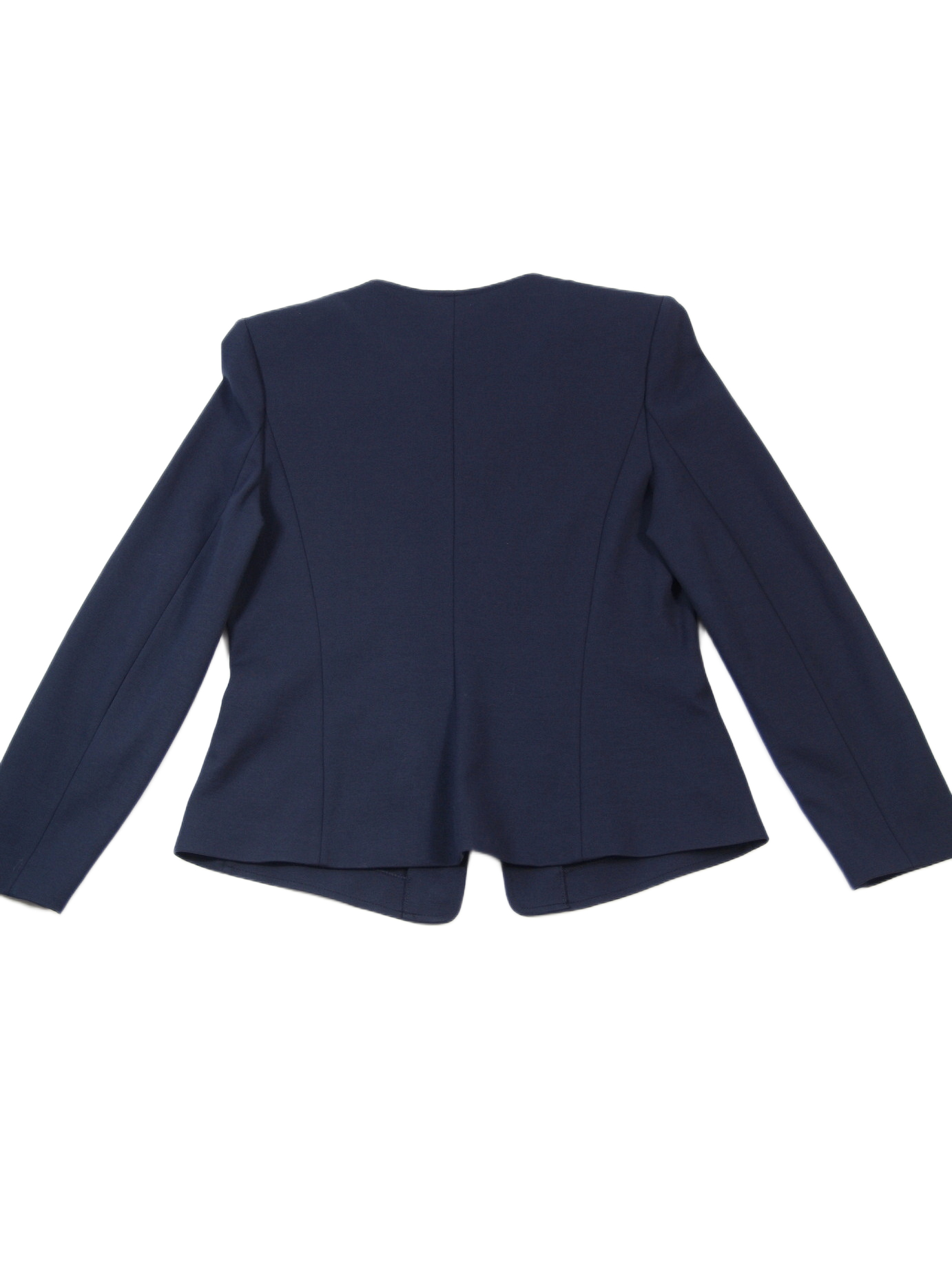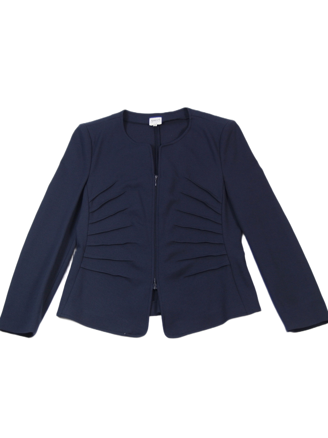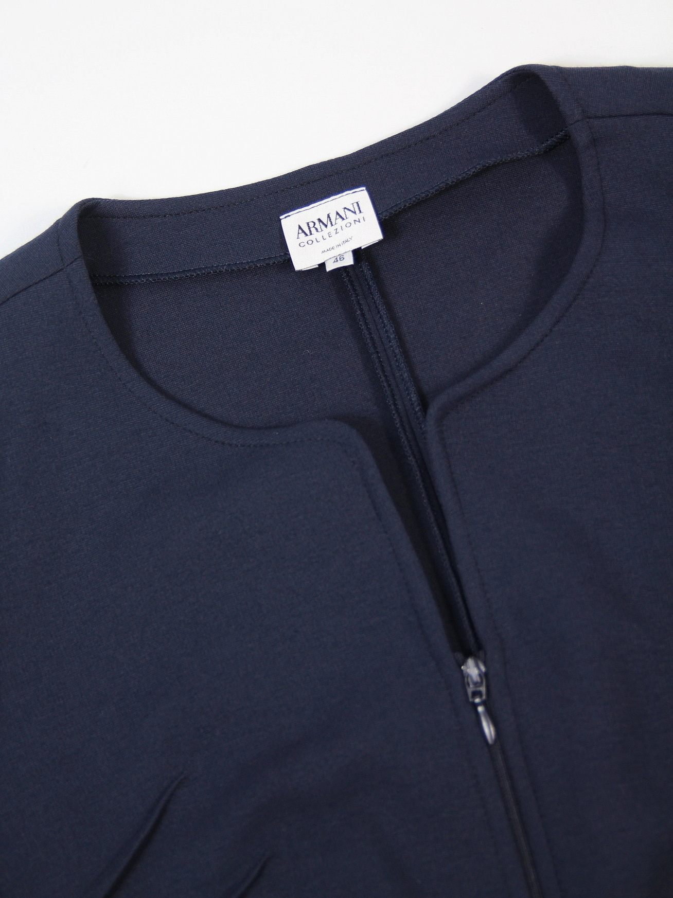 Sacou Armani Collezioni anii 2000, croi cambrat, guler rotunjit, inchidere cu fermoar si detalii de pliuri care contureaza silueta. Impecabil.