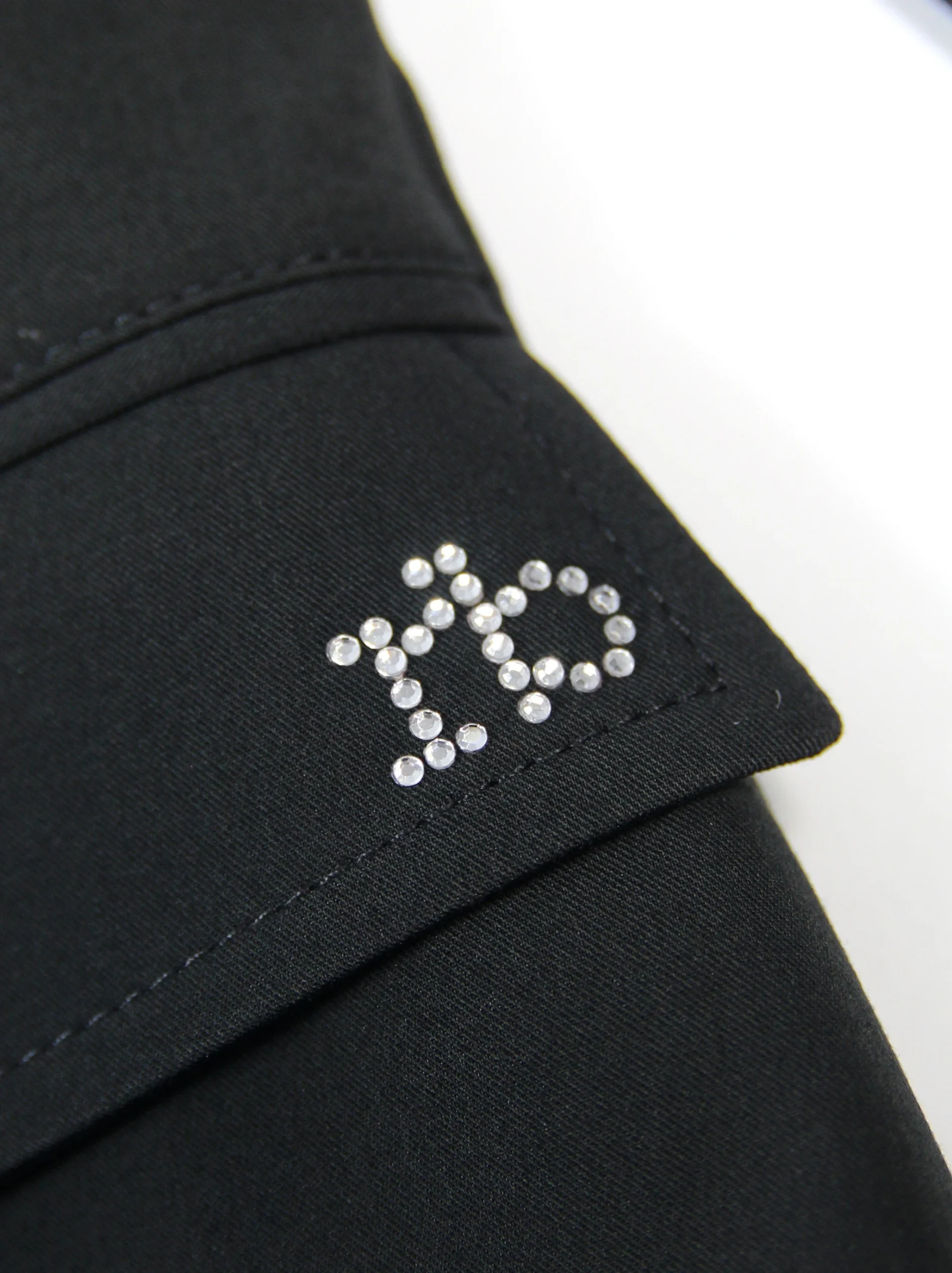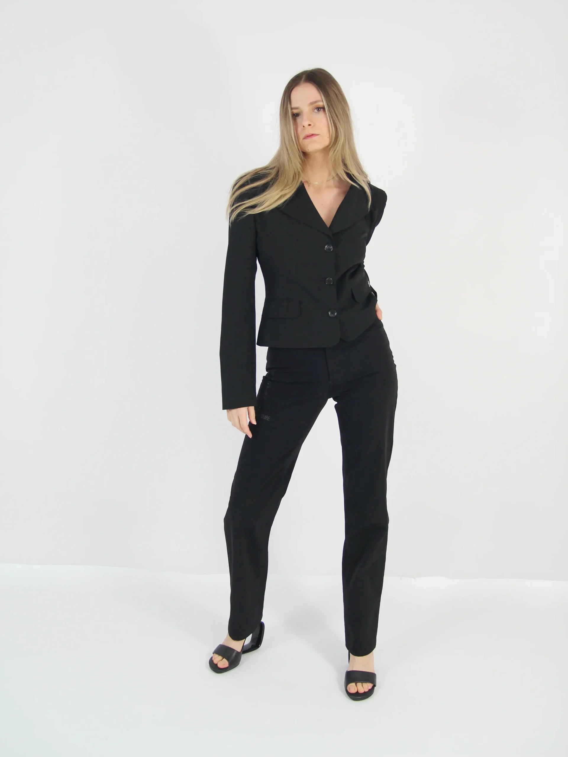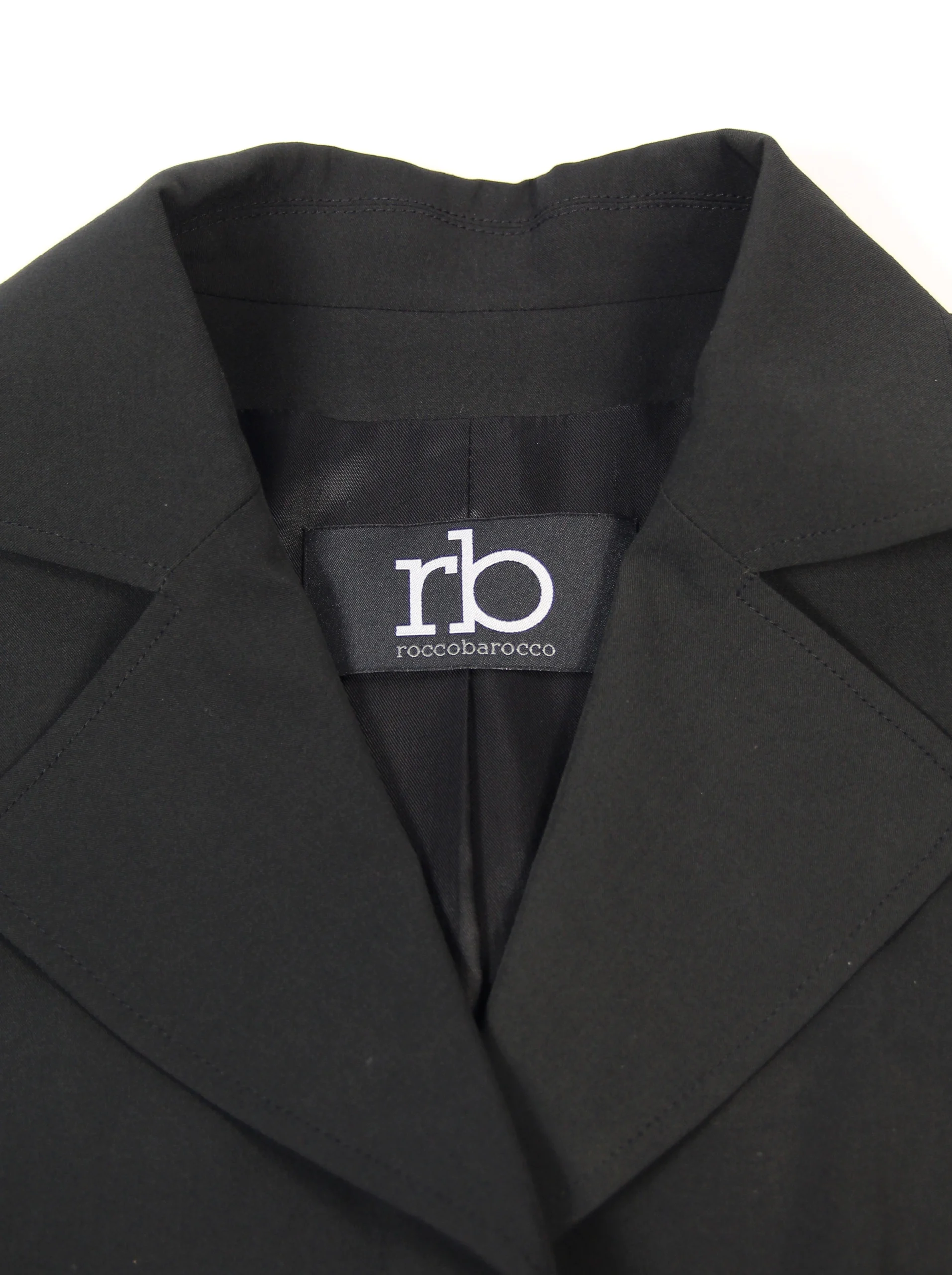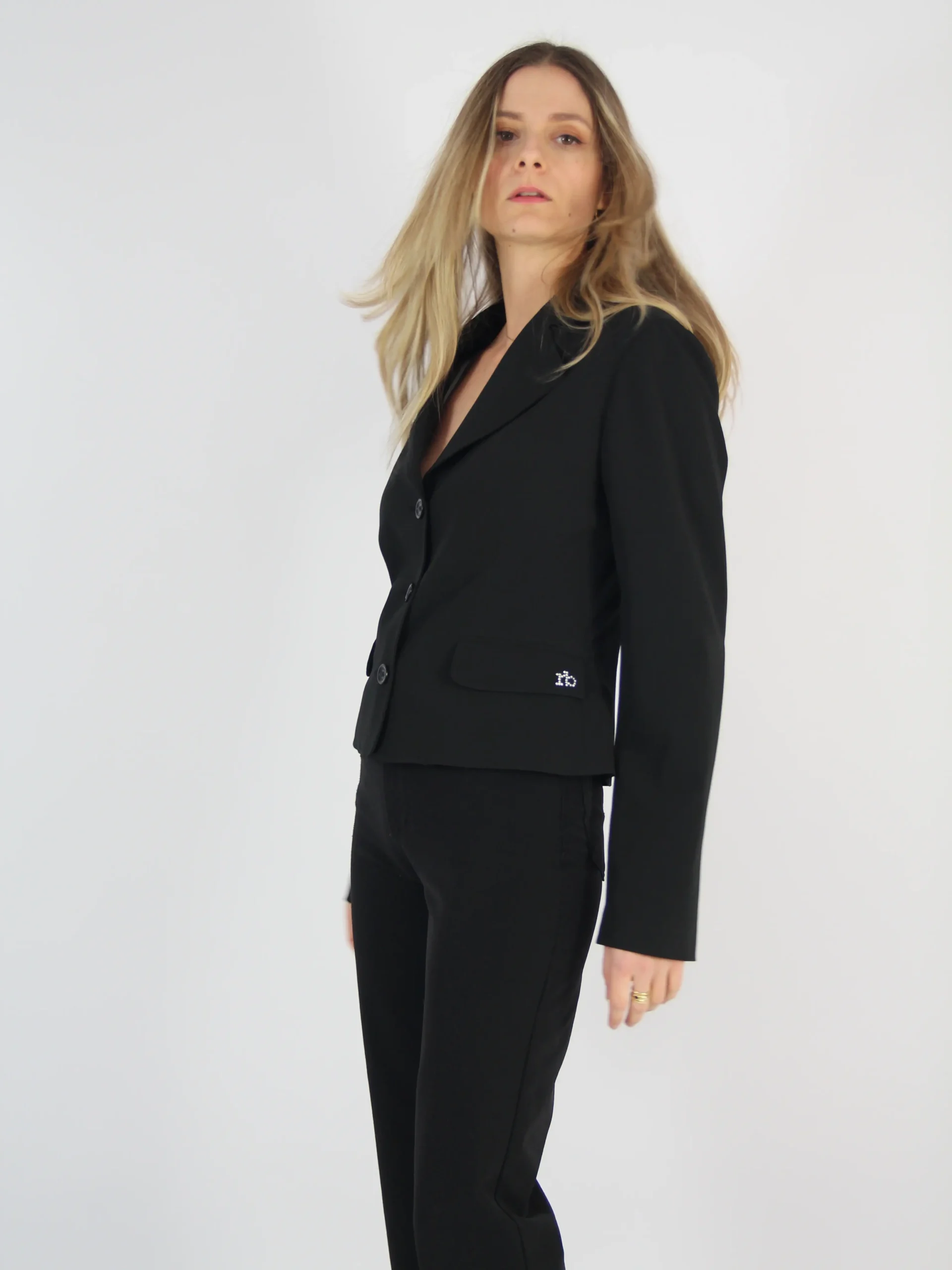 Sacou vintage Roccobarocco cu croi cambrat, design minimalist, cu revere clasice si inchidere frontala cu nasturi. Lungimea usor scurta accentueaza talia, detaliul de logo cu strasuri. Conditie impecabila.