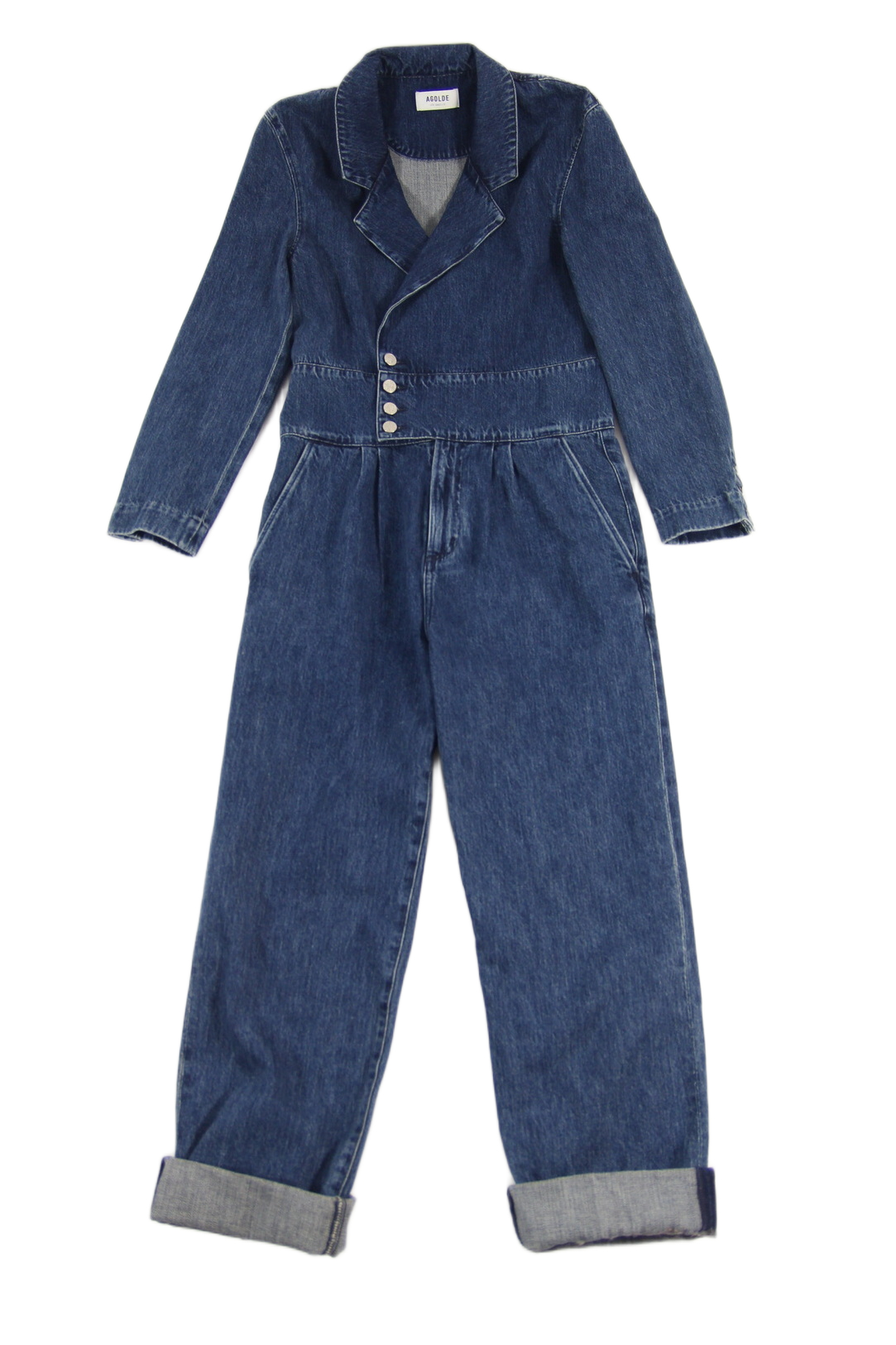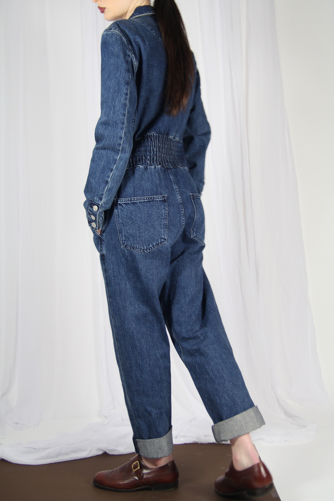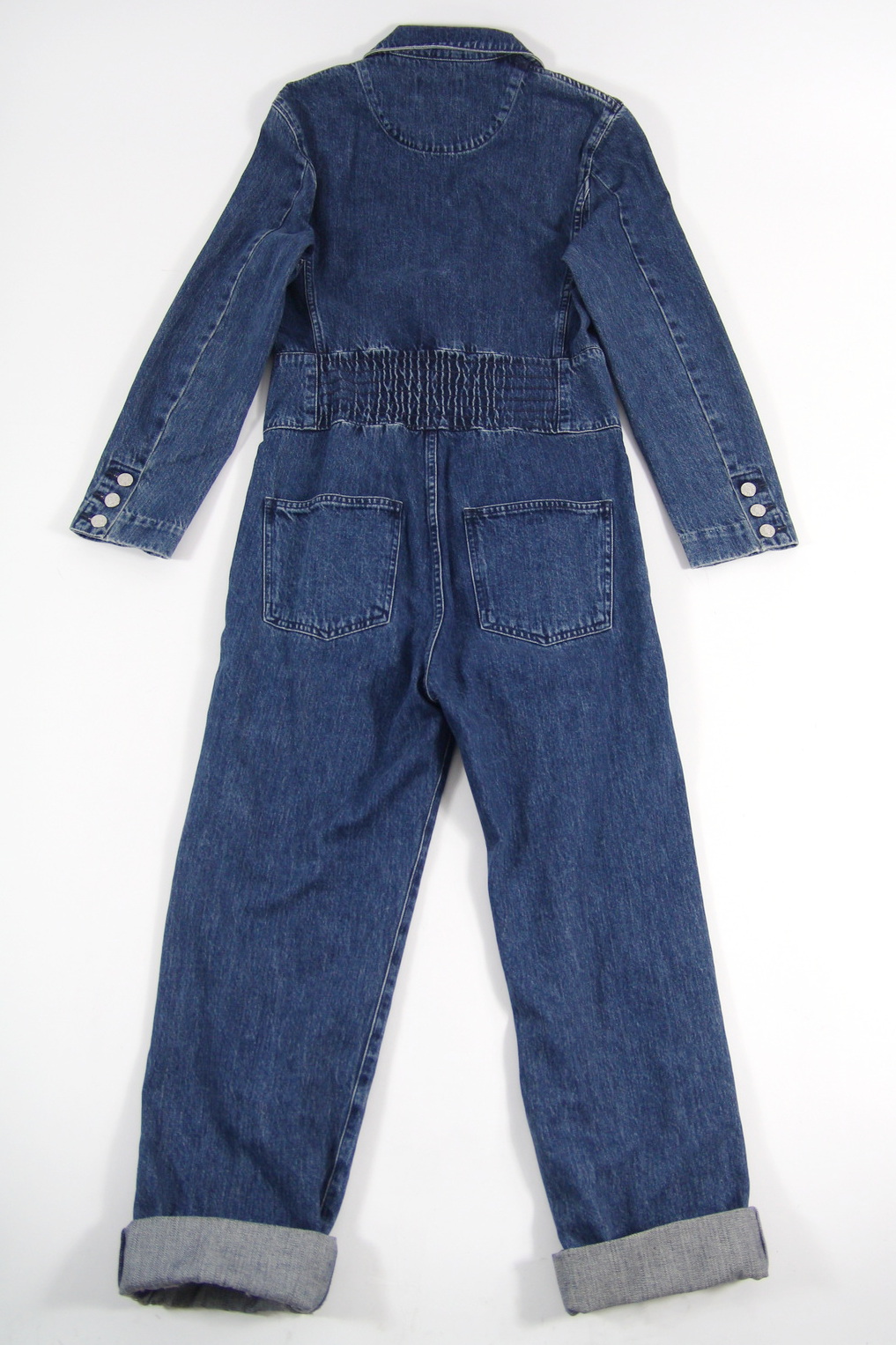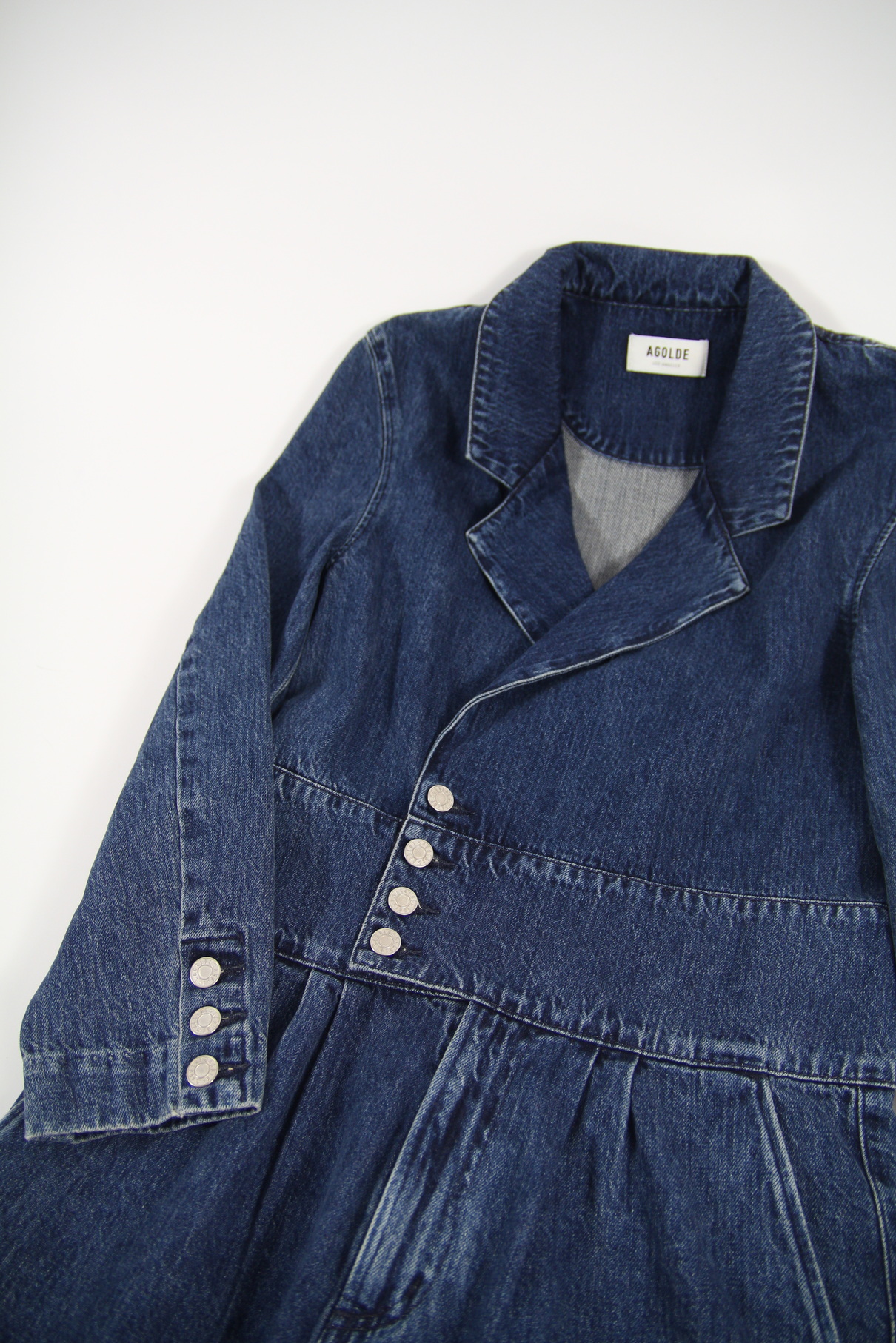 Salopeta Agolde pre-loved din denim, croi lejer, cu guler, talie cu betelie lata si pliuri, inchidere frontala si la maneci cu nasturi metalici in partea de sus si fermoar in partea de jos, elastic la spate.