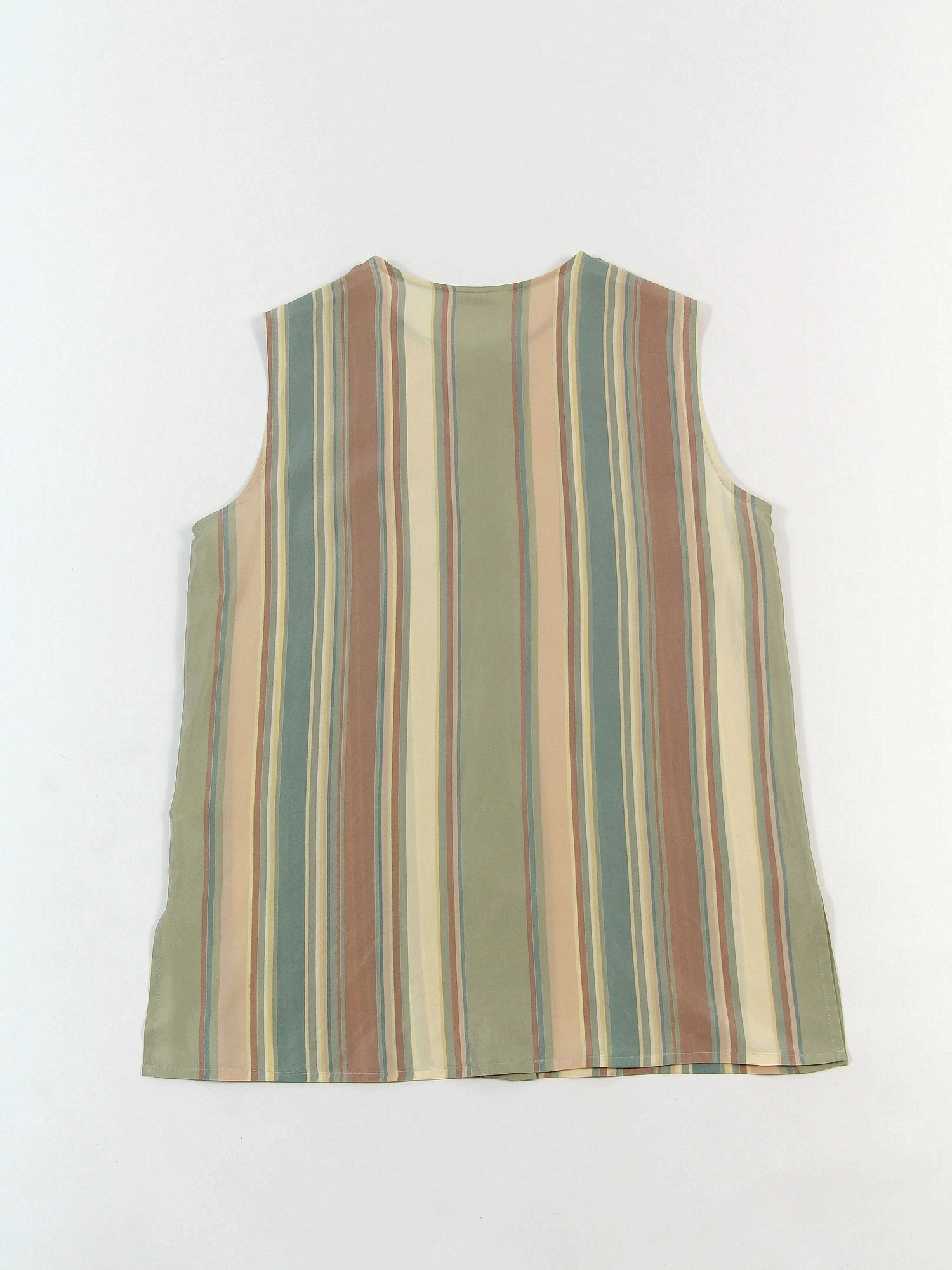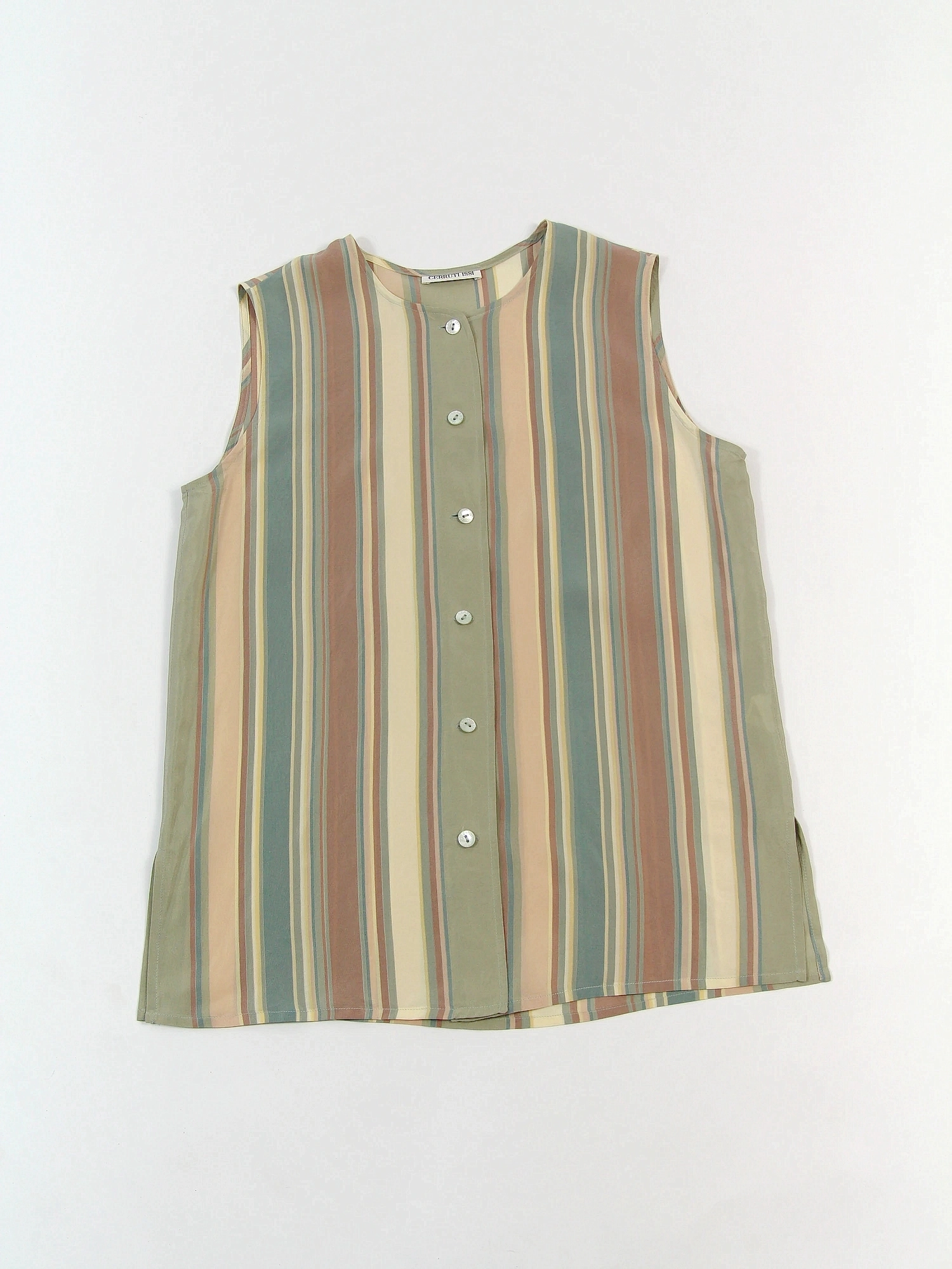 Top vintage Cerruti din matase, cu croi drept si linie minimalista, imprimeu rafinat de dungi verticale in nuante soft de verde salvie, bej si roz prafuit. Decolteu rotund, inchidere frontala cu nasturi si constructie fara maneci. Conditie impecabila.