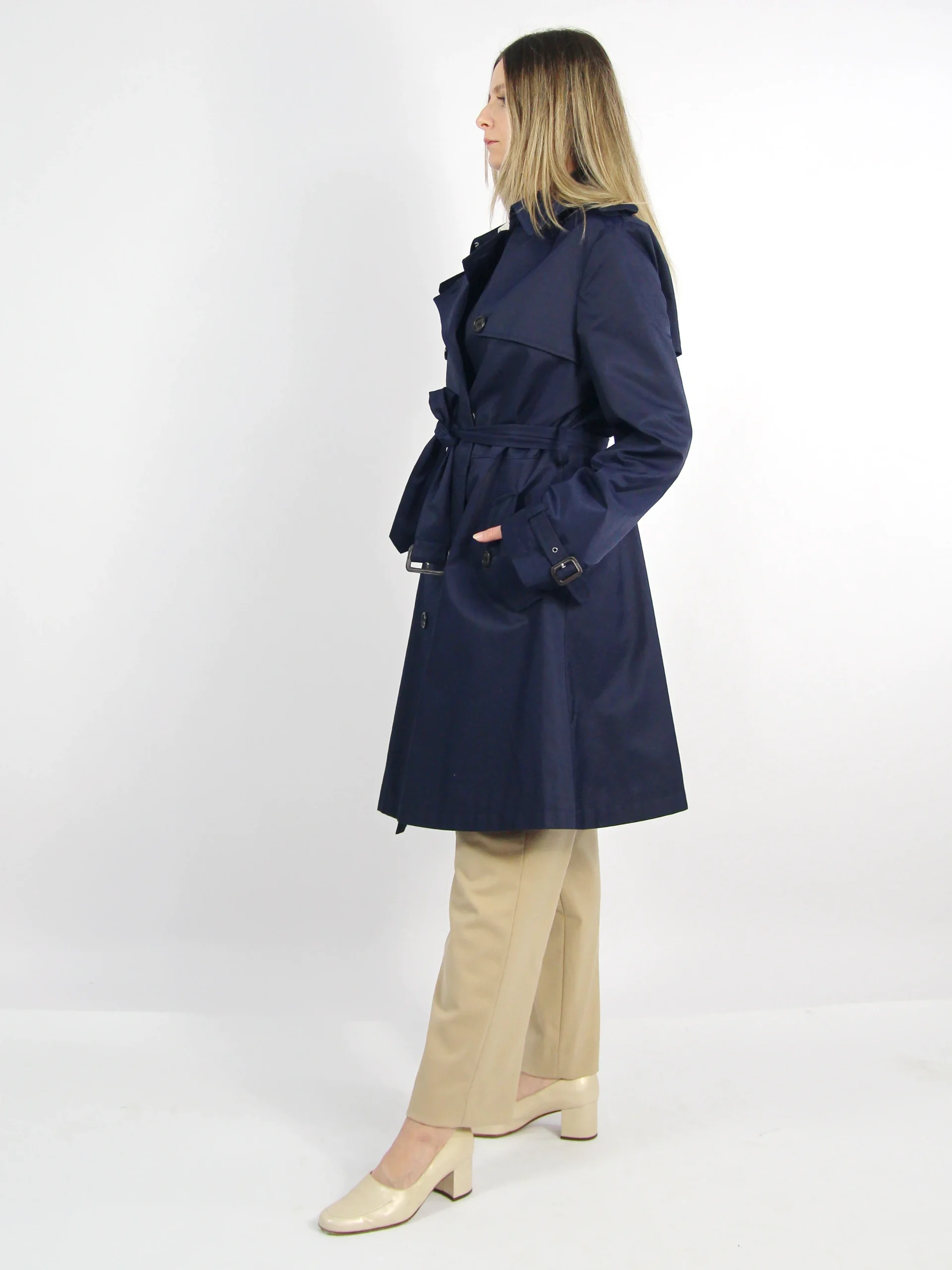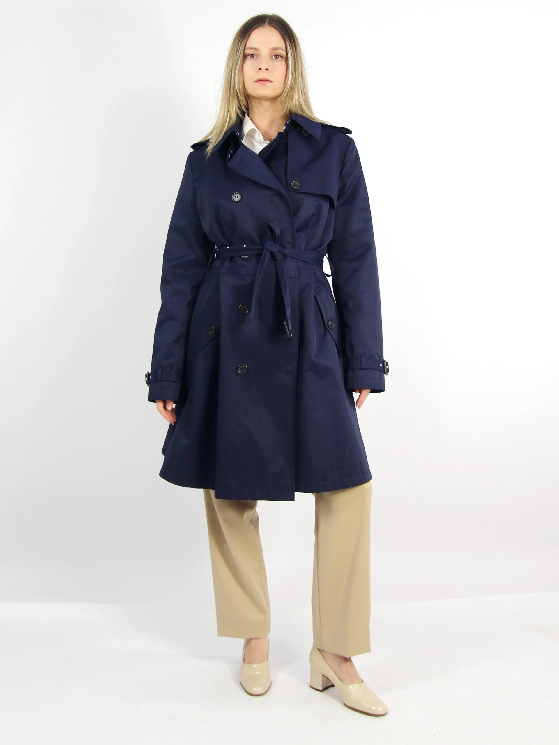 Trench Ralph Lauren navy cu croi usor evazat, clasic, talie marcata prin cordon si inchidere frontala cu nasturi. Detalii utilitare de epoleti, curele la maneci si buzunare. Interiorul contrastant, cu print equestrian signature Ralph Lauren. Conditie impecabila